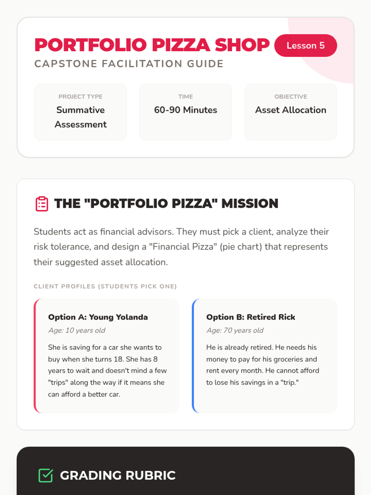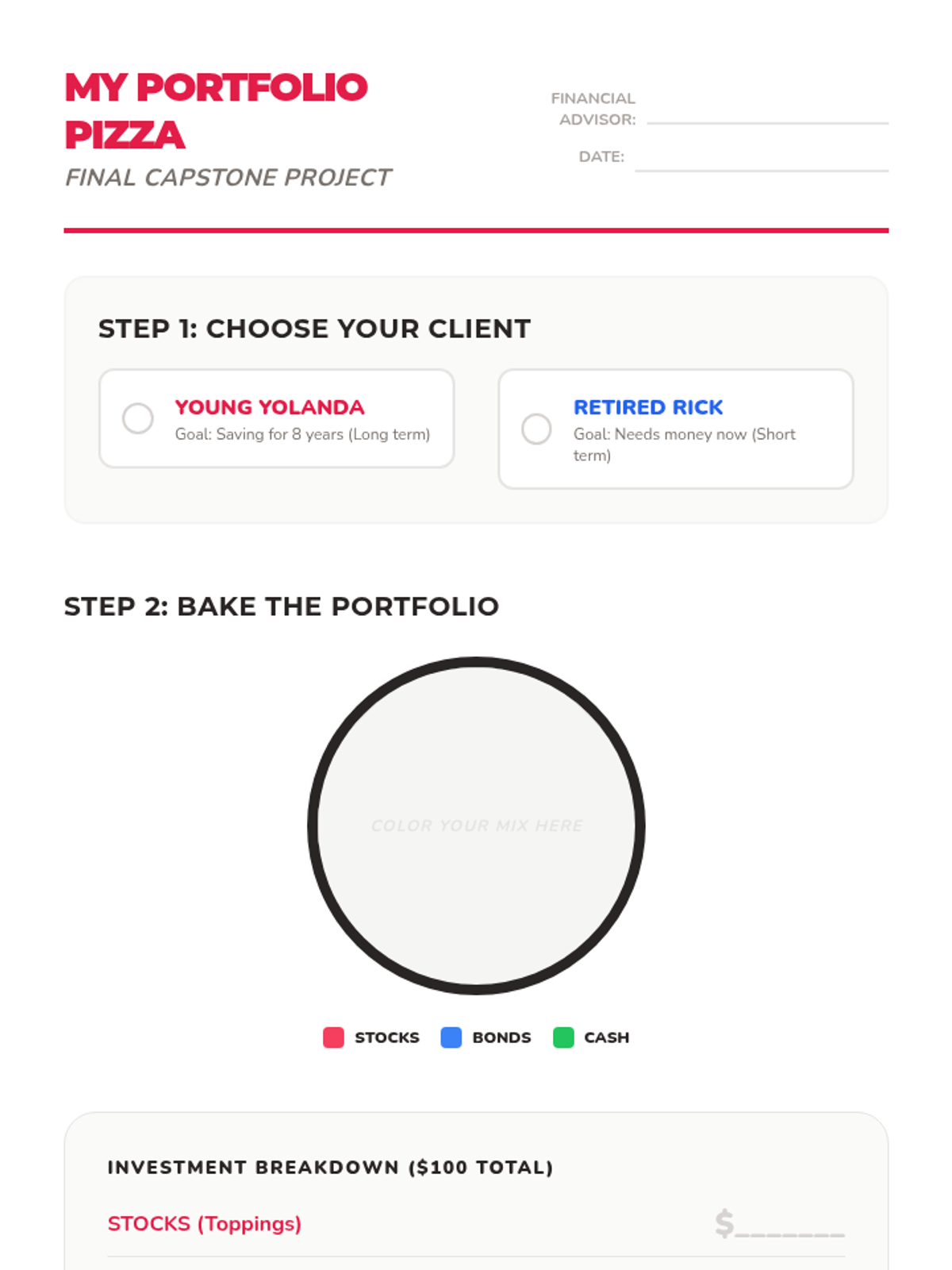 In this capstone project, students apply their knowledge to design a balanced asset allocation (a 'Pizza Portfolio') based on specific financial goals and risk tolerances.