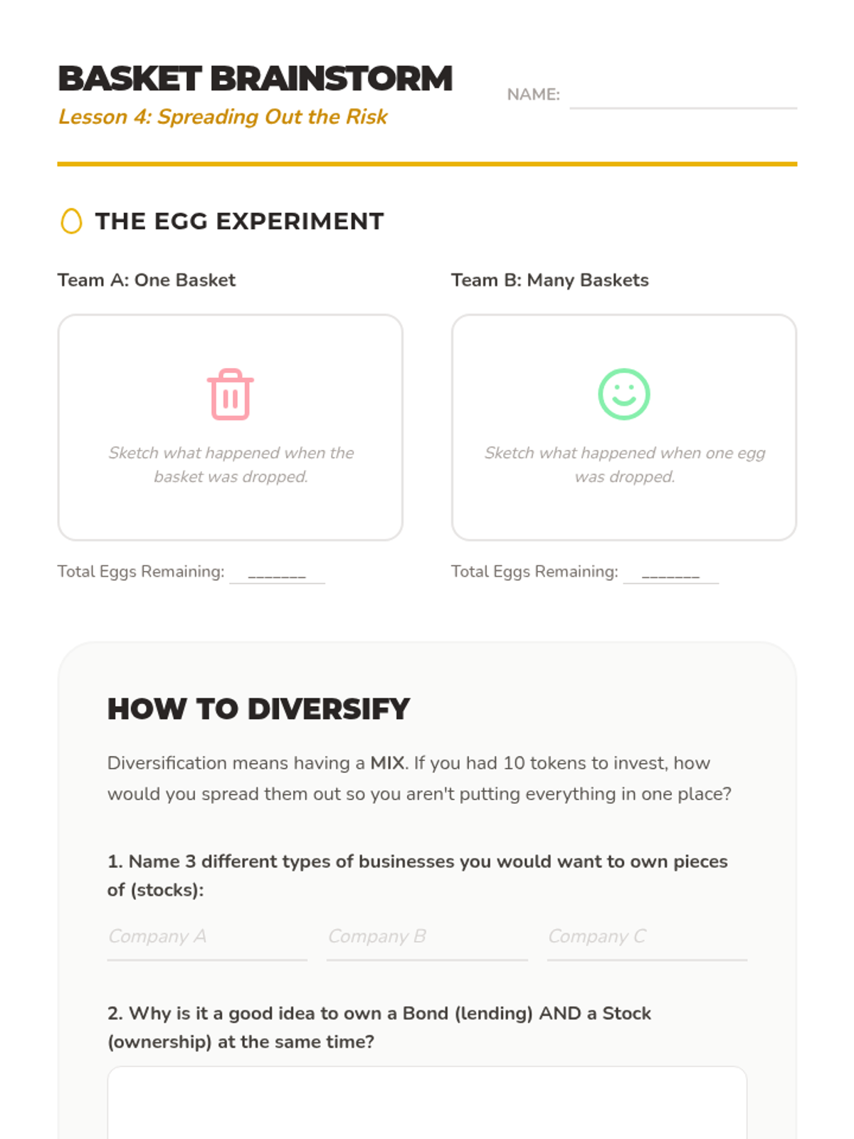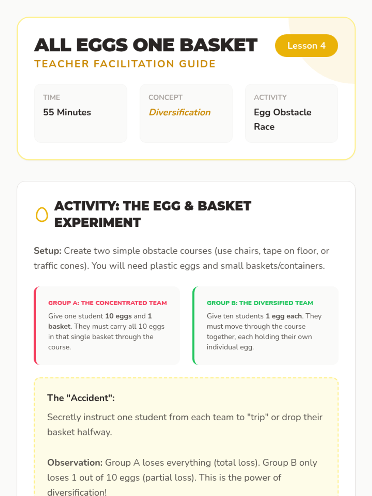 Through a physical metaphor of carrying eggs, students discover diversification and how spreading investments across different 'baskets' reduces risk.