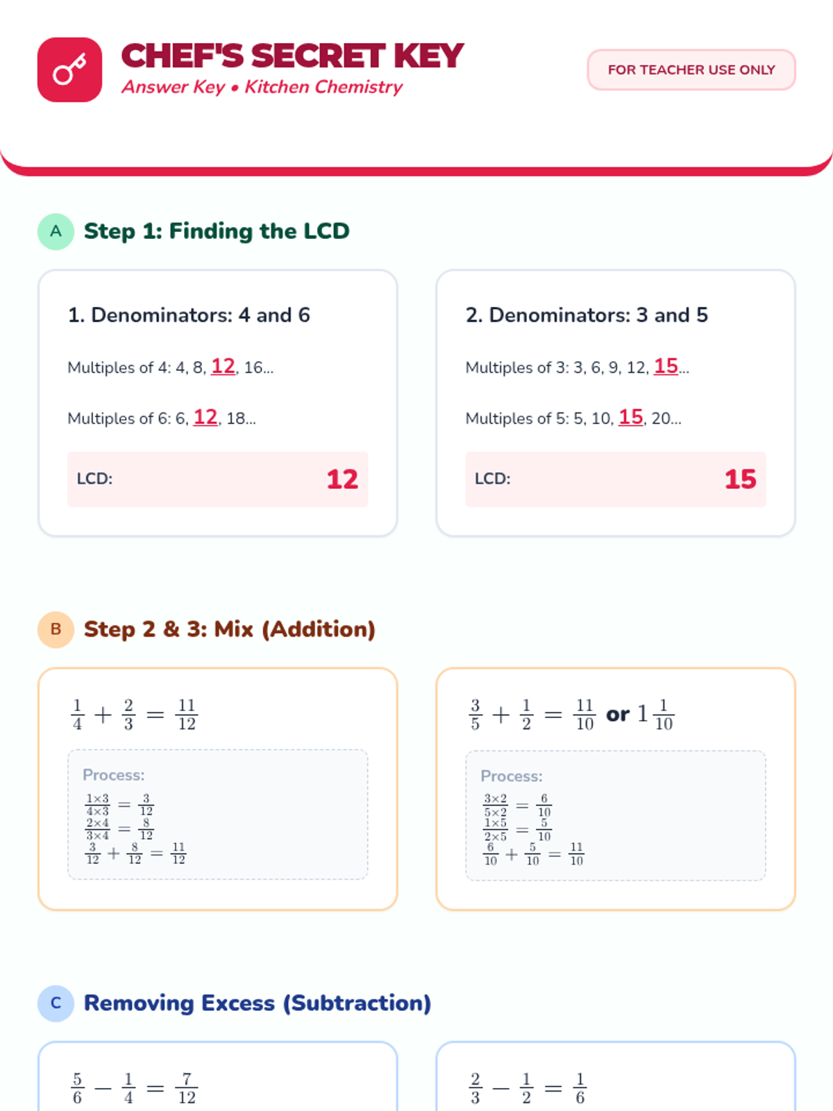 A lesson focused on adding and subtracting proper and improper fractions by identifying the least common denominator. Includes a progress monitoring worksheet and a detailed teacher answer key.