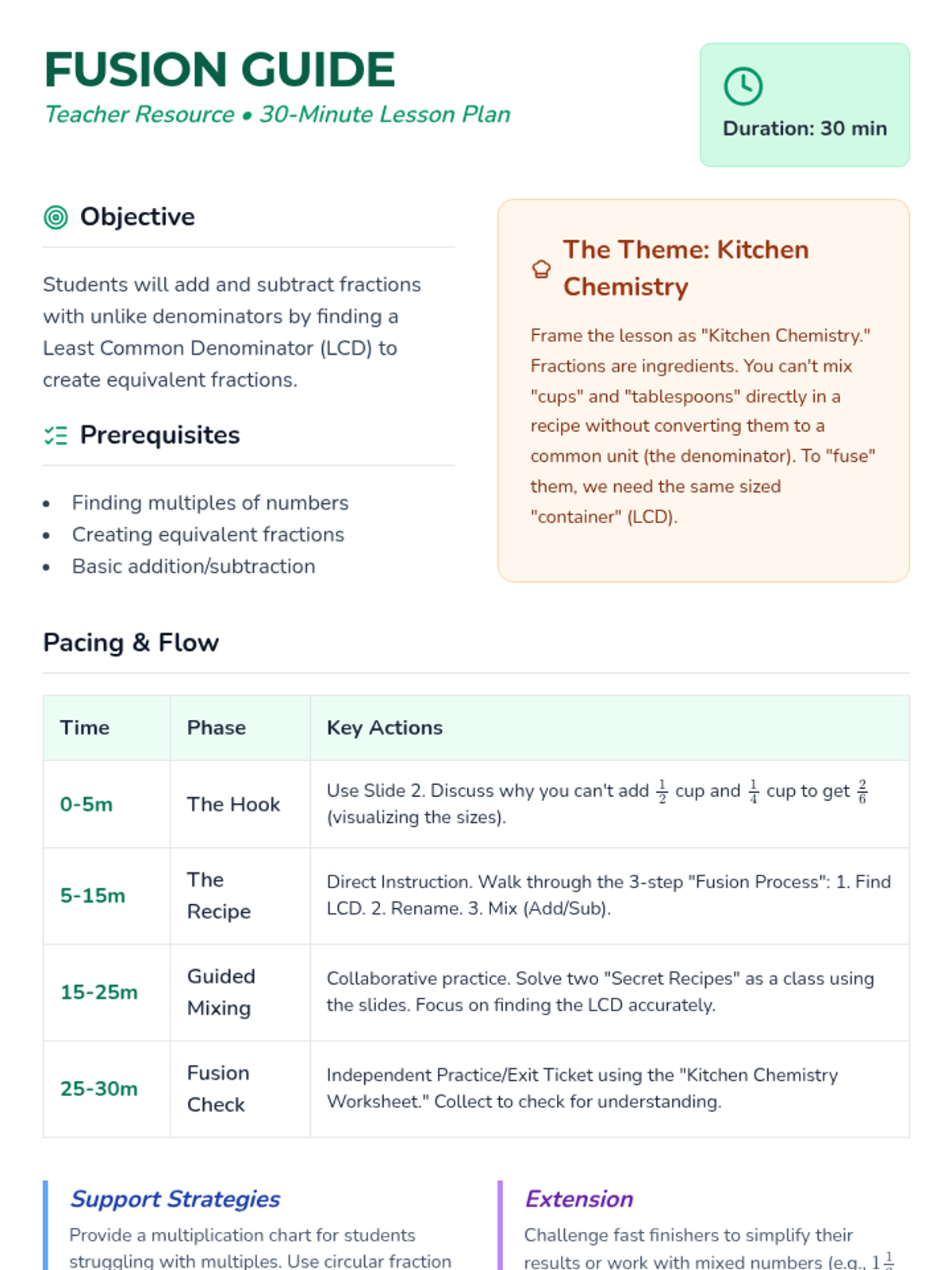 A lesson focused on adding and subtracting fractions with unlike denominators using a structural 'blueprint' approach. Students use step-by-step assembly guides and visual area models to understand common denominators.