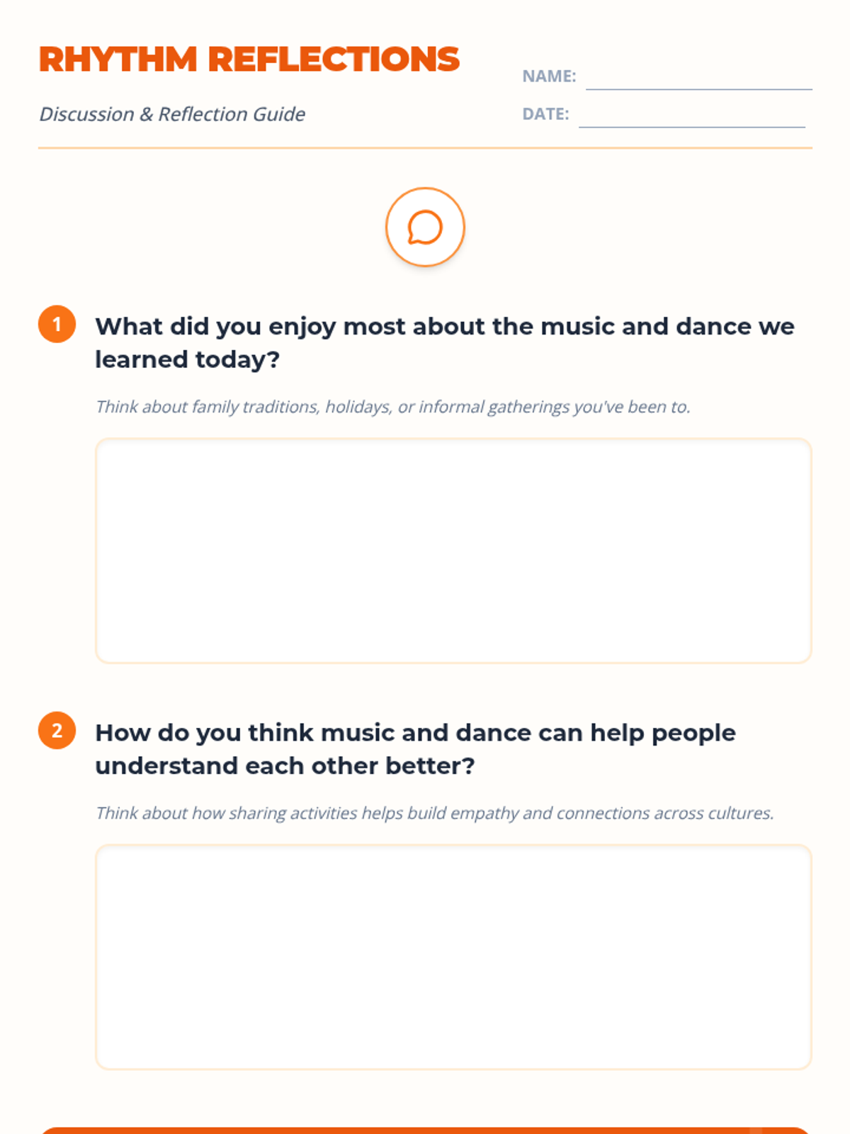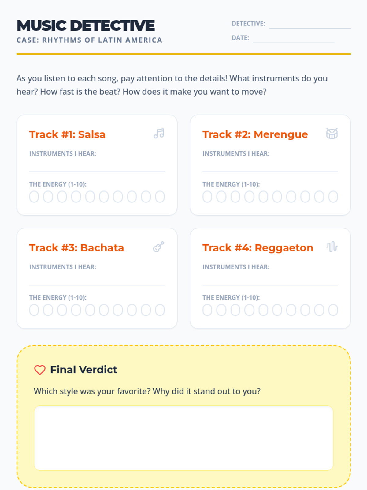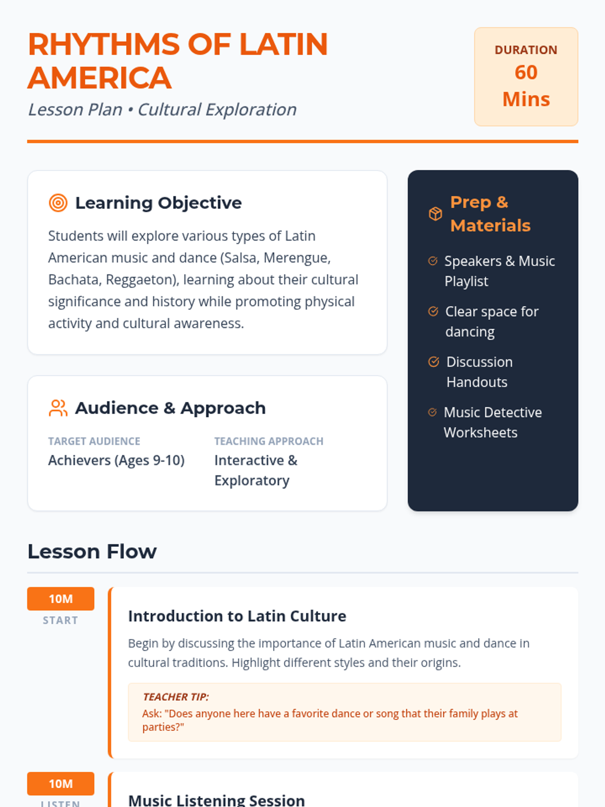 A 1-hour cultural exploration of Latin American music and dance, focusing on genres like Salsa, Merengue, and Bachata. Students learn basic dance steps and discuss the role of music in expressing cultural identity.