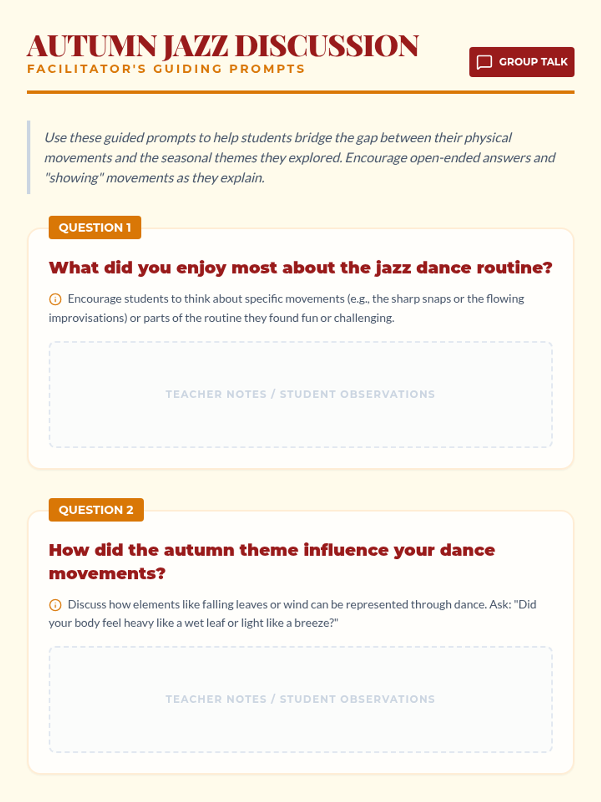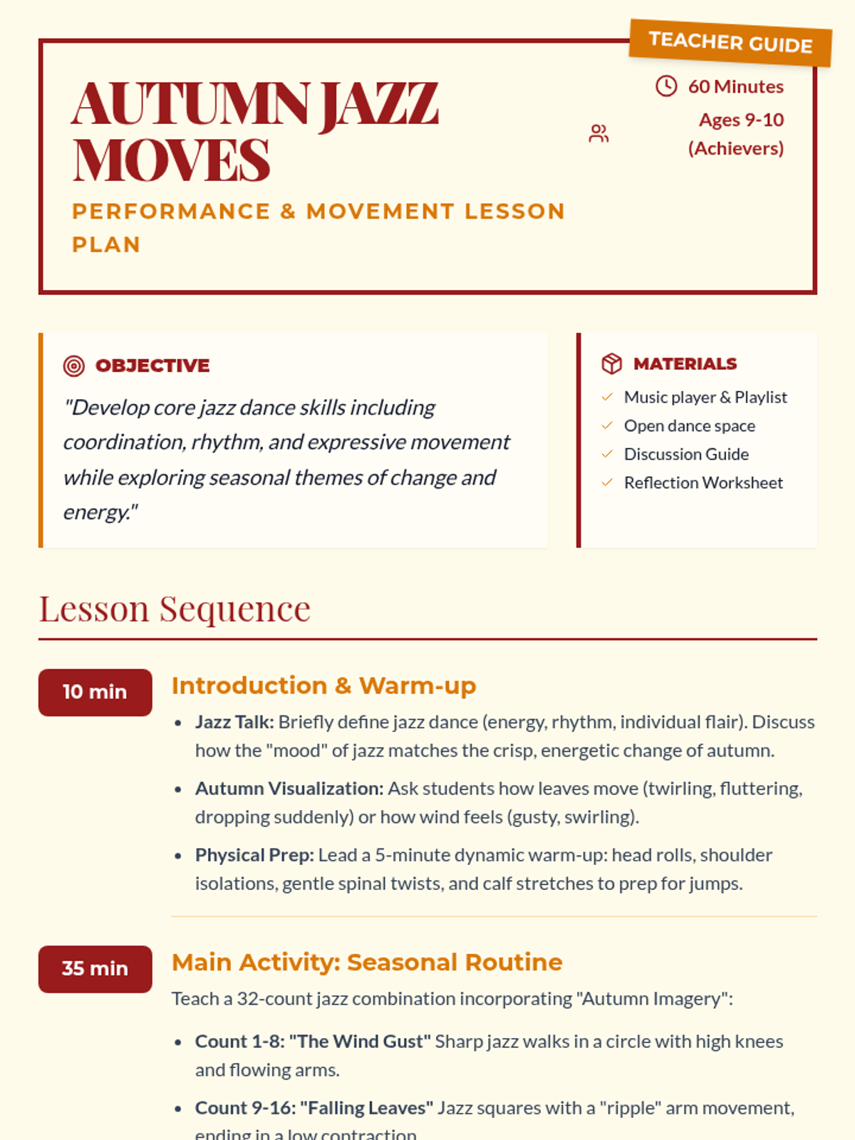 Students will explore jazz dance techniques with a seasonal twist, focusing on the energy and vibrancy of autumn through movement, coordination, and creative expression.