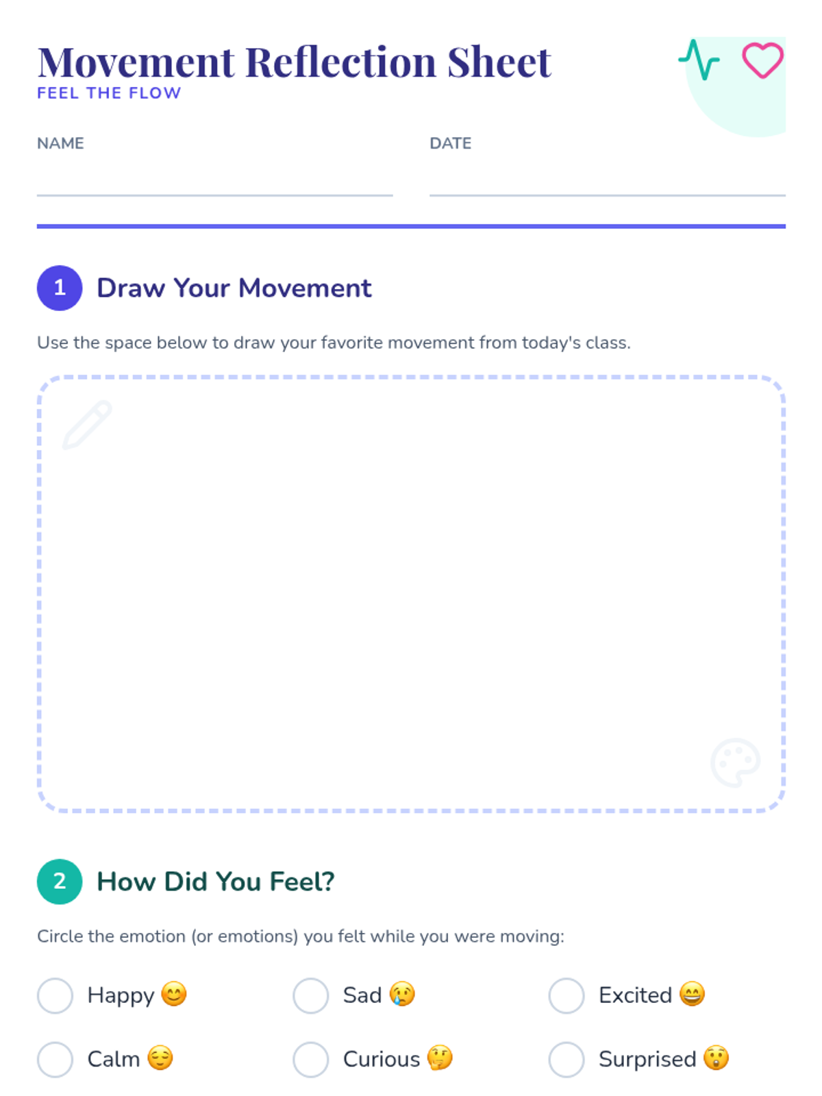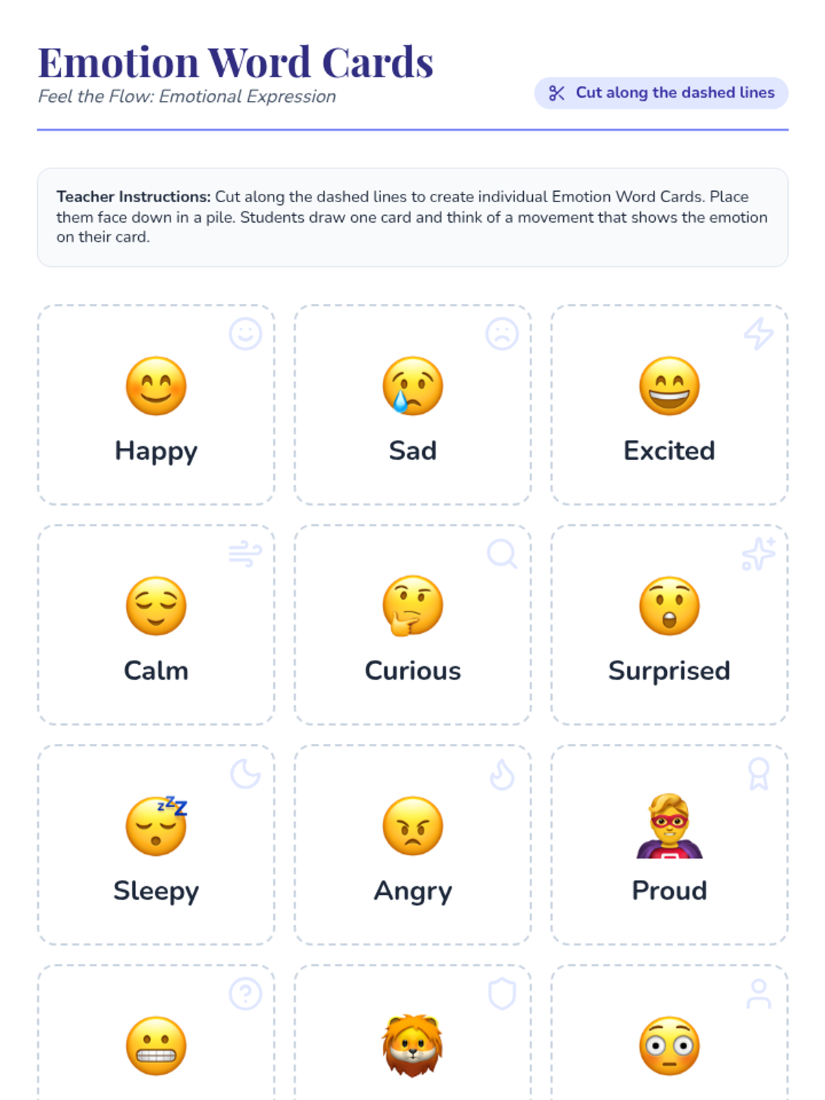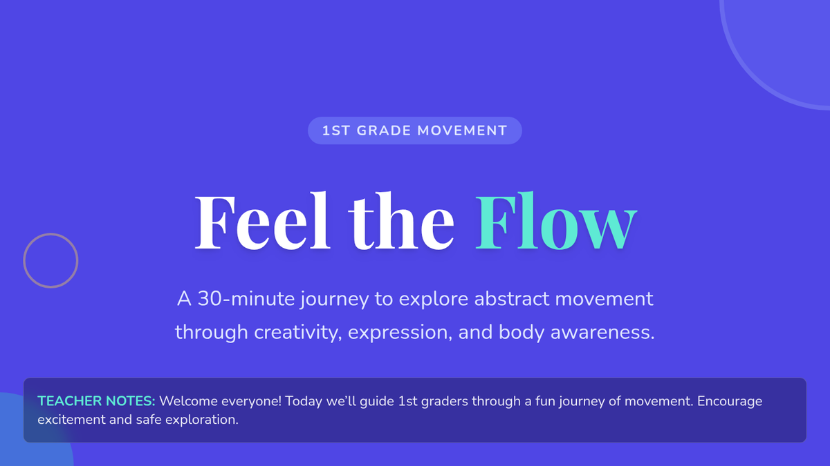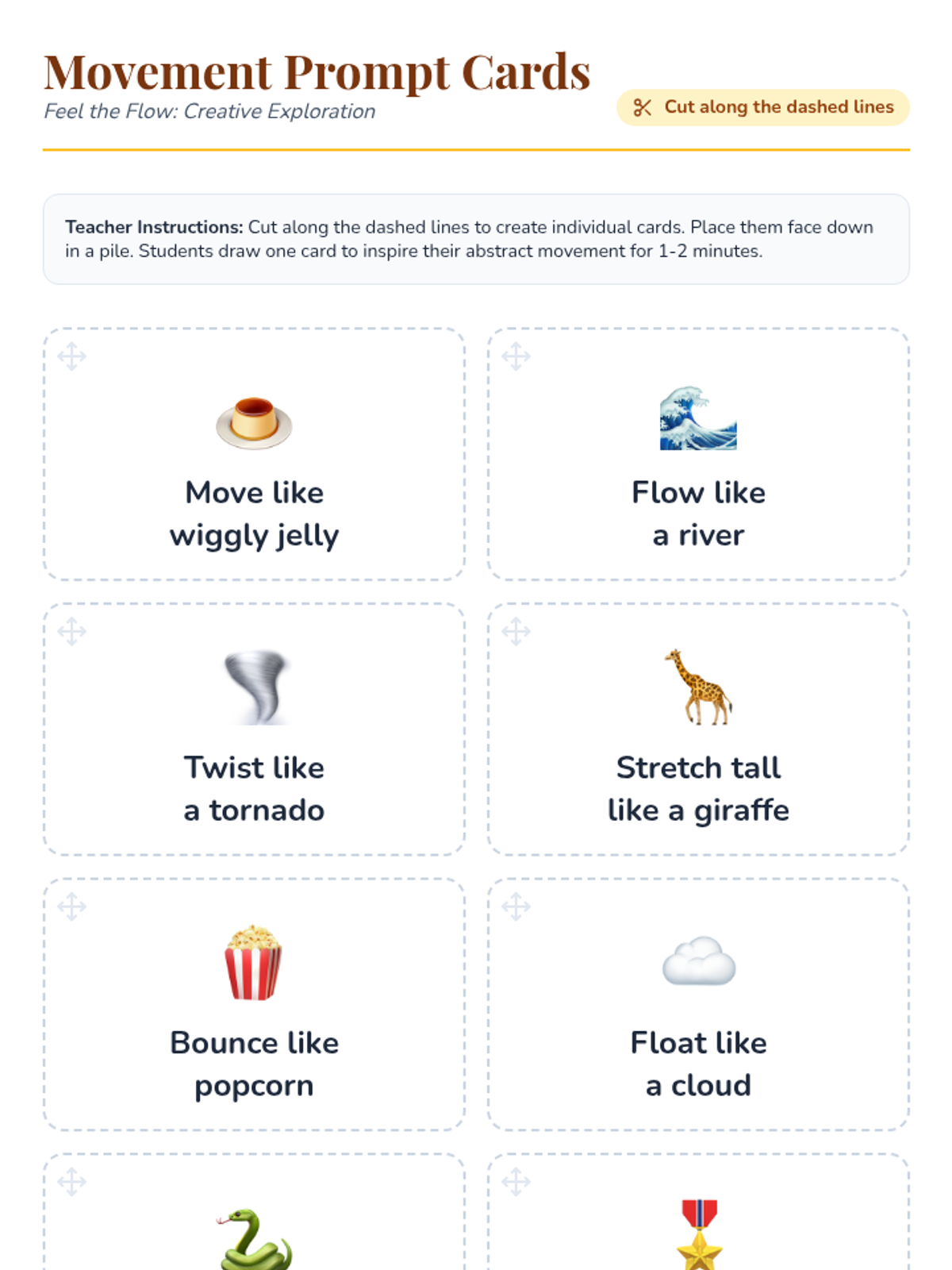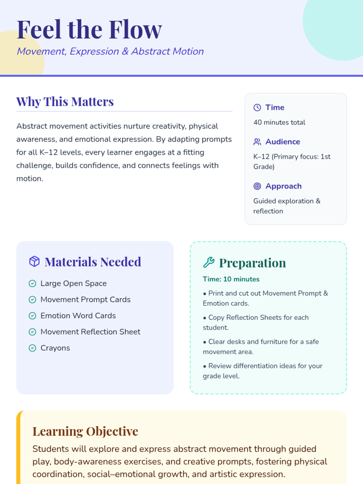 A 30-minute creative movement lesson for 1st graders (adaptable for K-12) that explores abstract motion, body awareness, and emotional expression. Students use prompts and emotion cards to express themselves through movement and reflect on their experience.