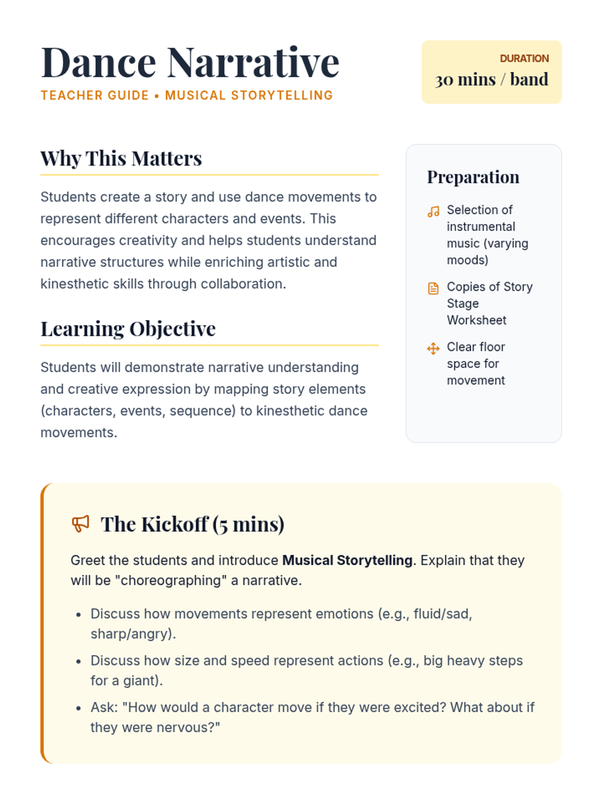 Students explore the relationship between rhythmic patterns, tempo, and dramatic arcs, mapping how drum beats signal conflict and resolution in dance.