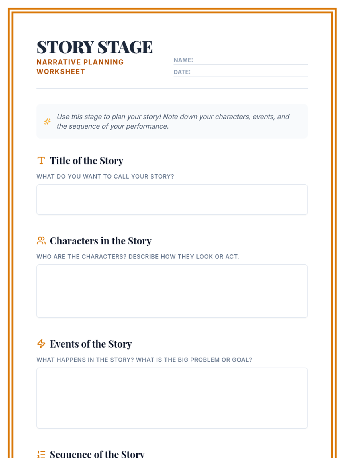 Students will create a story and use dance movements to represent characters and events, enhancing their understanding of narrative structure and kinesthetic expression across K-12 grade levels.
