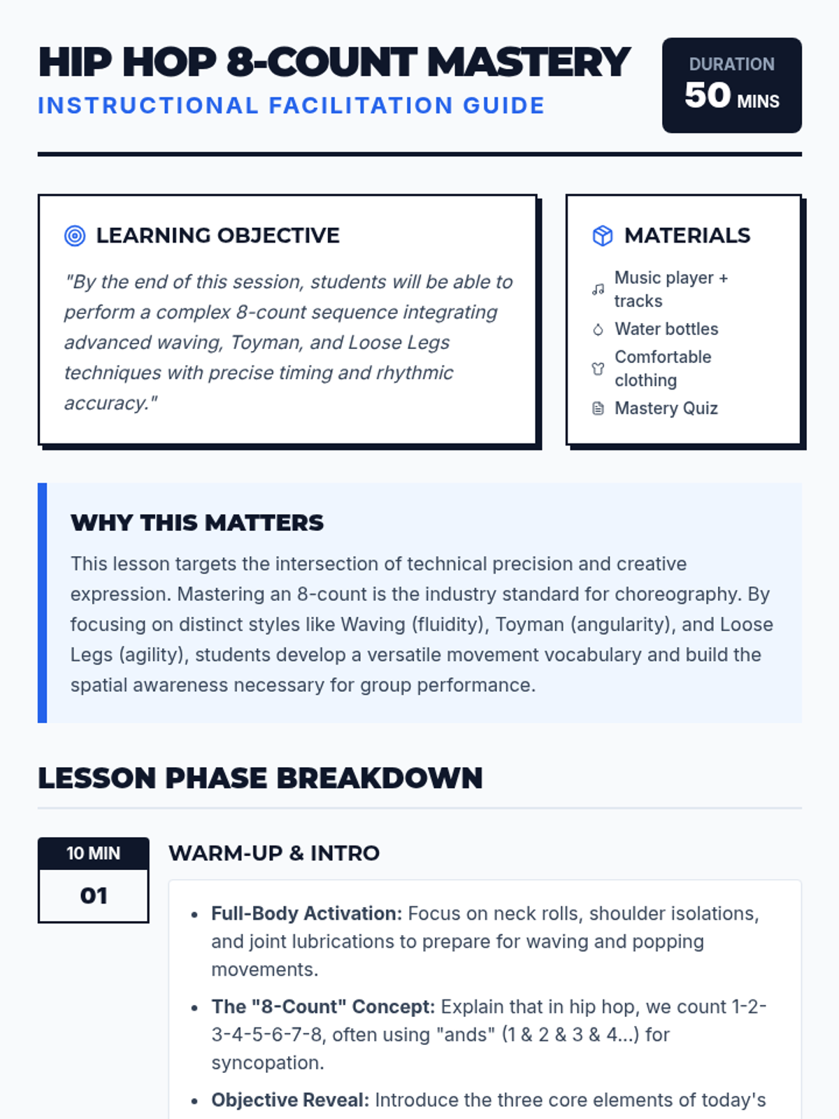 A high-energy lesson focused on mastering an 8-count hip hop sequence featuring advanced waving, Toyman, and Loose Legs techniques.