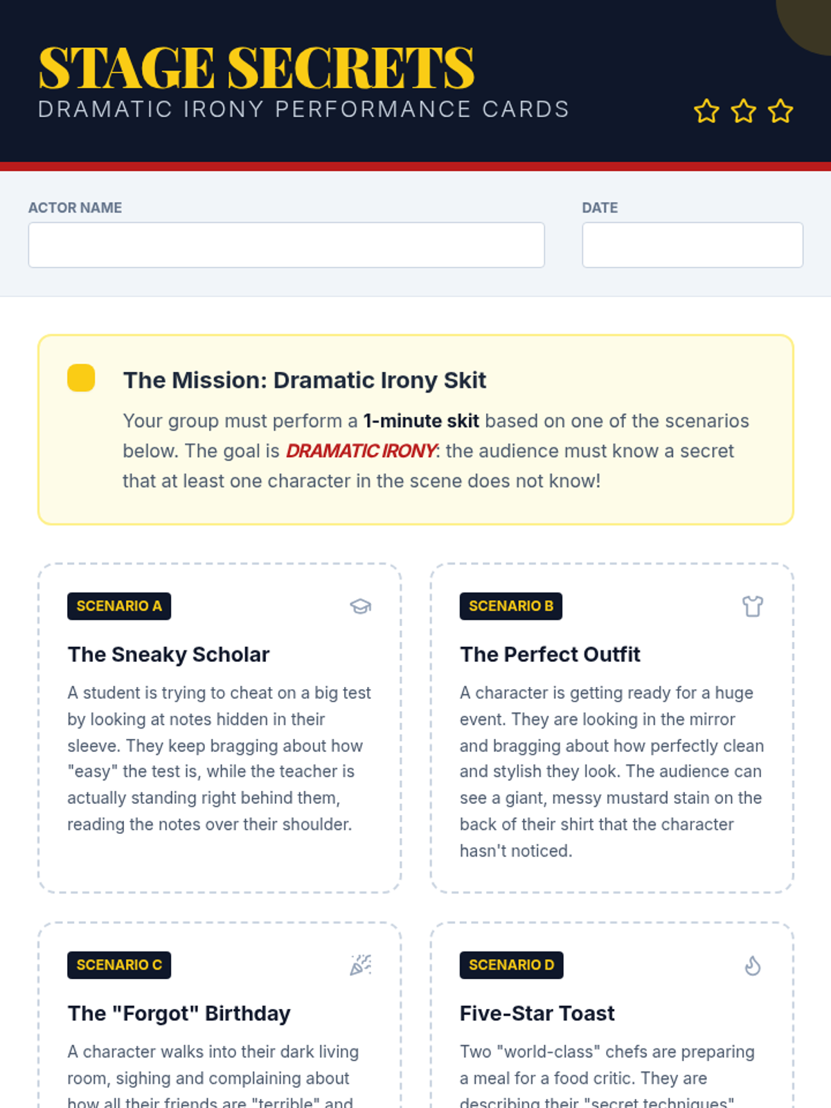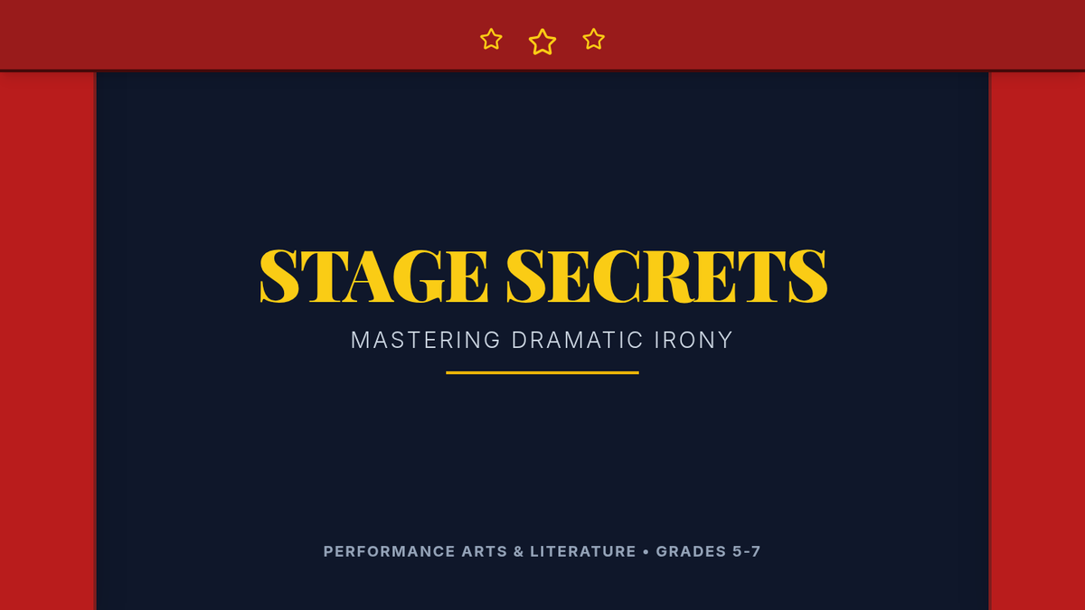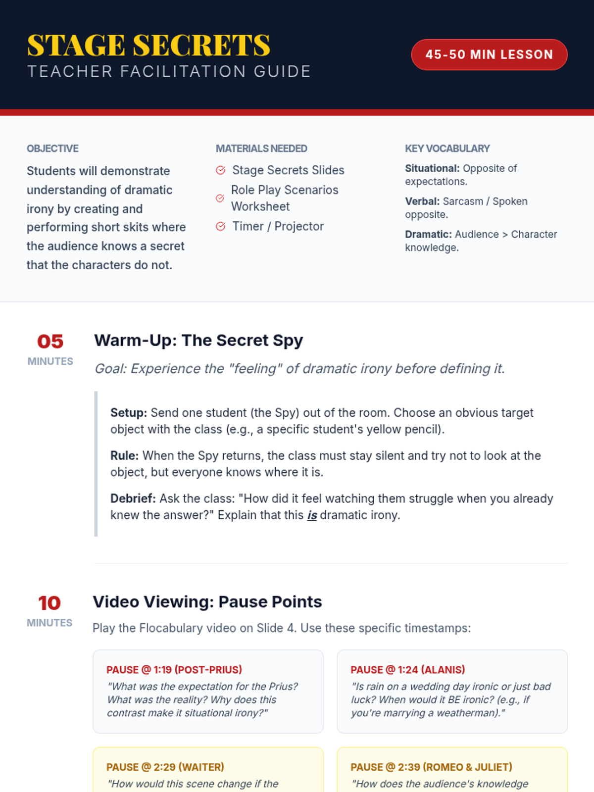 Students explore the concept of dramatic irony through a theater-themed lesson featuring a video analysis, a participatory 'Secret Spy' warm-up, and the creation of original short skits where the audience knows a secret that the characters do not.