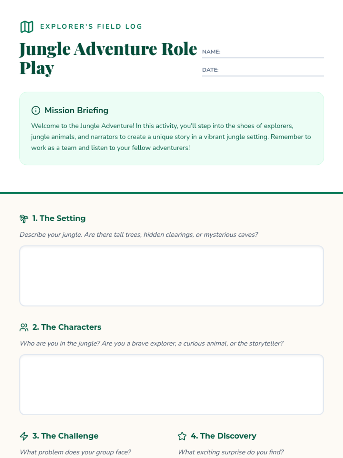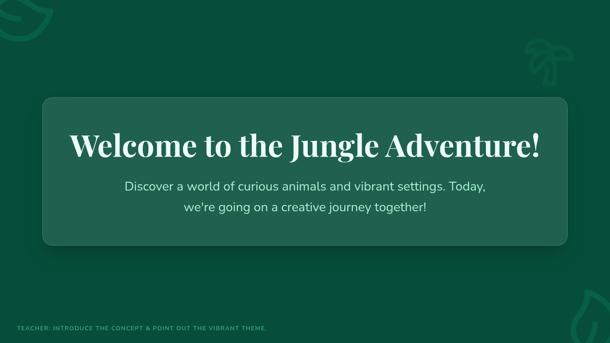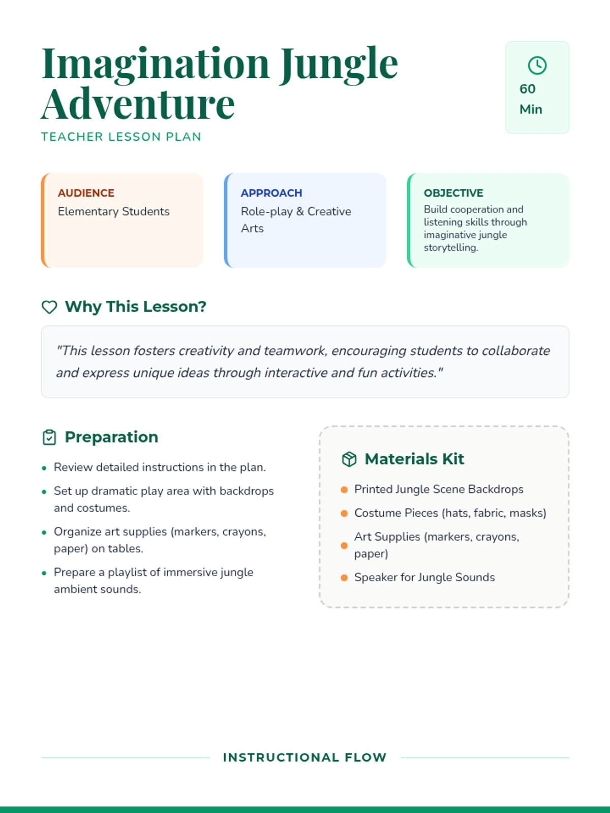 An interactive elementary lesson where students explore a vibrant jungle through dramatic play and creative arts, fostering teamwork and imaginative storytelling.