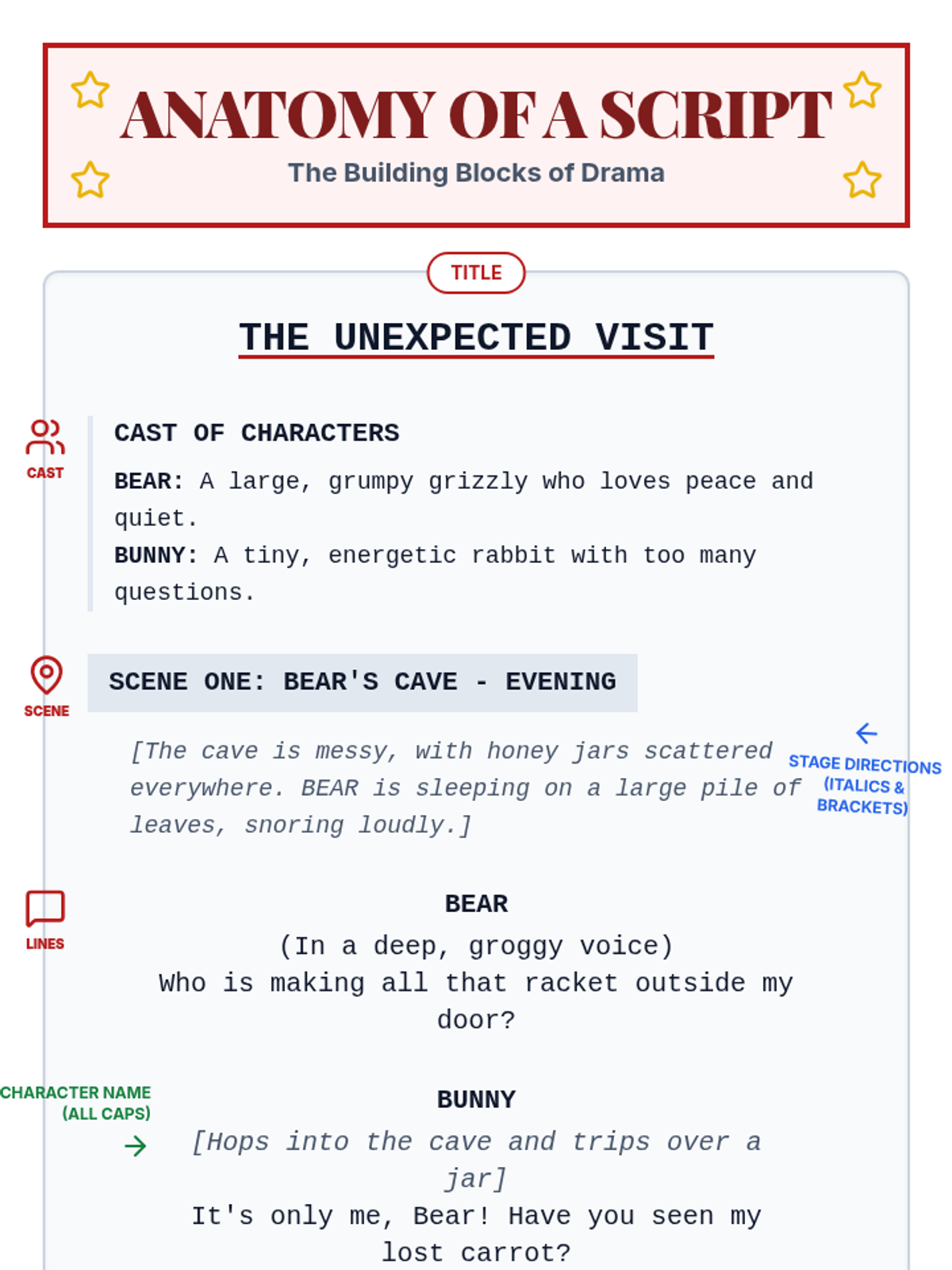 Students will dive into the world of theater by identifying the key structural elements of a play script, including character names, dialogue, and stage directions, through a hands-on 'Script Scramble' activity and a video comparison of 'Matilda'.