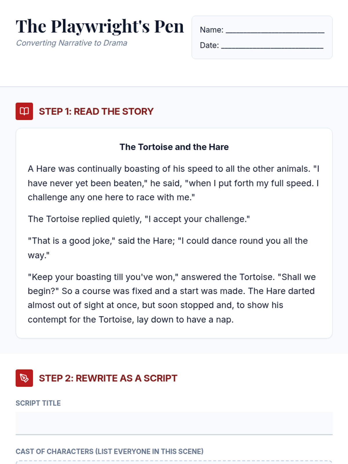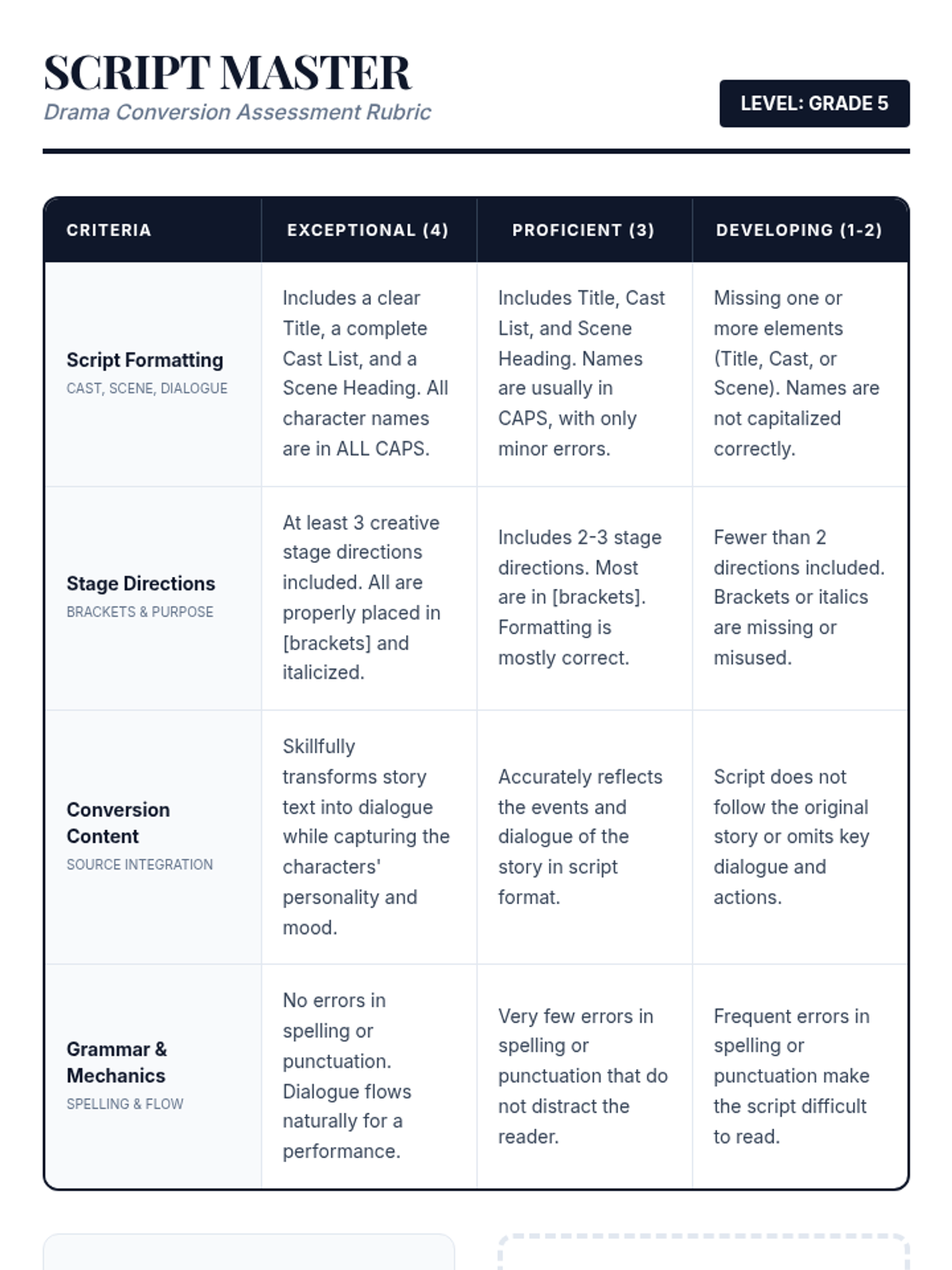 A 5th-grade lesson on converting narrative text into drama scripts, focusing on the visual conventions of playwriting including cast lists, scene headings, and stage directions.