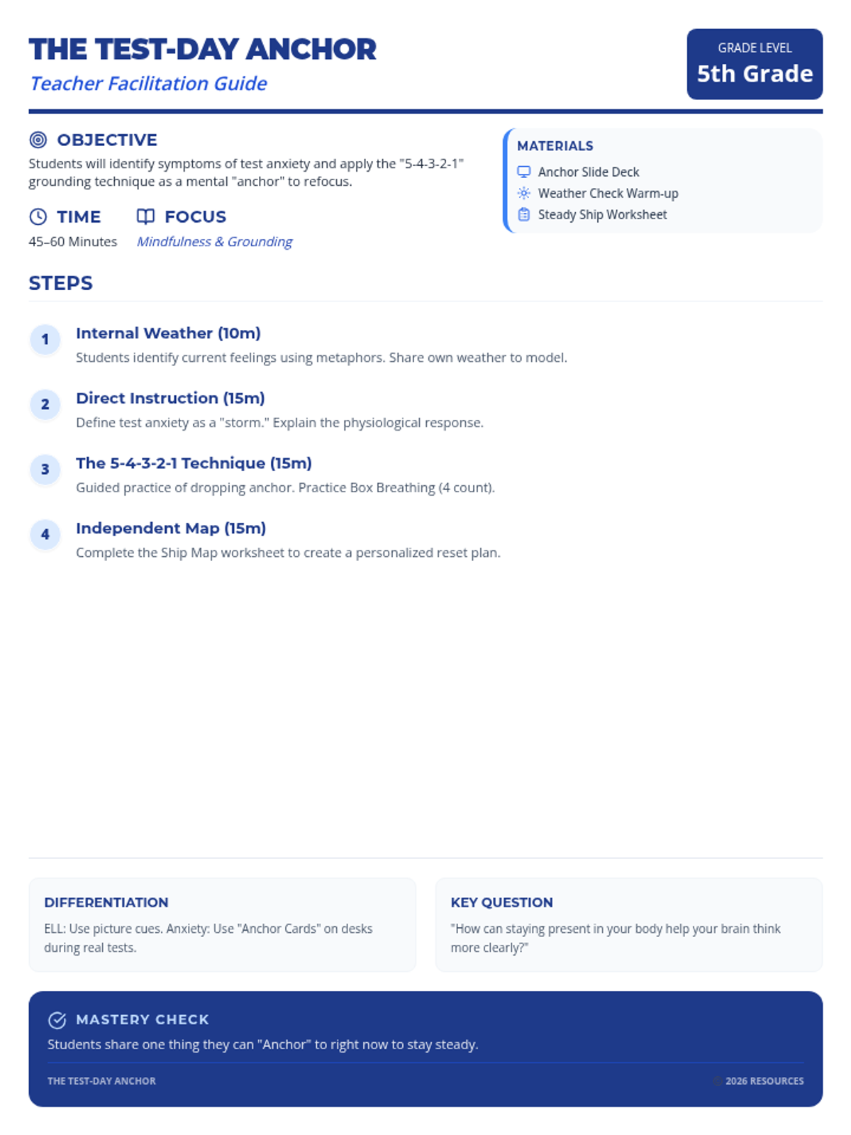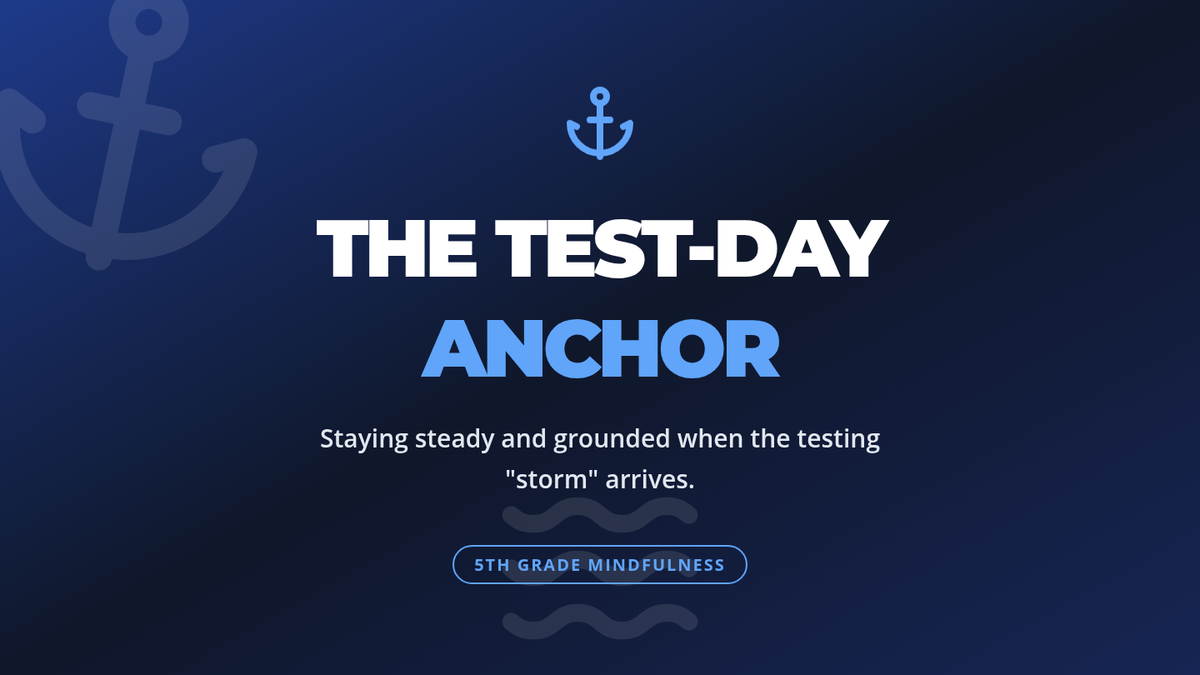 A mindfulness lesson for 5th graders to manage testing anxiety using physiological 'anchors' and grounding techniques. Students learn to navigate the 'storm' of high-stakes testing with practical, present-moment tools.
