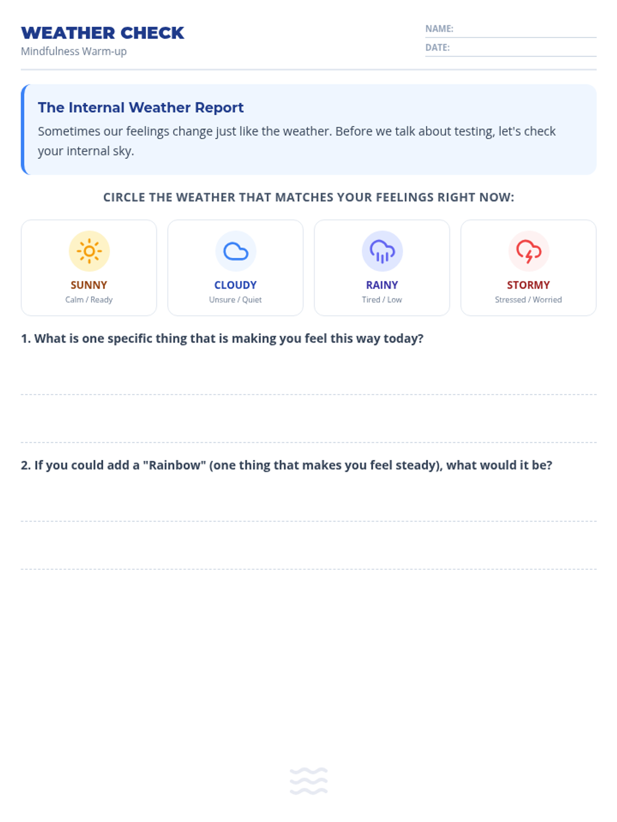 A lesson designed to equip students with practical mindfulness and grounding techniques specifically tailored for the stresses of state testing in Reading and Math, plus strategies for managing physical restlessness.