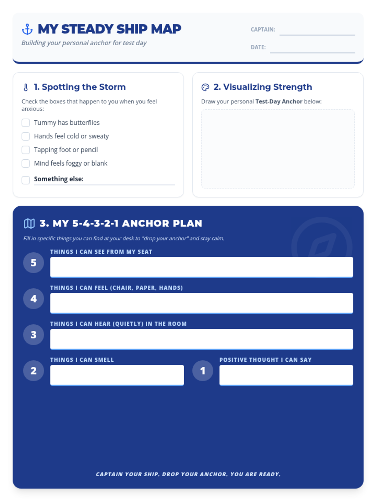A comprehensive emotional regulation toolkit for students to manage testing anxiety using maritime-themed grounding techniques and cognitive reframing.