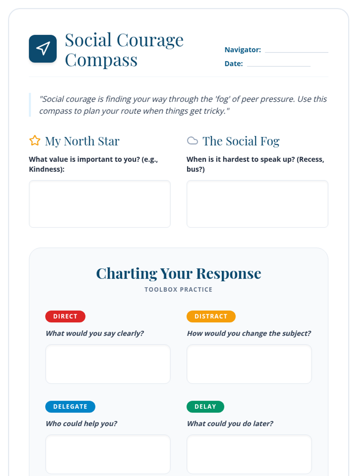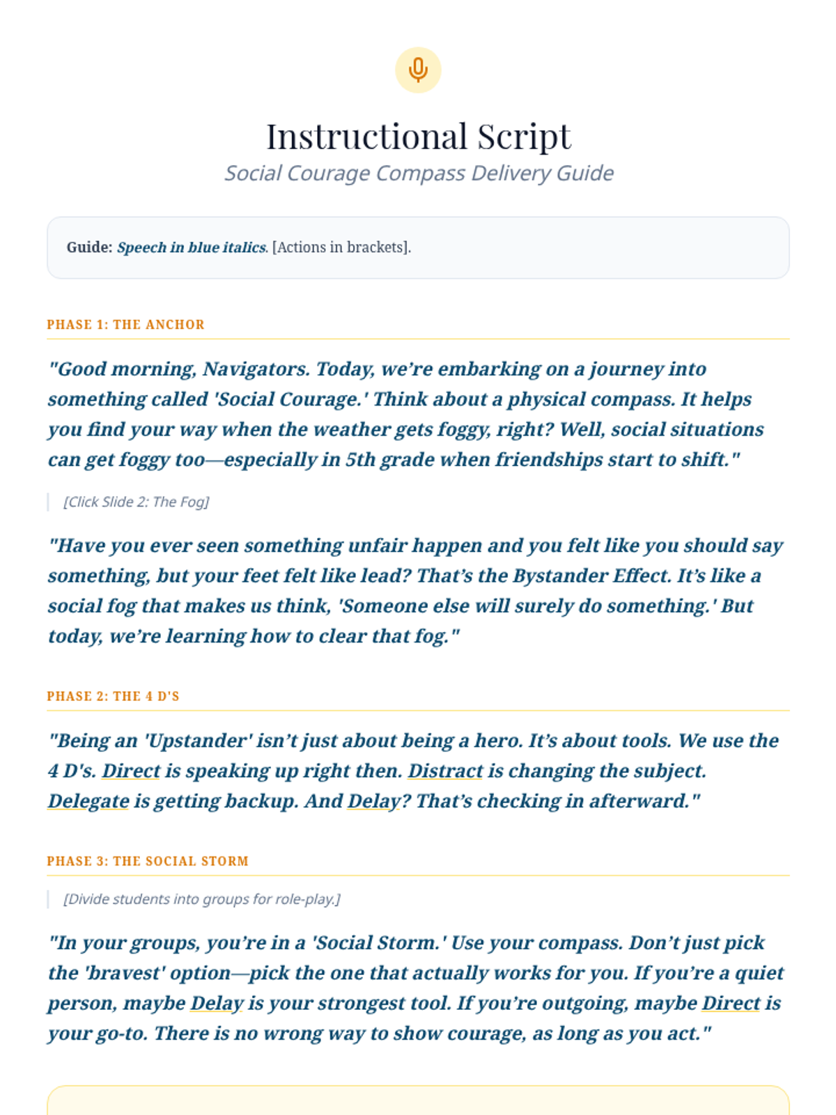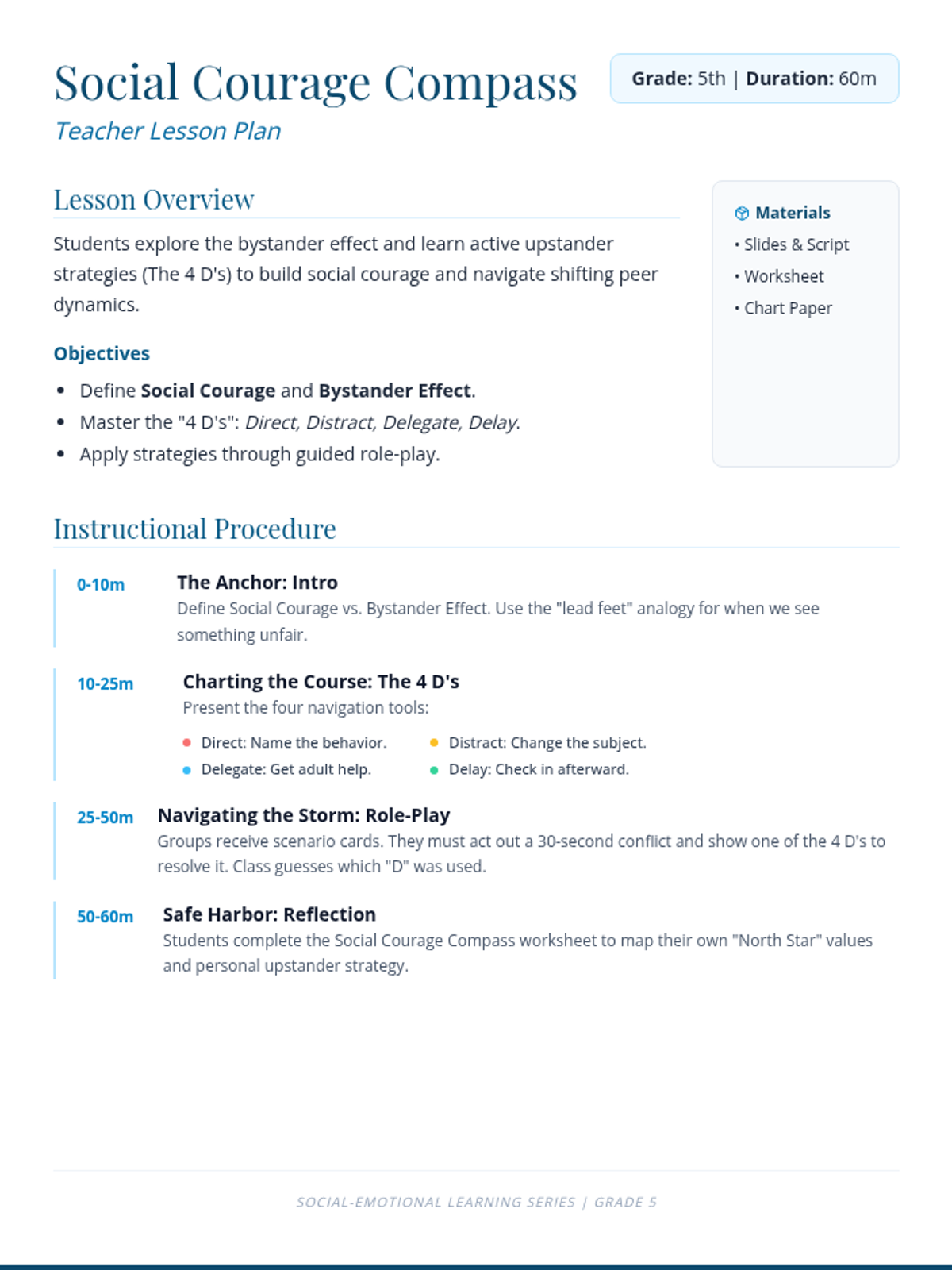 A social-emotional learning lesson for 5th graders focused on overcoming the bystander effect and developing 'upstander' strategies through the lens of social courage. Students will use the 4 D's (Direct, Distract, Delegate, Delay) to navigate common peer-pressure scenarios.