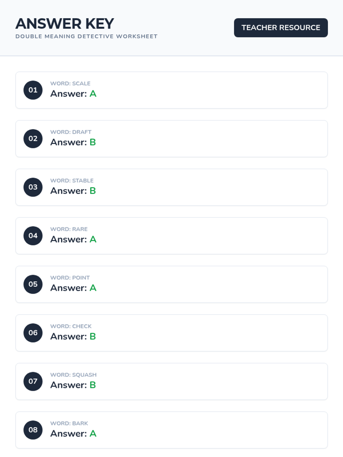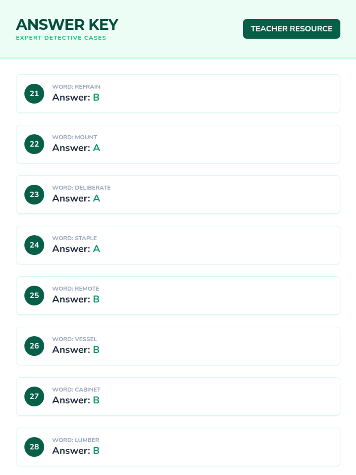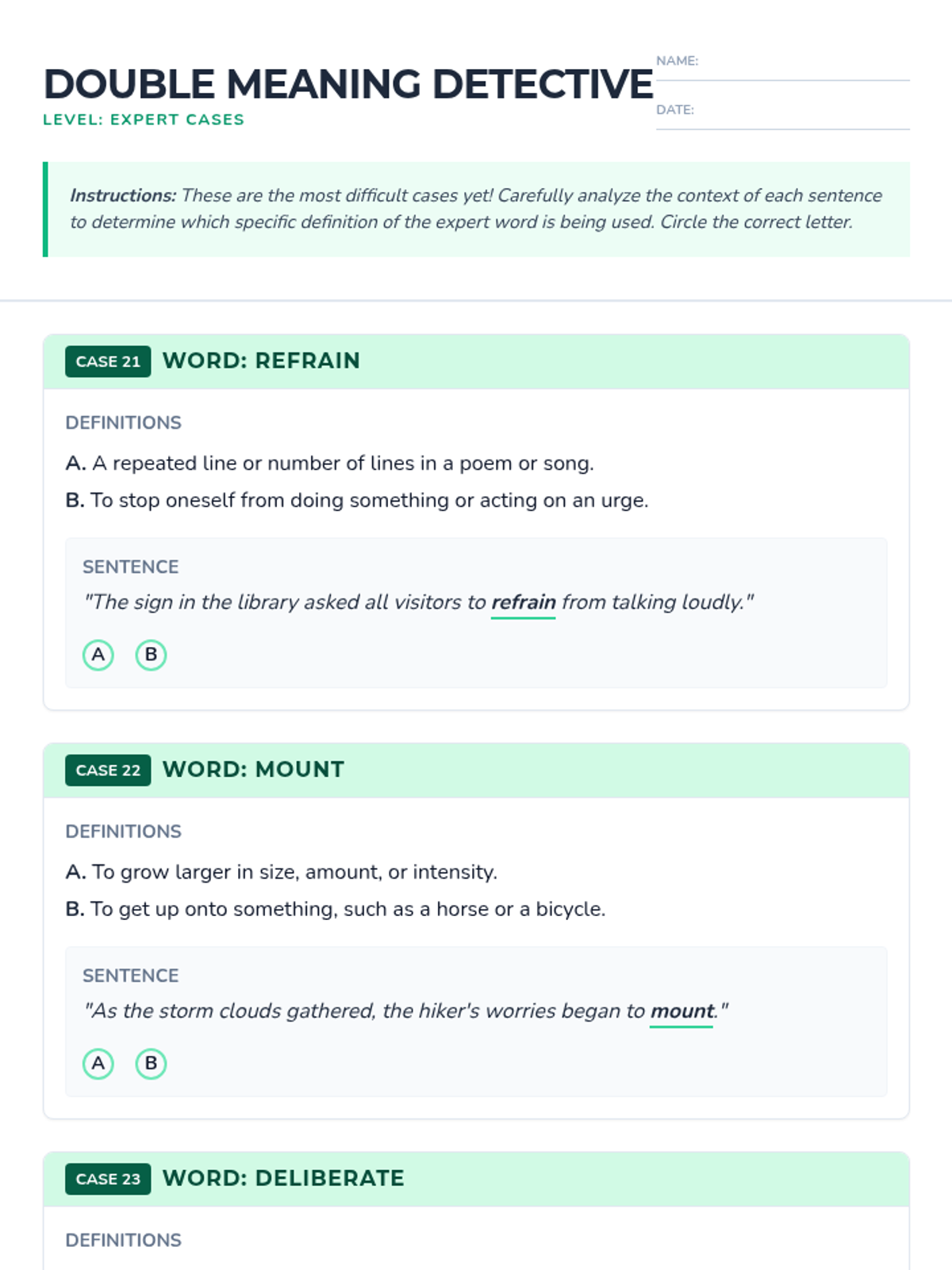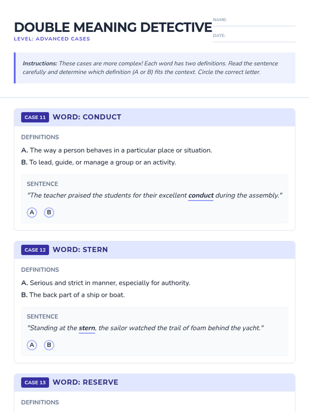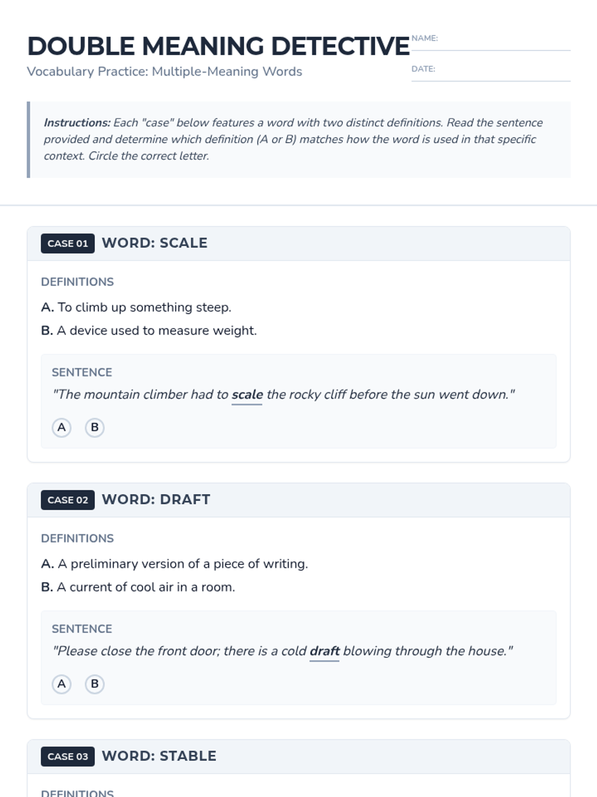 A small-group activity where students act as "Word Detectives" to determine the correct meaning of multiple-meaning words using sentence-level context clues. Students analyze task cards and record their findings in a detective log.