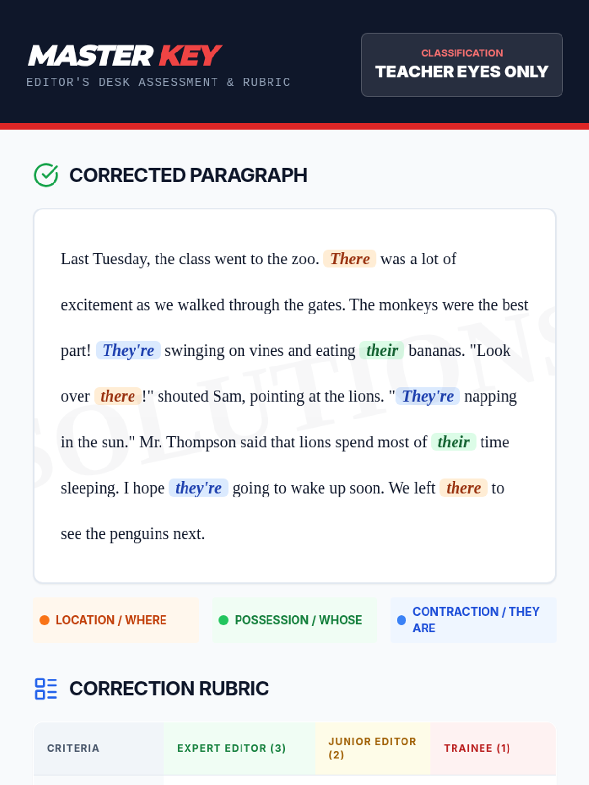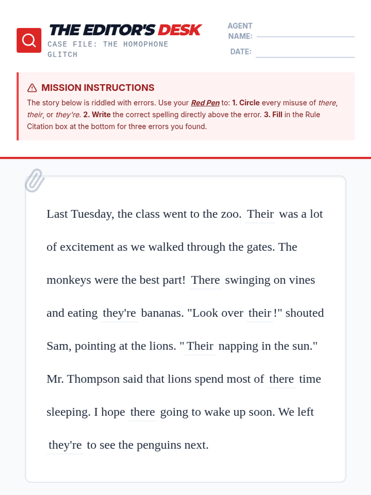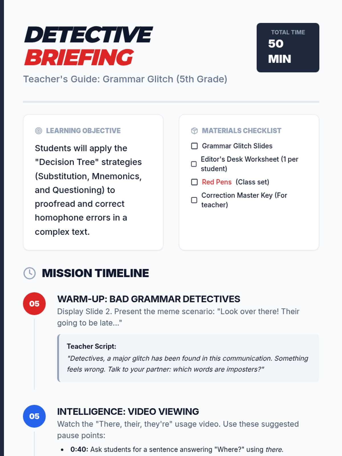 A fast-paced grammar lesson where students become 'Bad Grammar Detectives' to master the differences between 'there', 'their', and 'they're' through video analysis and a hands-on editing challenge.