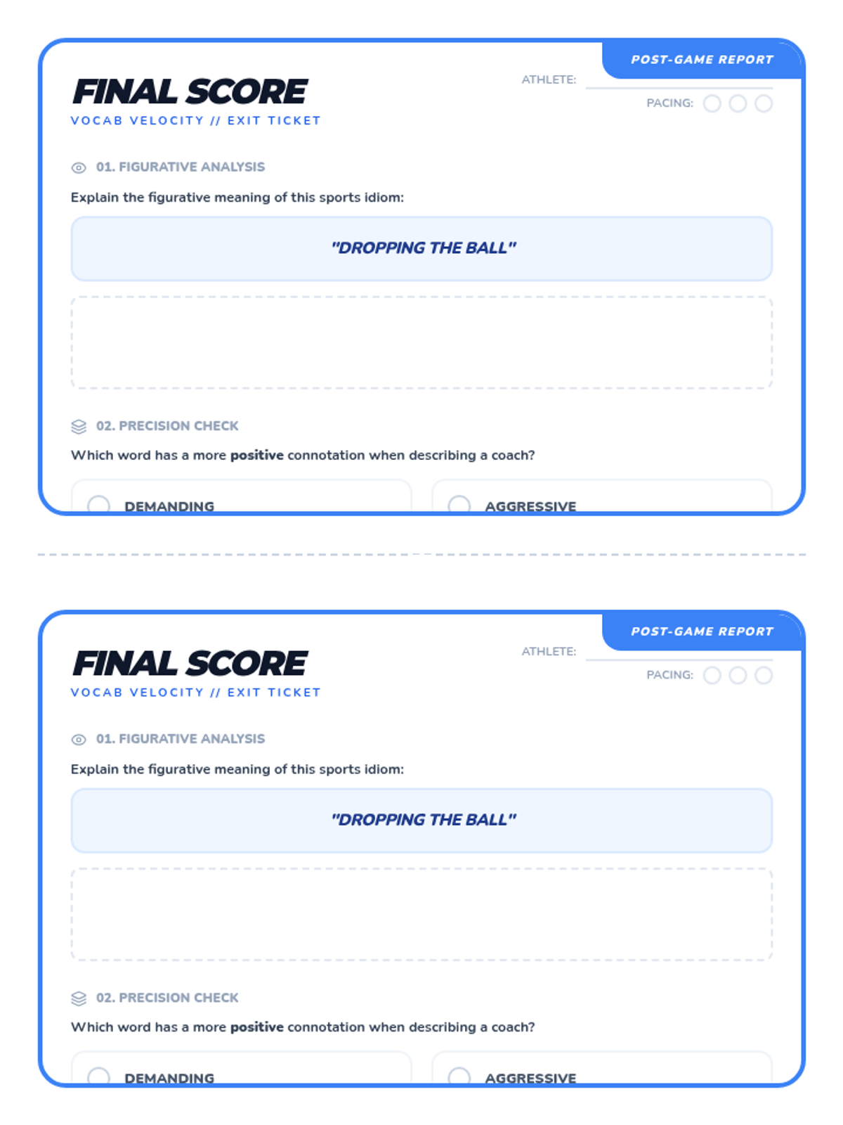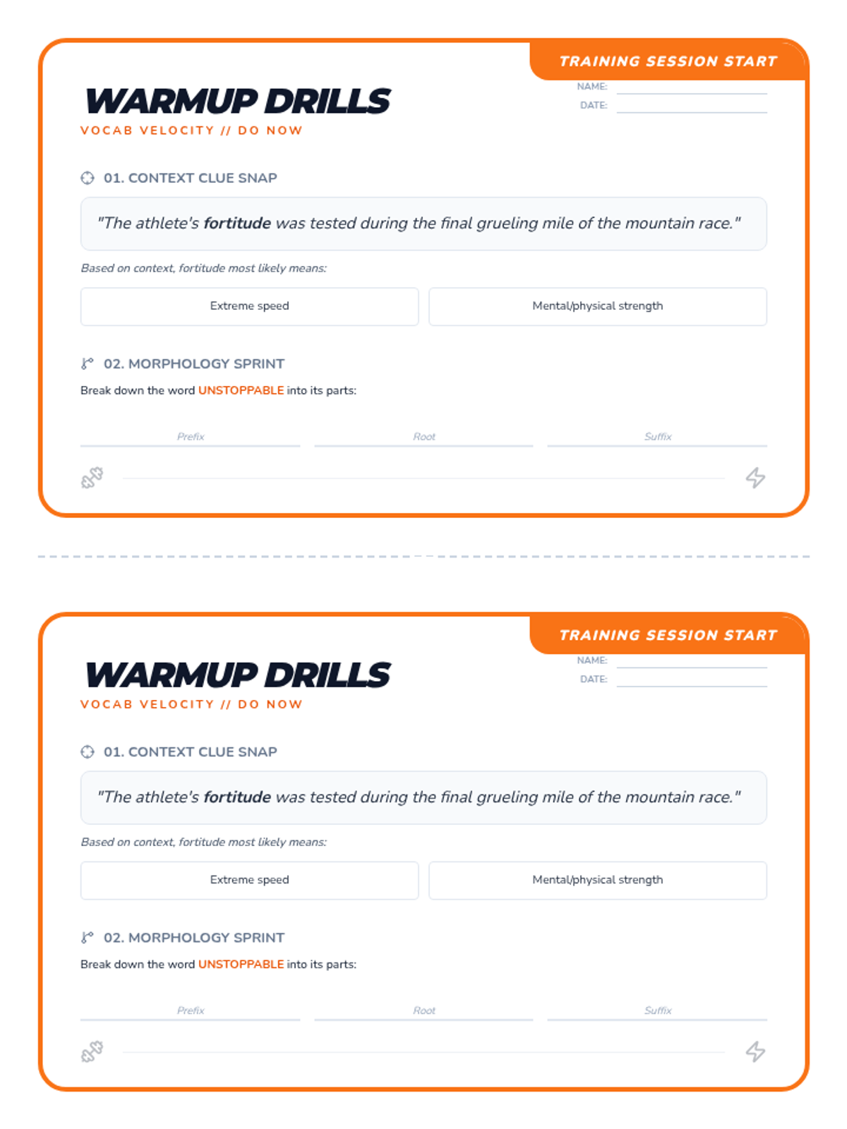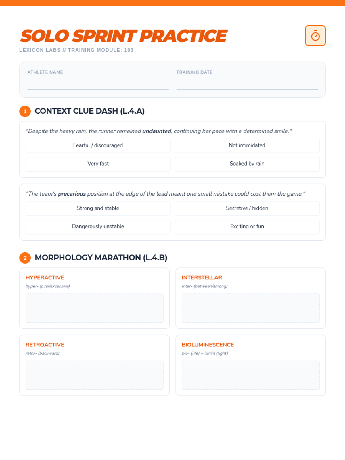 Instructional materials for vocabulary acquisition (L.4) and figurative language mastery (L.5). Students complete a 'training camp' sequence including drills, circuit training, and a final championship assessment.