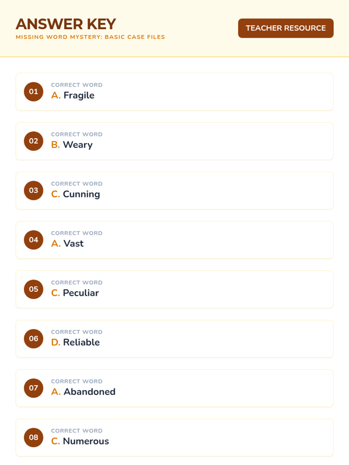A mystery-themed reading comprehension lesson featuring a 2-page original fiction story and a comprehensive assessment focused on Tier 2 vocabulary and analytical skills.