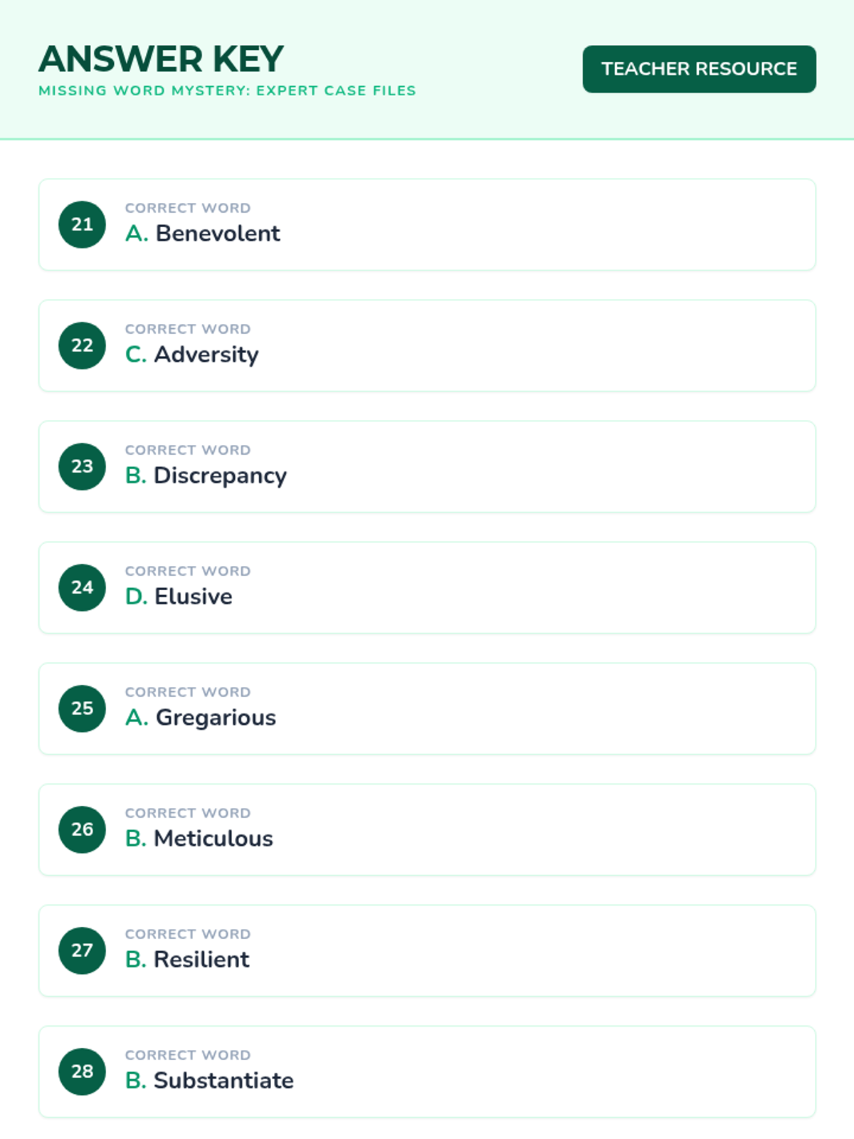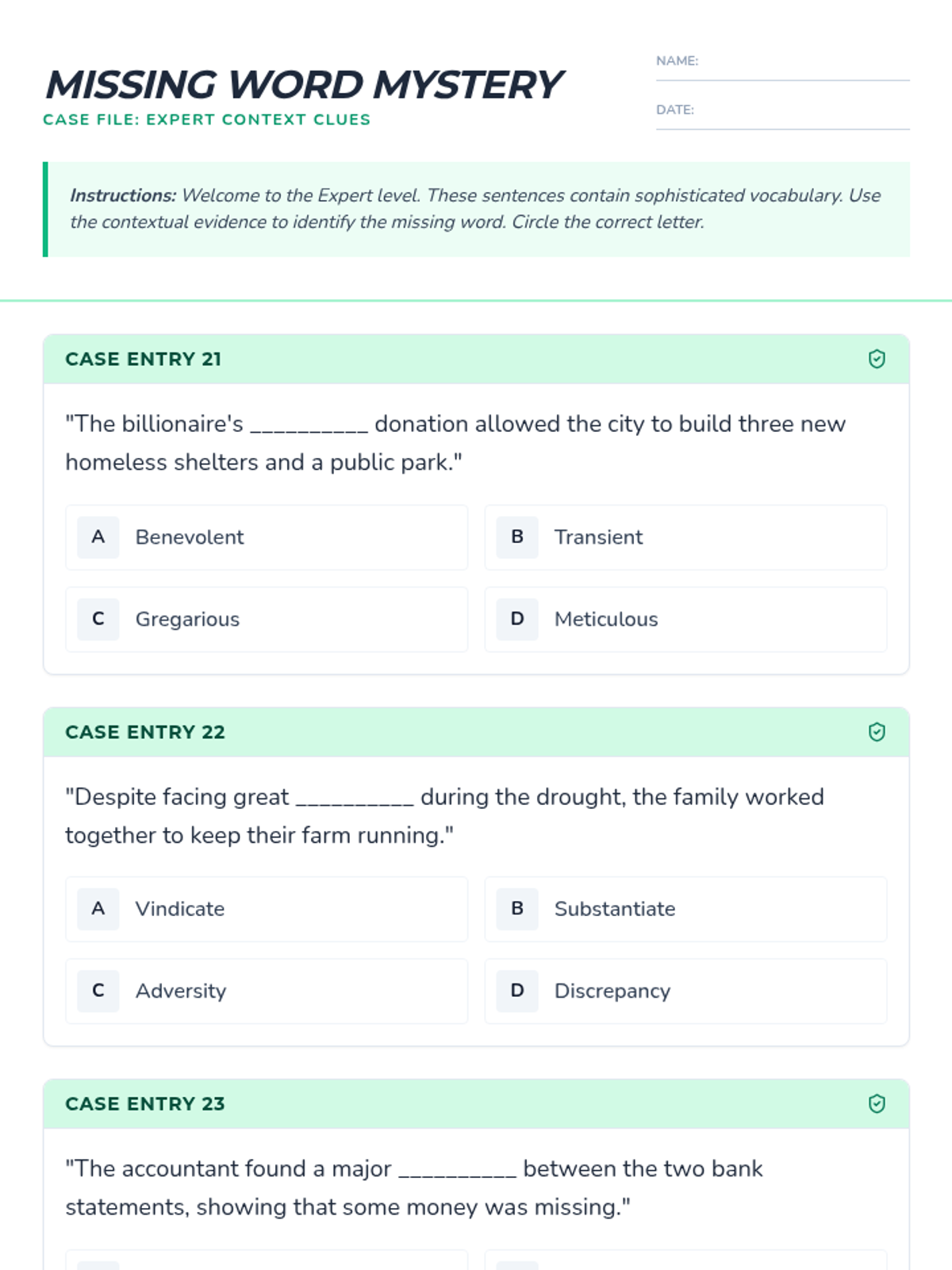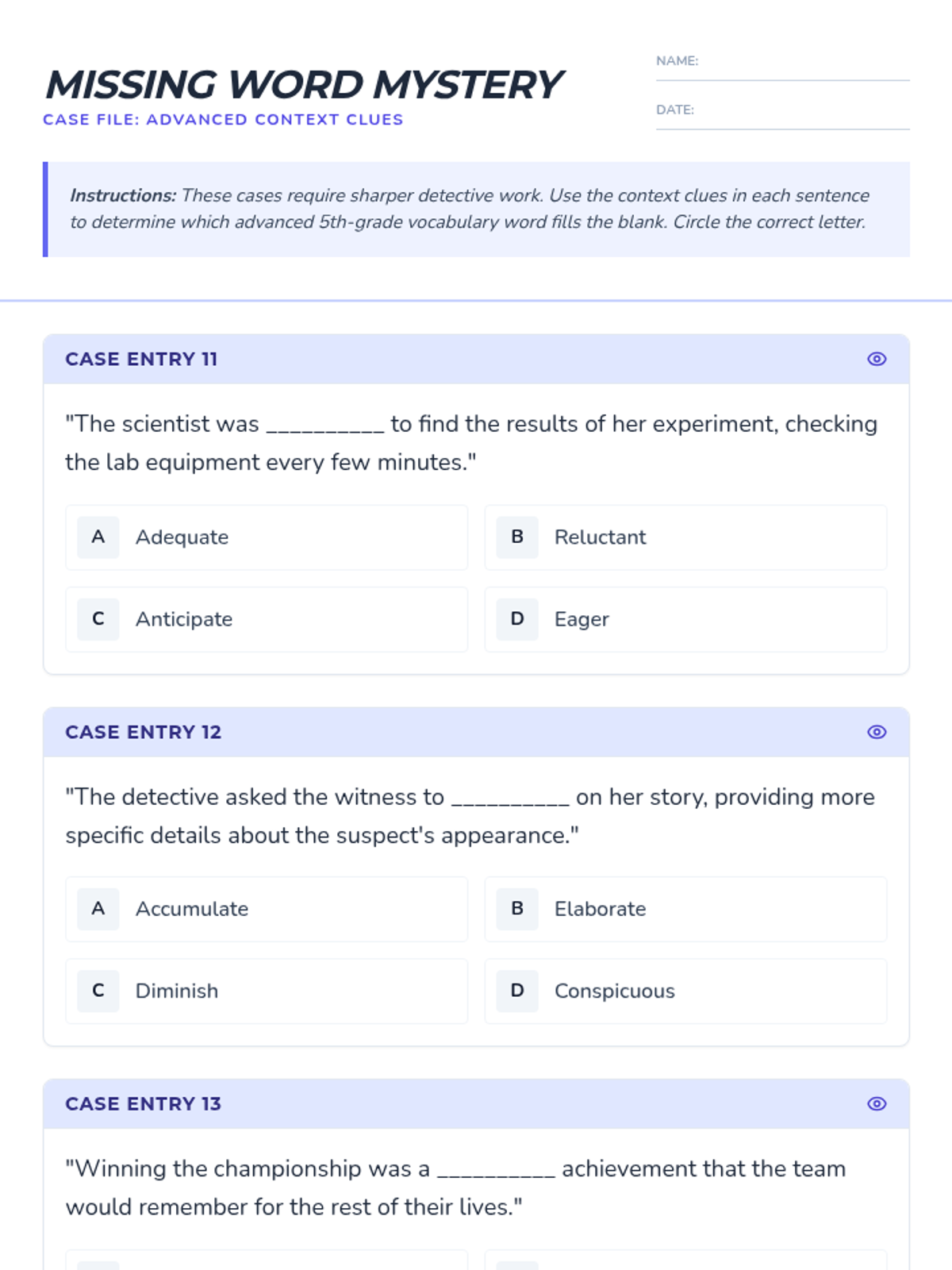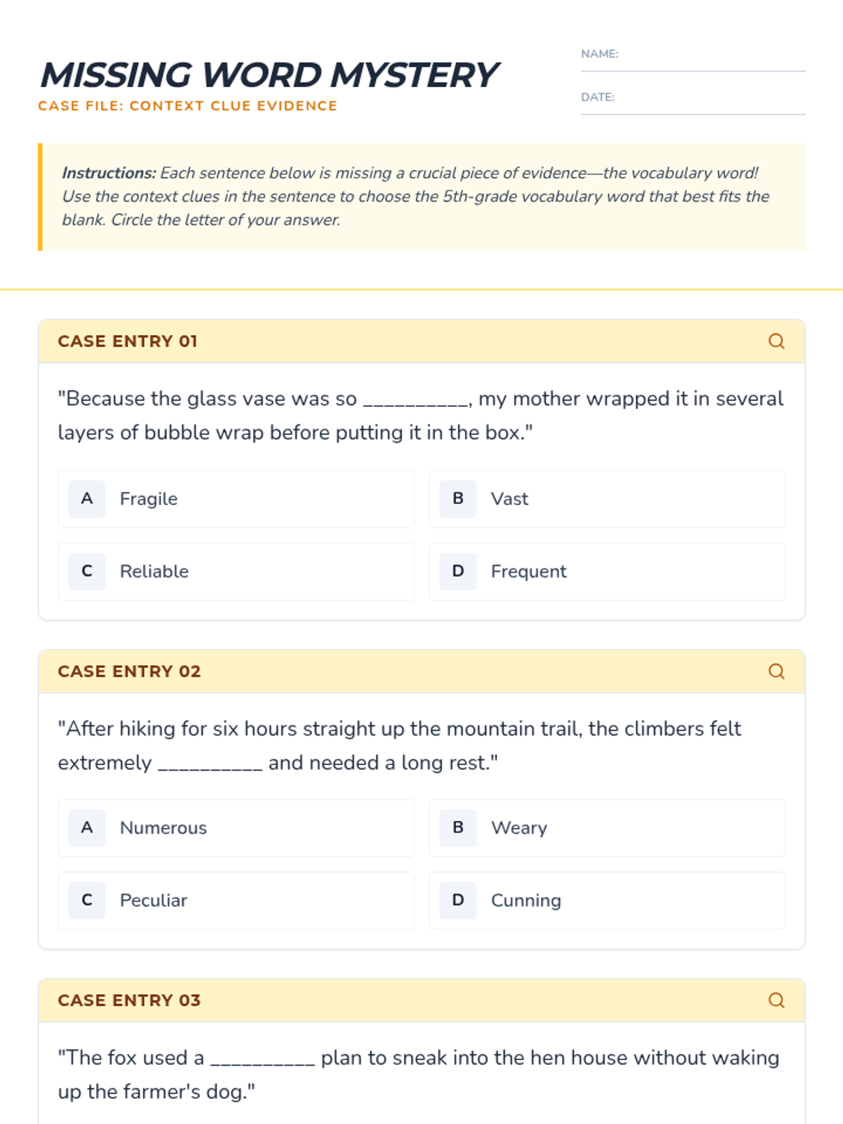 Students will rotate through 'detective stations' to practice using different types of context clues to solve word mysteries.
