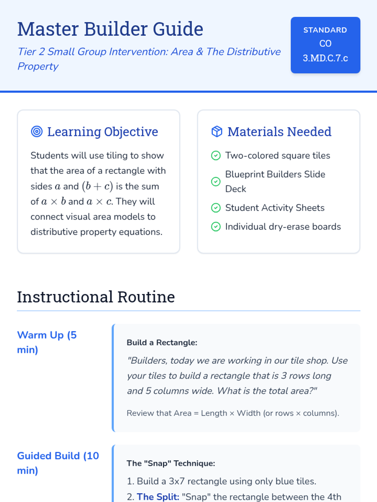 A targeted Tier 2 intervention lesson focusing on the distributive property of multiplication through area models. Students use two-colored tiling to decompose rectangles and write corresponding equations, connecting visual models to abstract algebraic thinking.