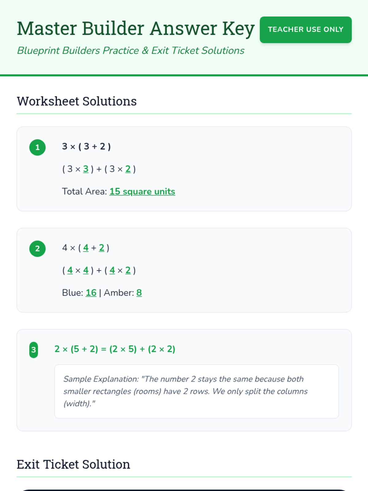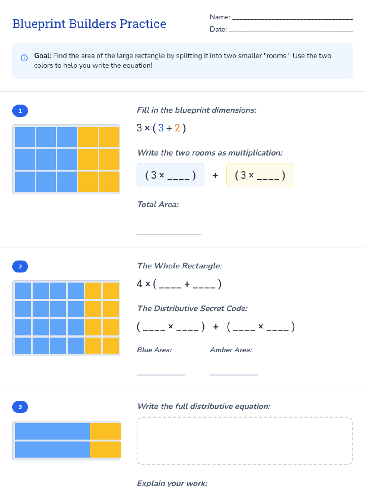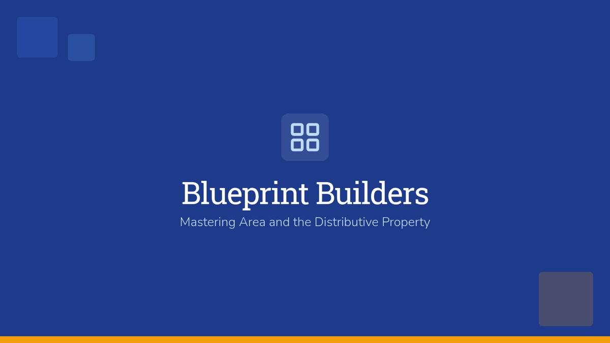 A 35-minute lesson focused on decomposing rectilinear shapes into rectangles to find total area using the distributive property, themed around architectural blueprints.