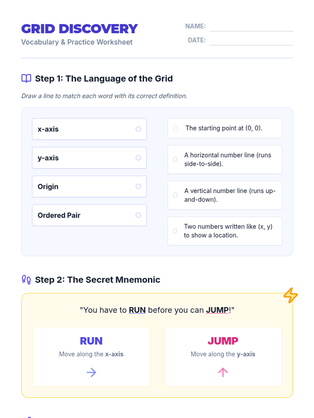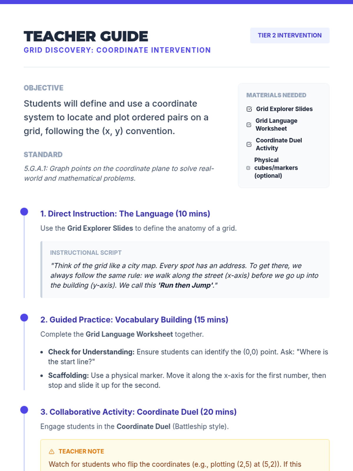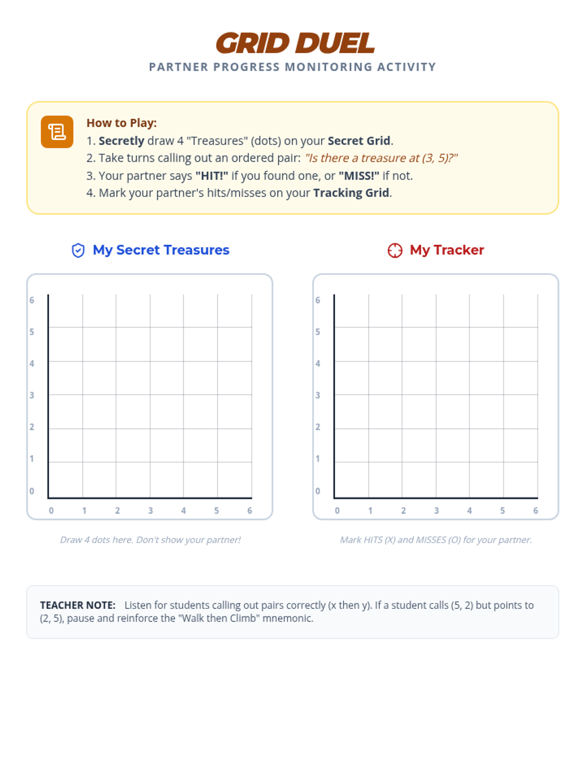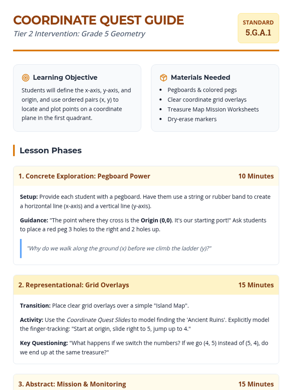 A Tier 2 intervention lesson designed to help 5th-grade students master the coordinate system through scaffolded vocabulary, guided plotting, and an engaging Battleship-style game. Students will learn the convention of ordered pairs (x, y) using the 'Run then Jump' mnemonic.