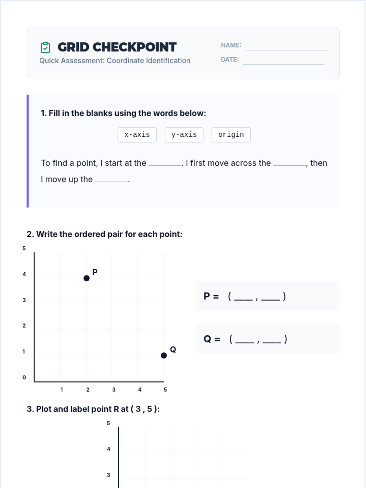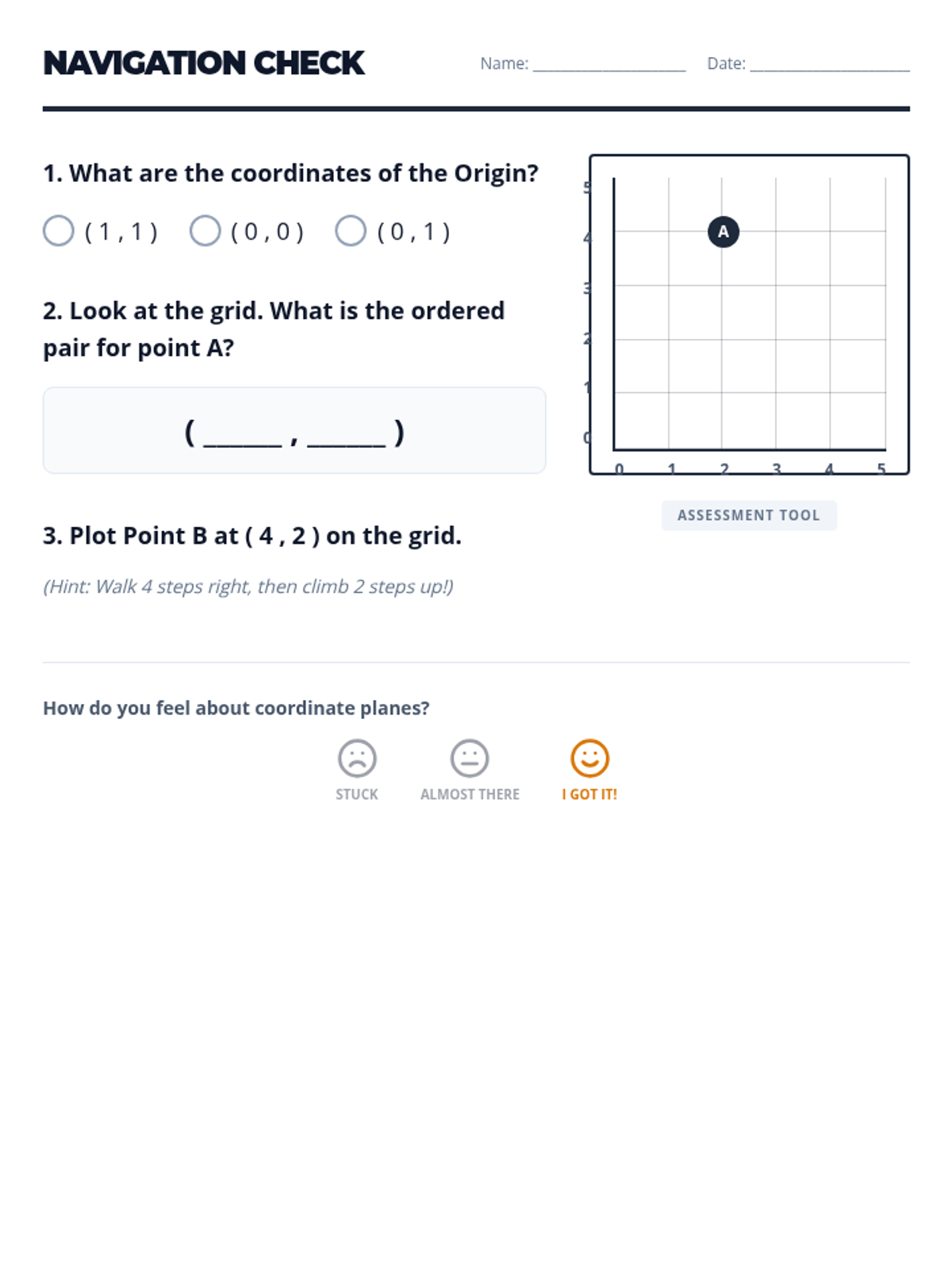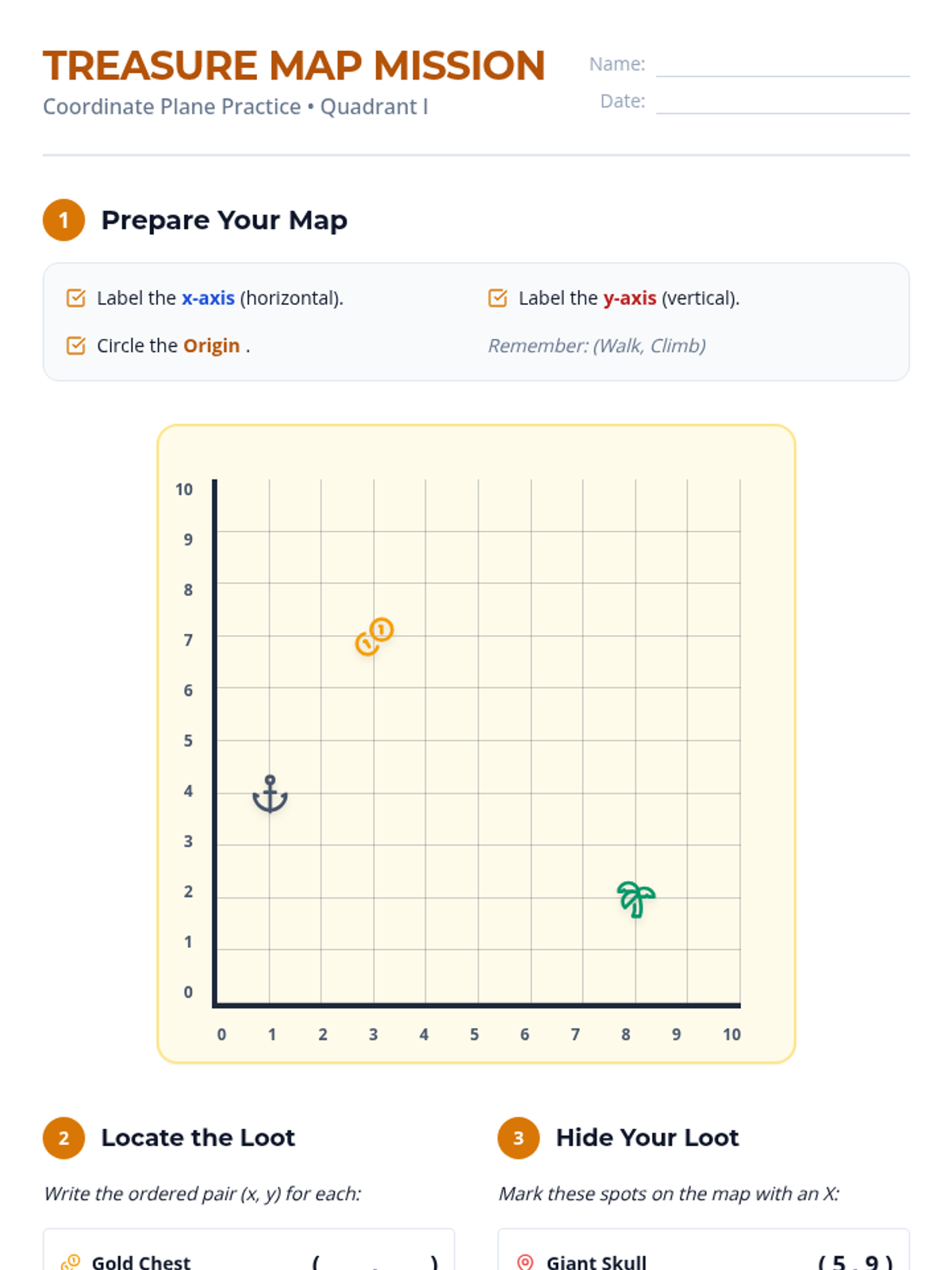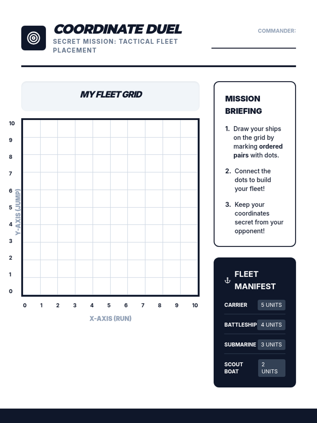 A Tier 2 intervention lesson designed to help 5th-grade students master the coordinate system through scaffolded vocabulary, guided plotting, and an engaging Battleship-style game. Students will learn the convention of ordered pairs (x, y) using the 'Run then Jump' mnemonic.