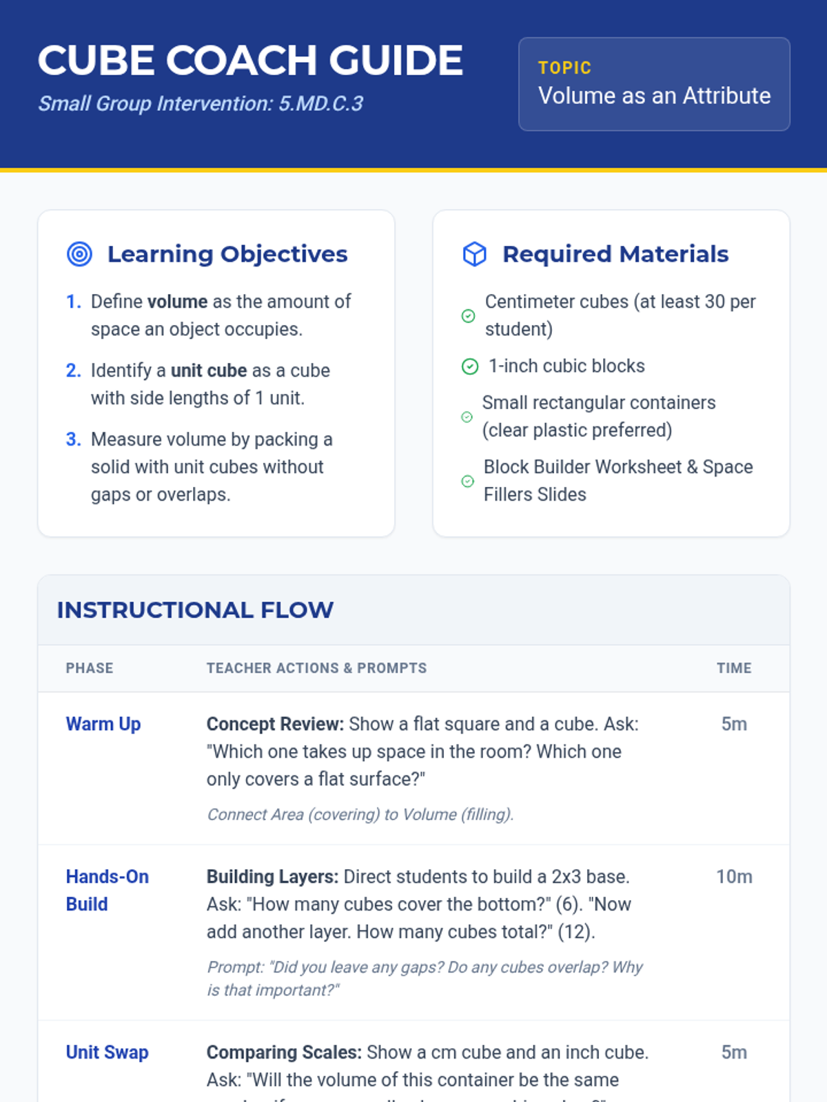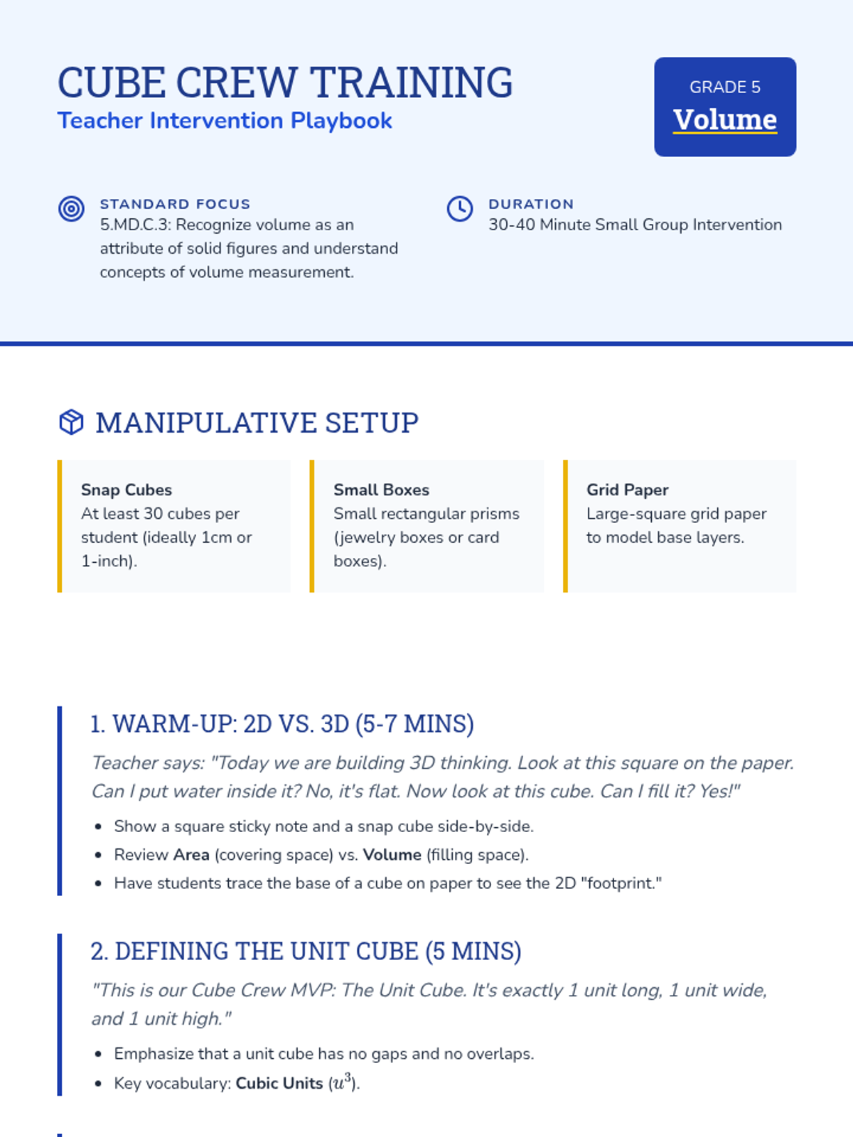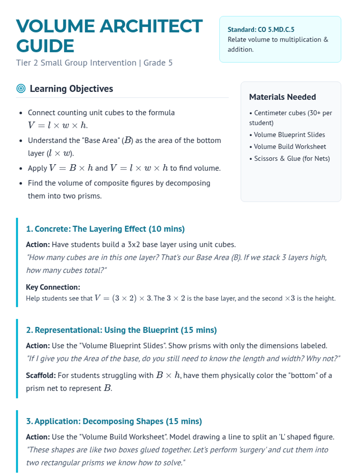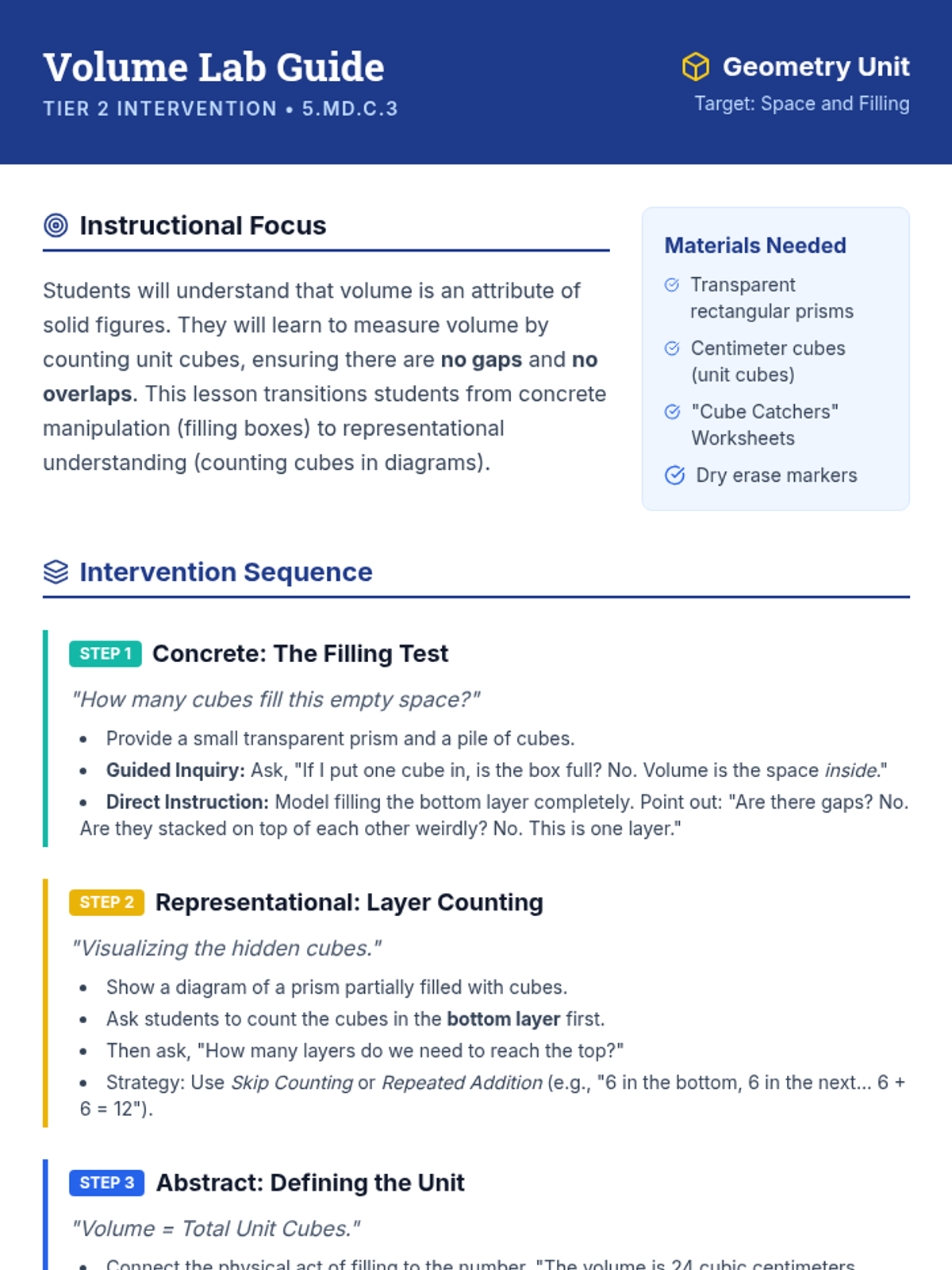 A Tier 2 intervention lesson for 5th graders focusing on the concept of volume as the amount of space inside a solid figure, measured using unit cubes without gaps or overlaps. This lesson uses concrete manipulatives and visual models to bridge understanding.