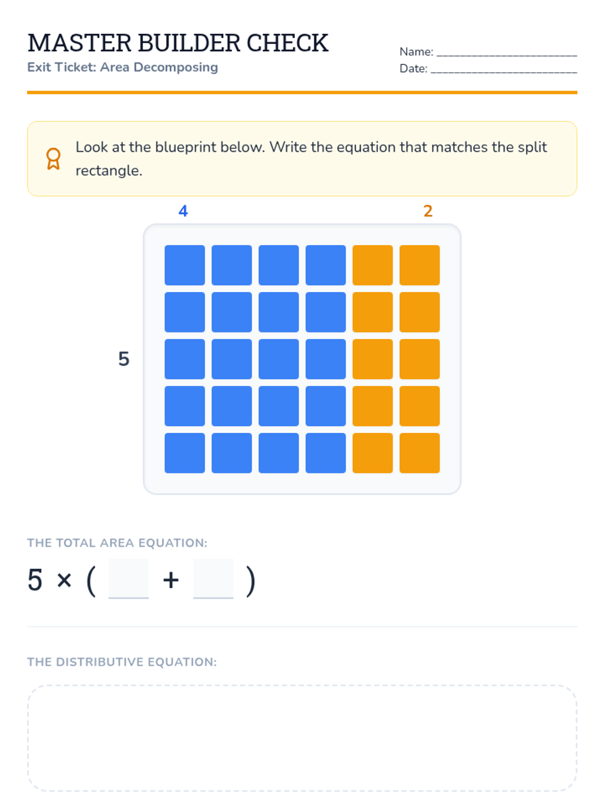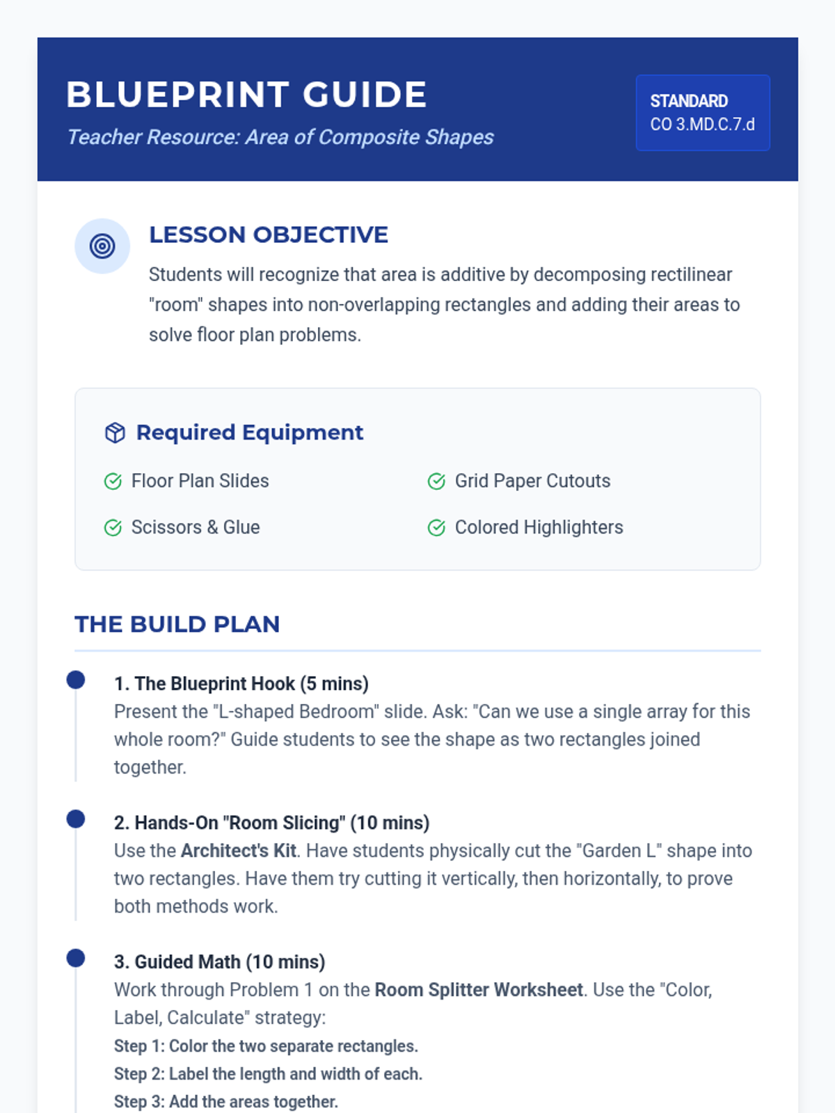 A hands-on lesson focusing on decomposing rectilinear shapes into non-overlapping rectangles to find total area, featuring a blueprint-themed partner game and visual task cards for small group support.