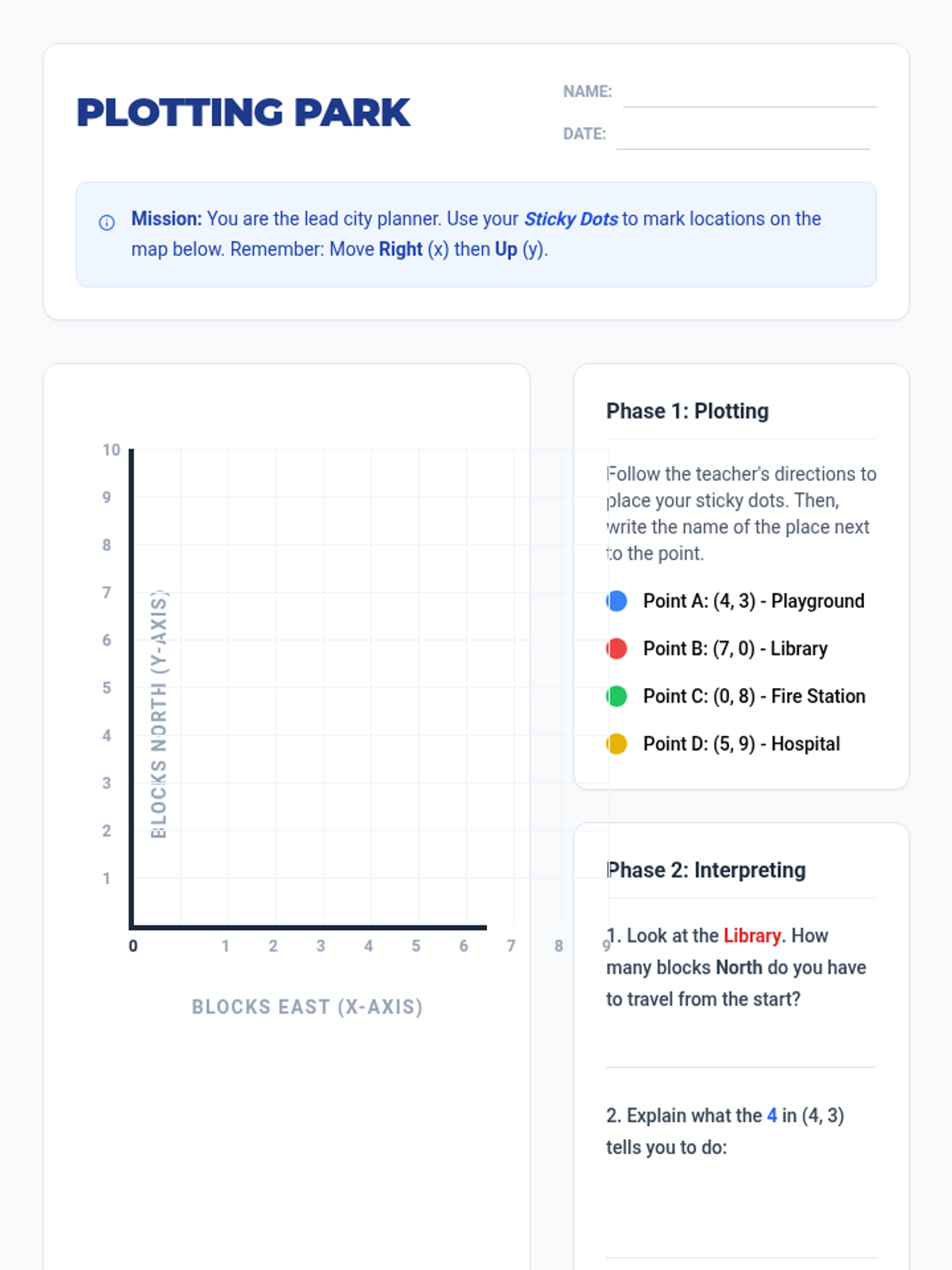 A Tier 2 intervention lesson focused on mastering the coordinate plane through tactile floor activities and scaffolded grid work. Students will identify axes, the origin, and accurately plot points using ordered pairs.