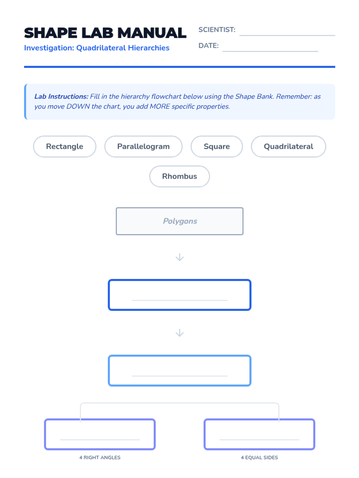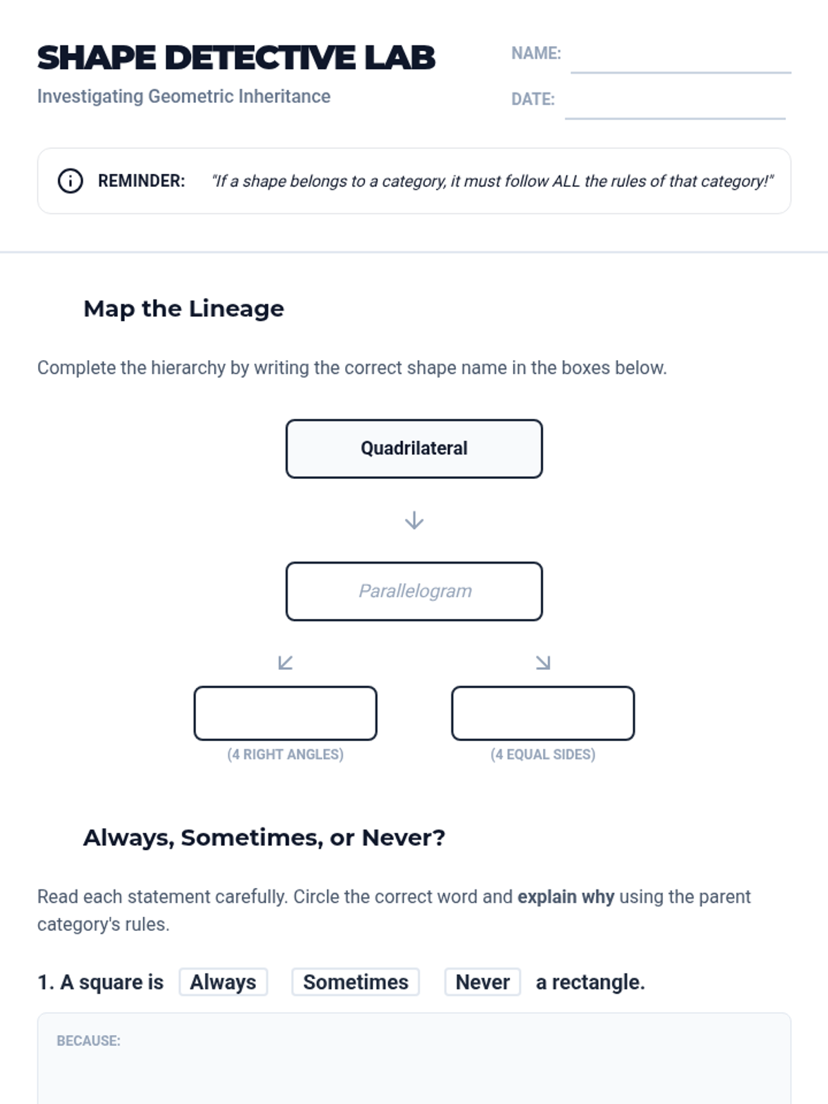Students will explore and explain why attributes of a category of 2D figures (like parallelograms) also belong to its subcategories (like rectangles), using hands-on manipulatives and visual organizers.