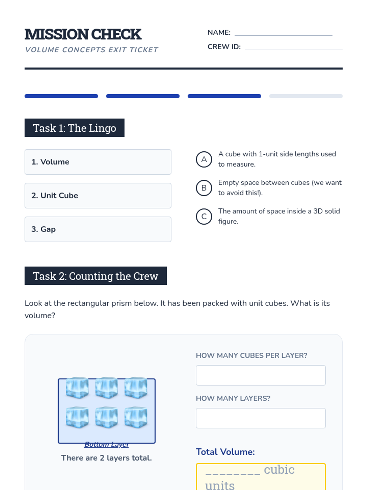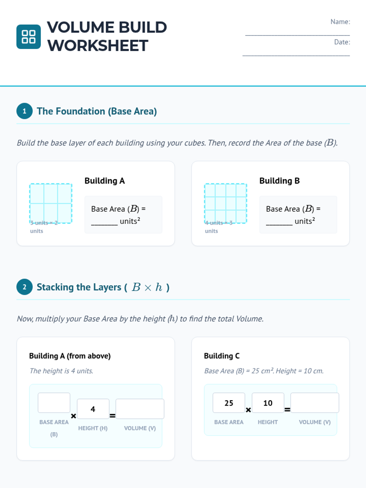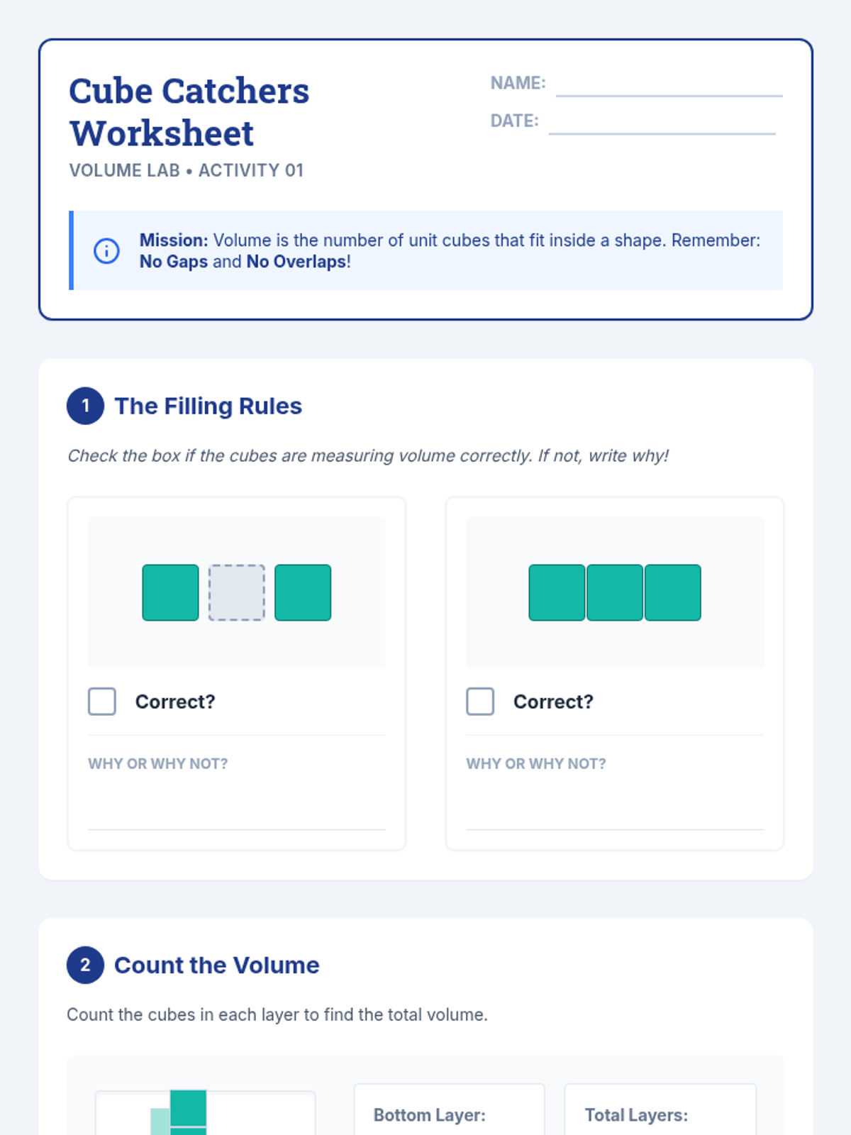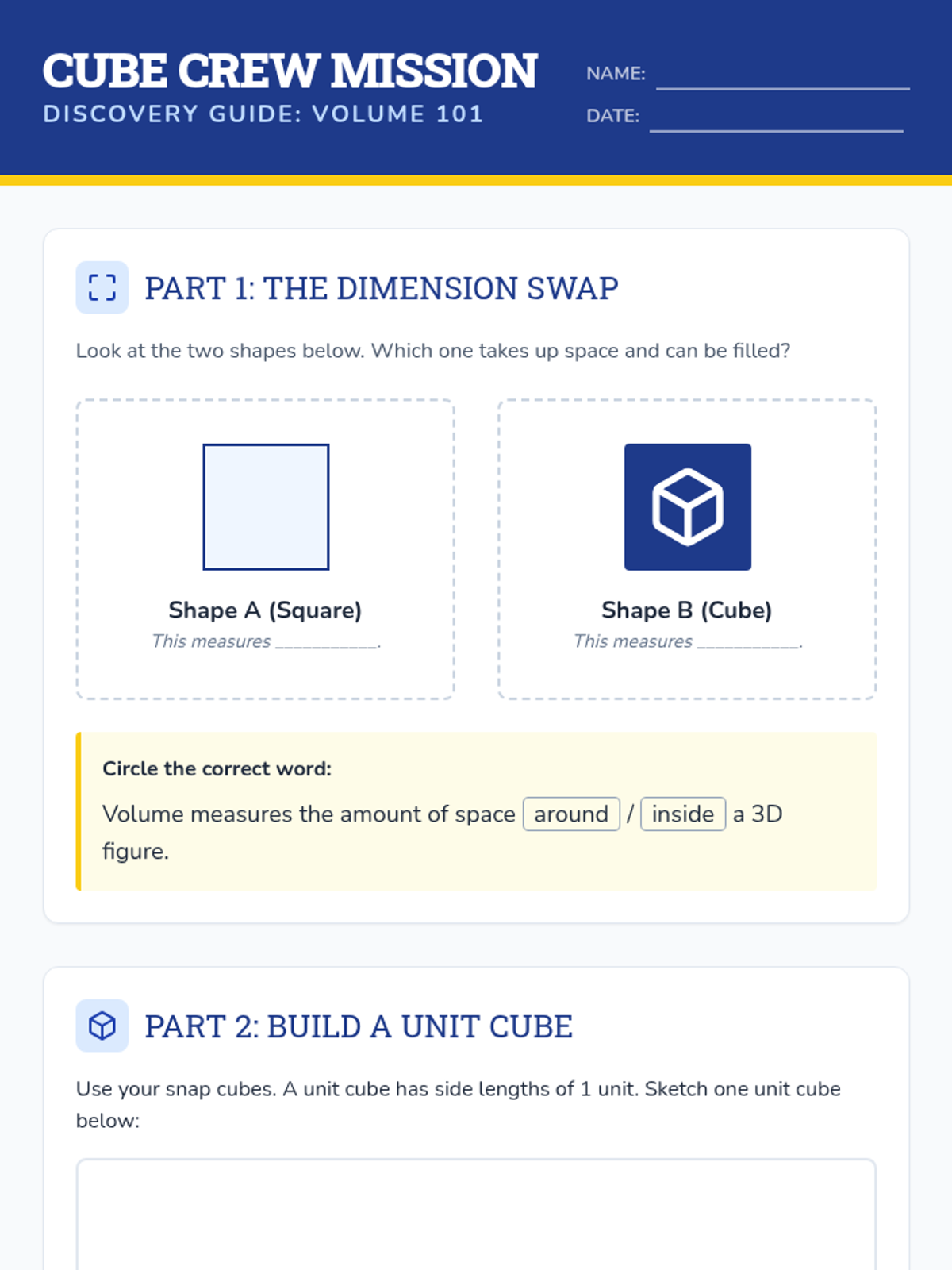 A hands-on exploration of volume for cubes and rectangular prisms, transitioning from counting unit cubes to applying the formula. Designed for diverse learners with visual aids, partner challenges, and blueprint-themed practice.