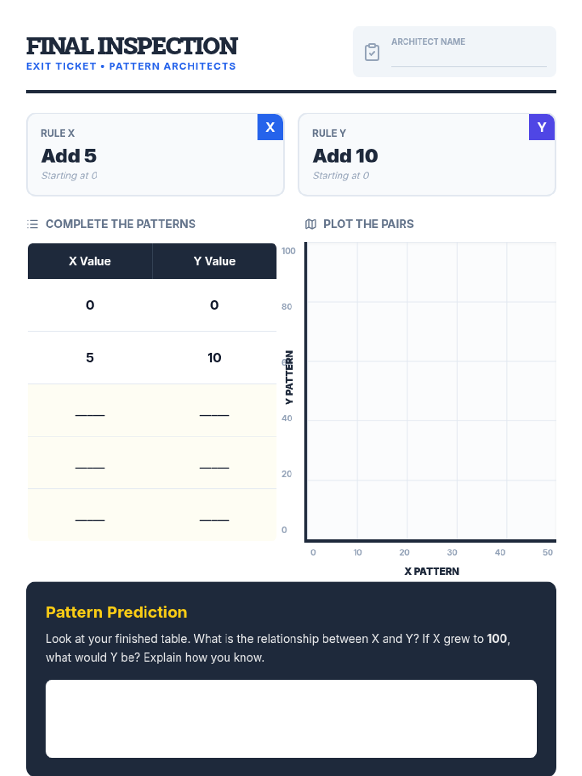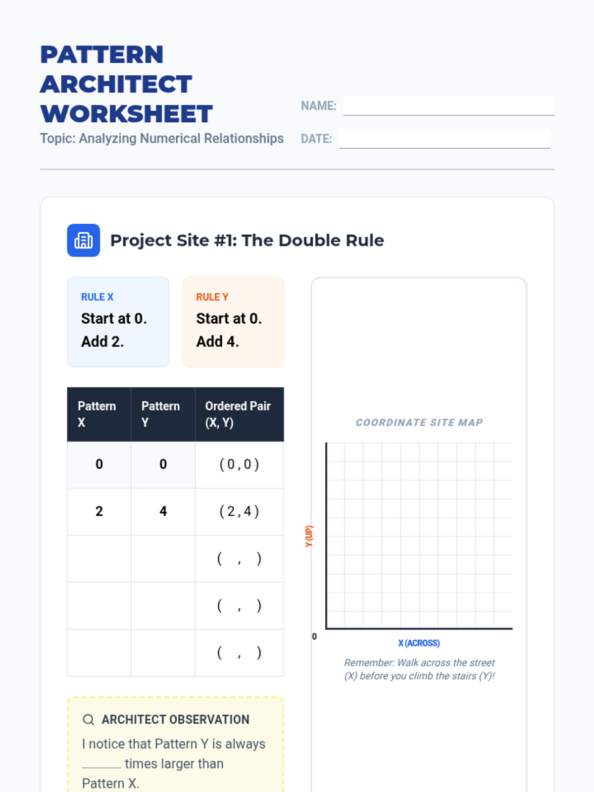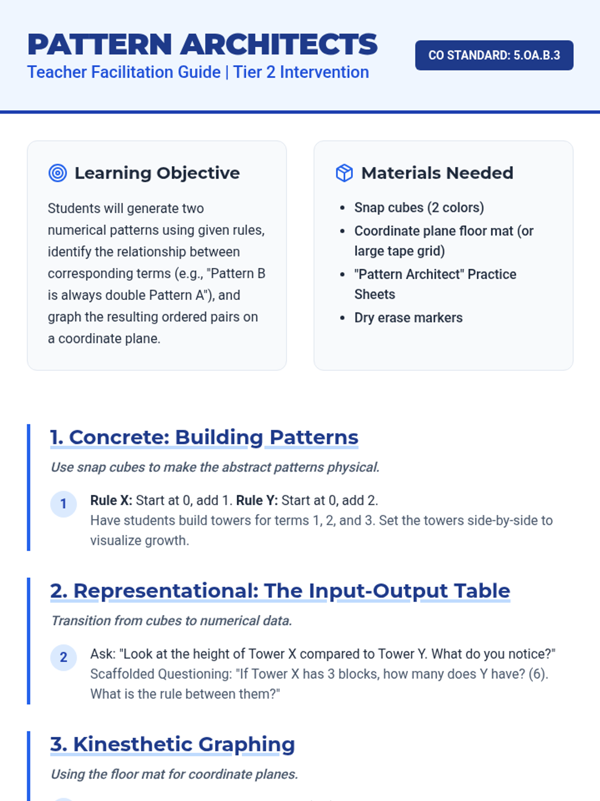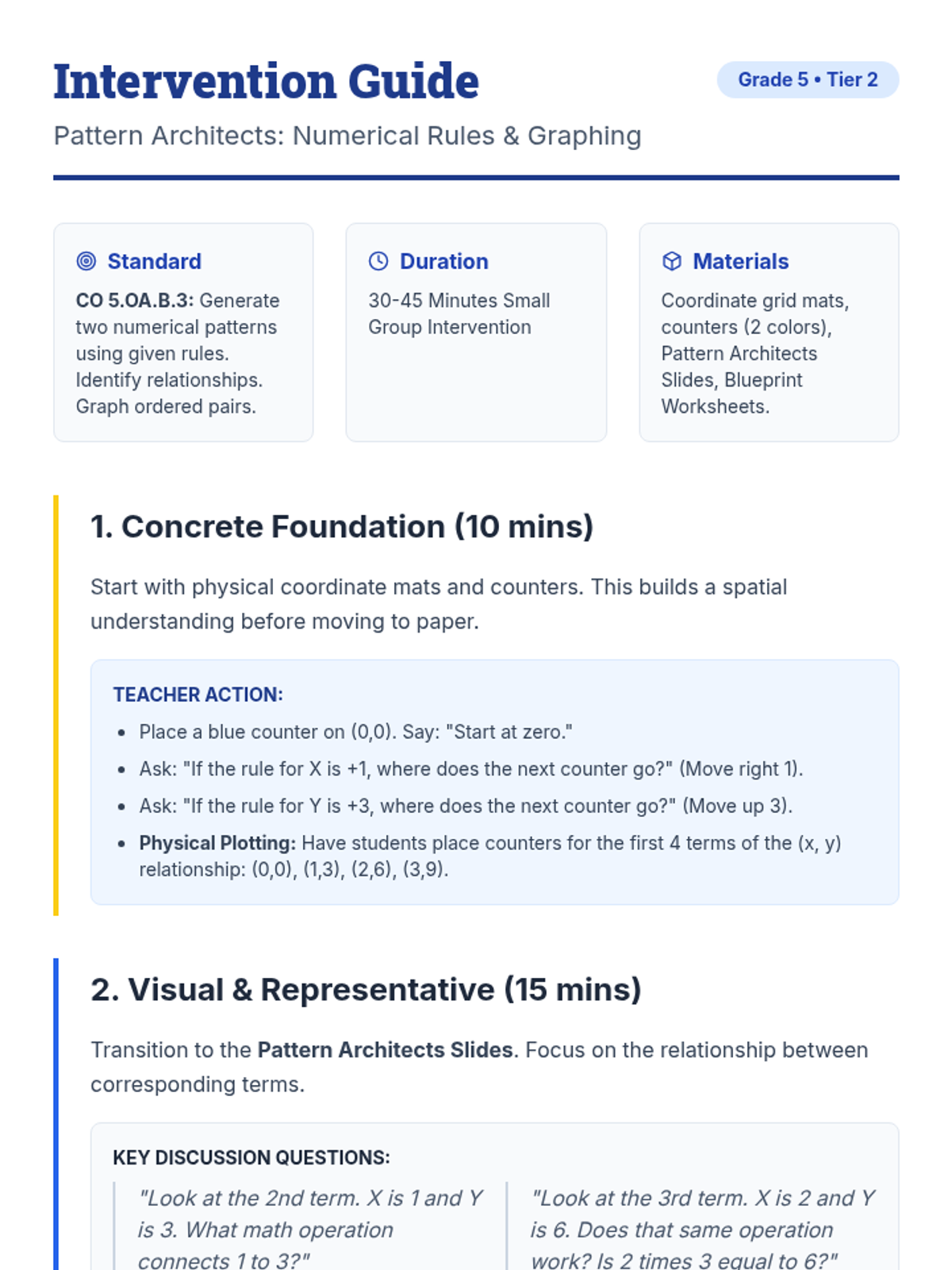 A Tier 2 intervention lesson for 5th graders focusing on generating numerical patterns, identifying their relationships, and graphing ordered pairs. Students use visual models and structured tables to bridge the gap between abstract rules and coordinate geometry.
