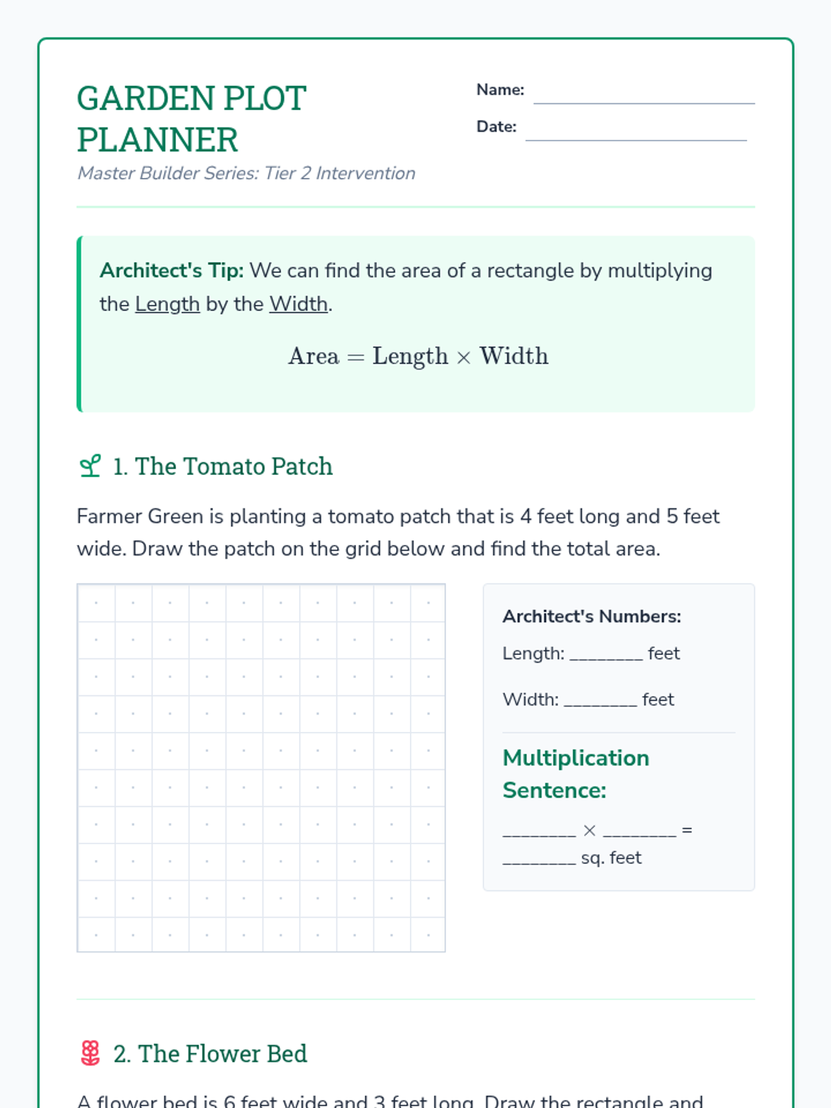 A Tier 2 intervention lesson focused on multiplying side lengths to find area. Students use real-world contexts like gardens and bulletin boards to bridge the gap between counting units and using multiplication.