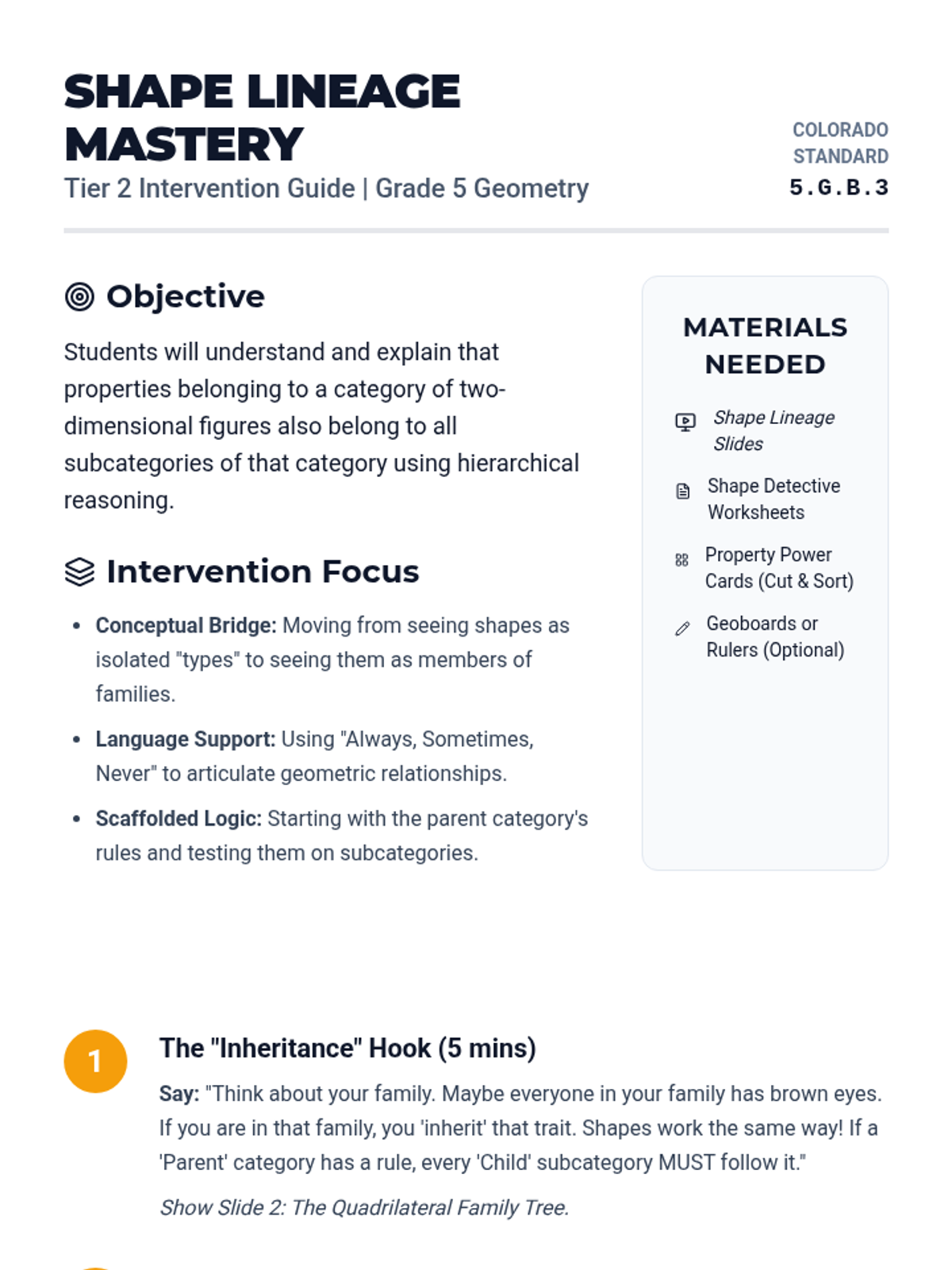 A Tier 2 intervention lesson focused on classifying 2D figures into a hierarchy. Students use properties to understand nested categories (e.g., all squares are rectangles).