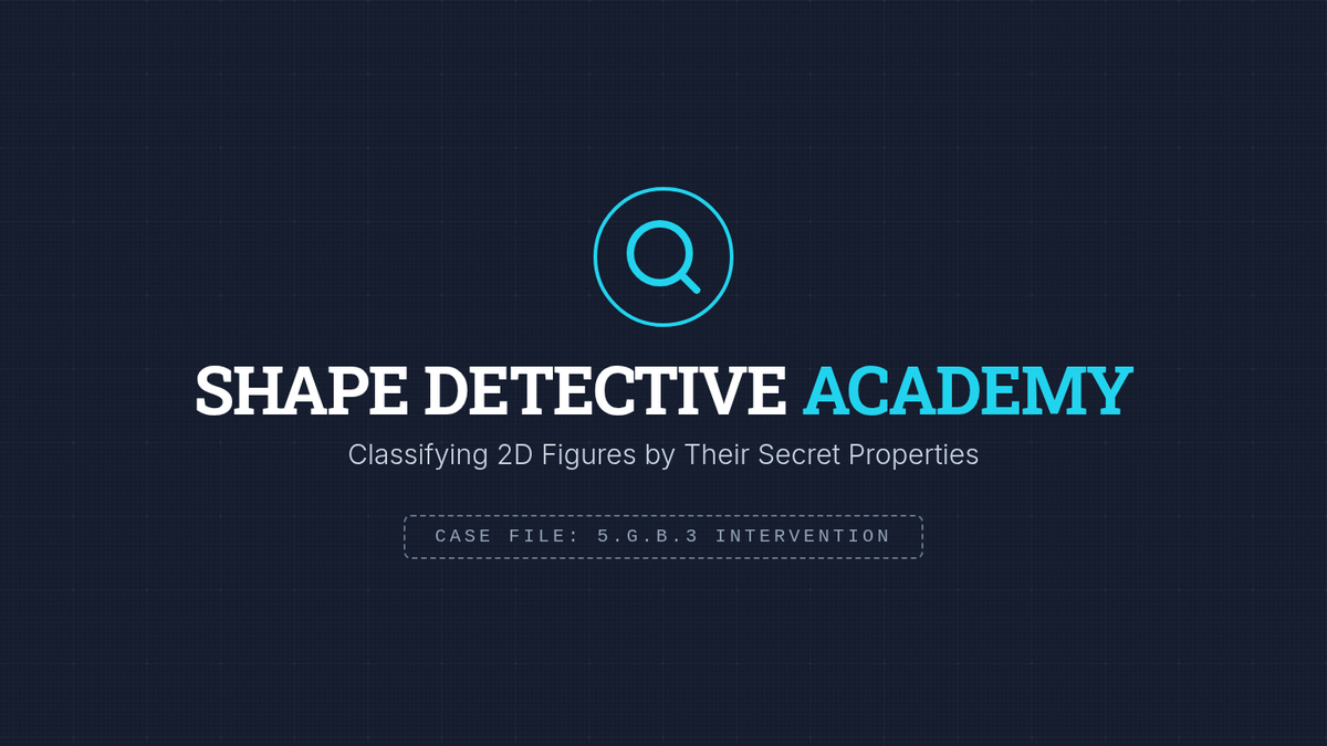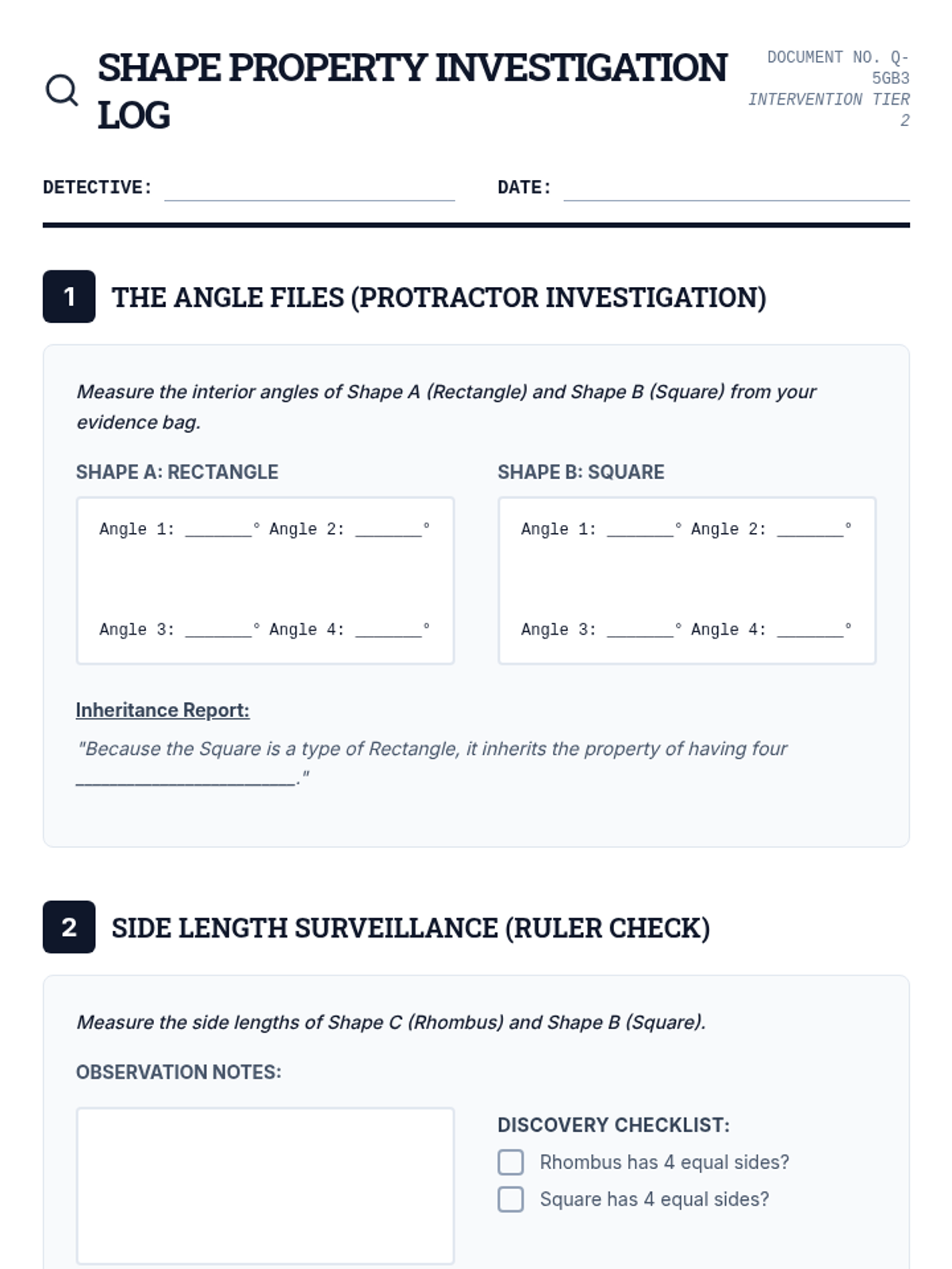A Tier 2 intervention lesson focused on reasoning about shared attributes of 2D figures. Students act as 'Shape Detectives' to investigate property inheritance through hands-on stations and verbal justification.