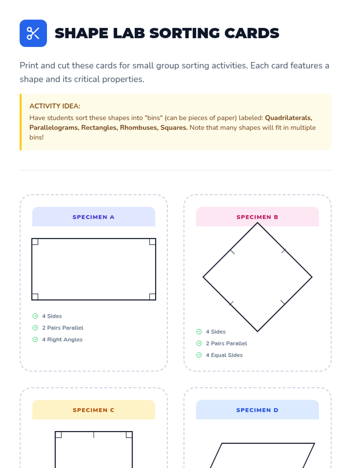 A Tier 2 small group intervention focused on identifying shared attributes of shapes to define larger categories, specifically quadrilaterals. Students use tangrams and geometric solids to explore properties through scaffolded 'Always/Sometimes/Never' activities.