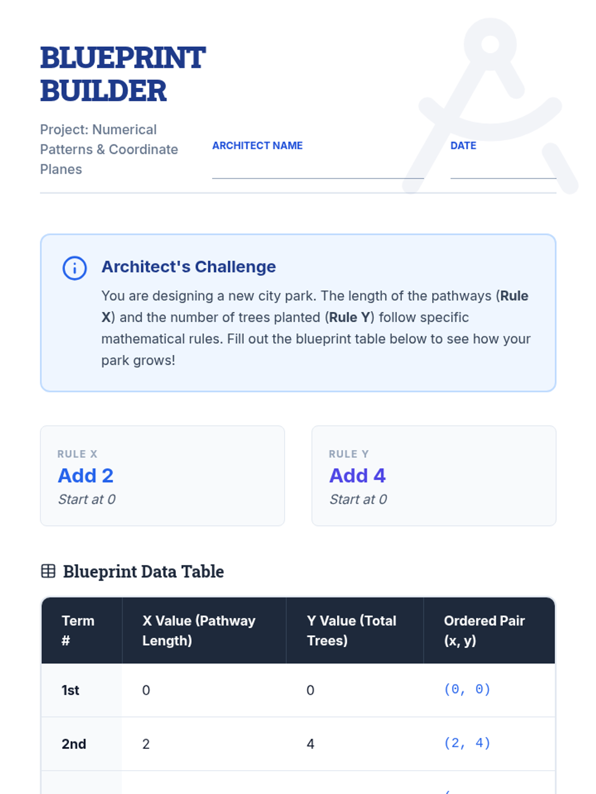 A visual exploration of number patterns and input-output tables using an architectural design theme. Students learn to identify rules and extend sequences through scaffolded building floor plans.