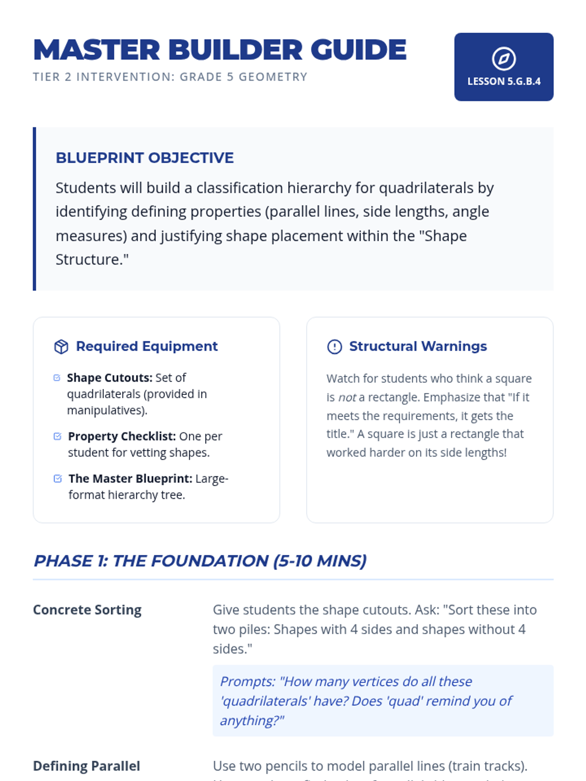 A Tier 2 intervention lesson for 5th grade students focusing on classifying 2D figures (quadrilaterals) into a hierarchy based on properties like sides, angles, and parallel lines. This lesson uses a drafting/blueprint theme to help students see the 'structure' of geometry.