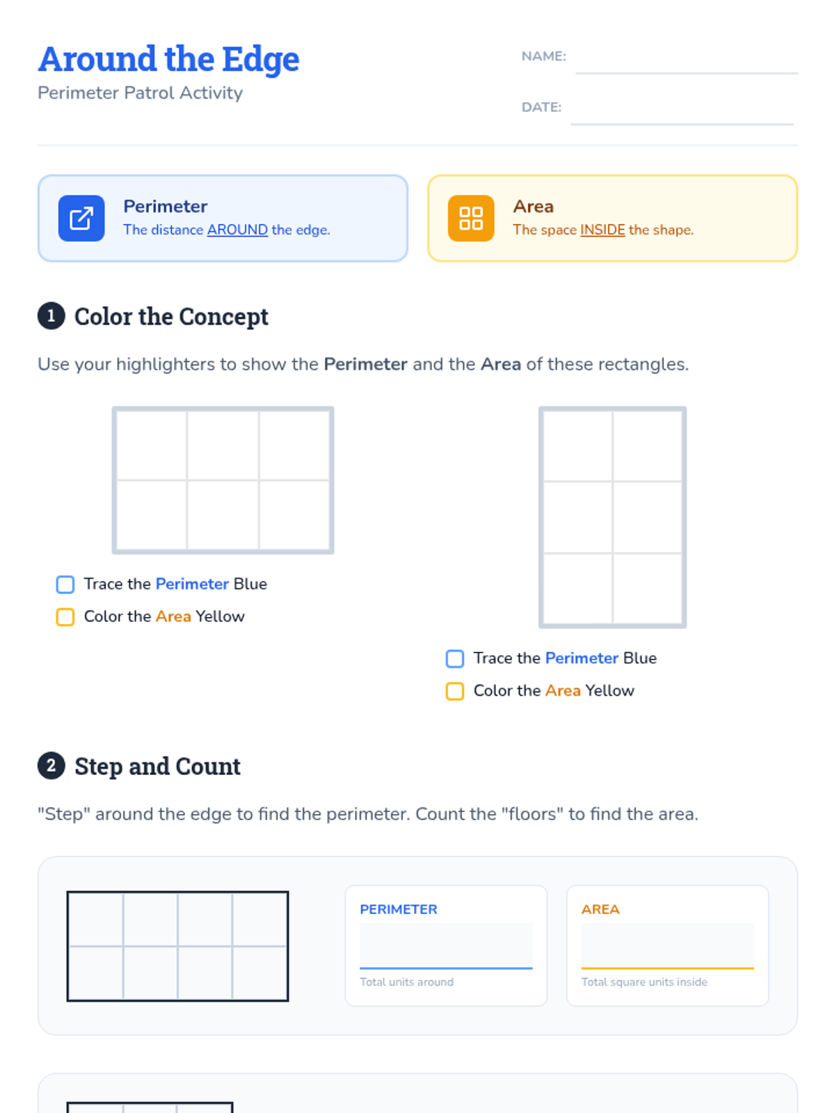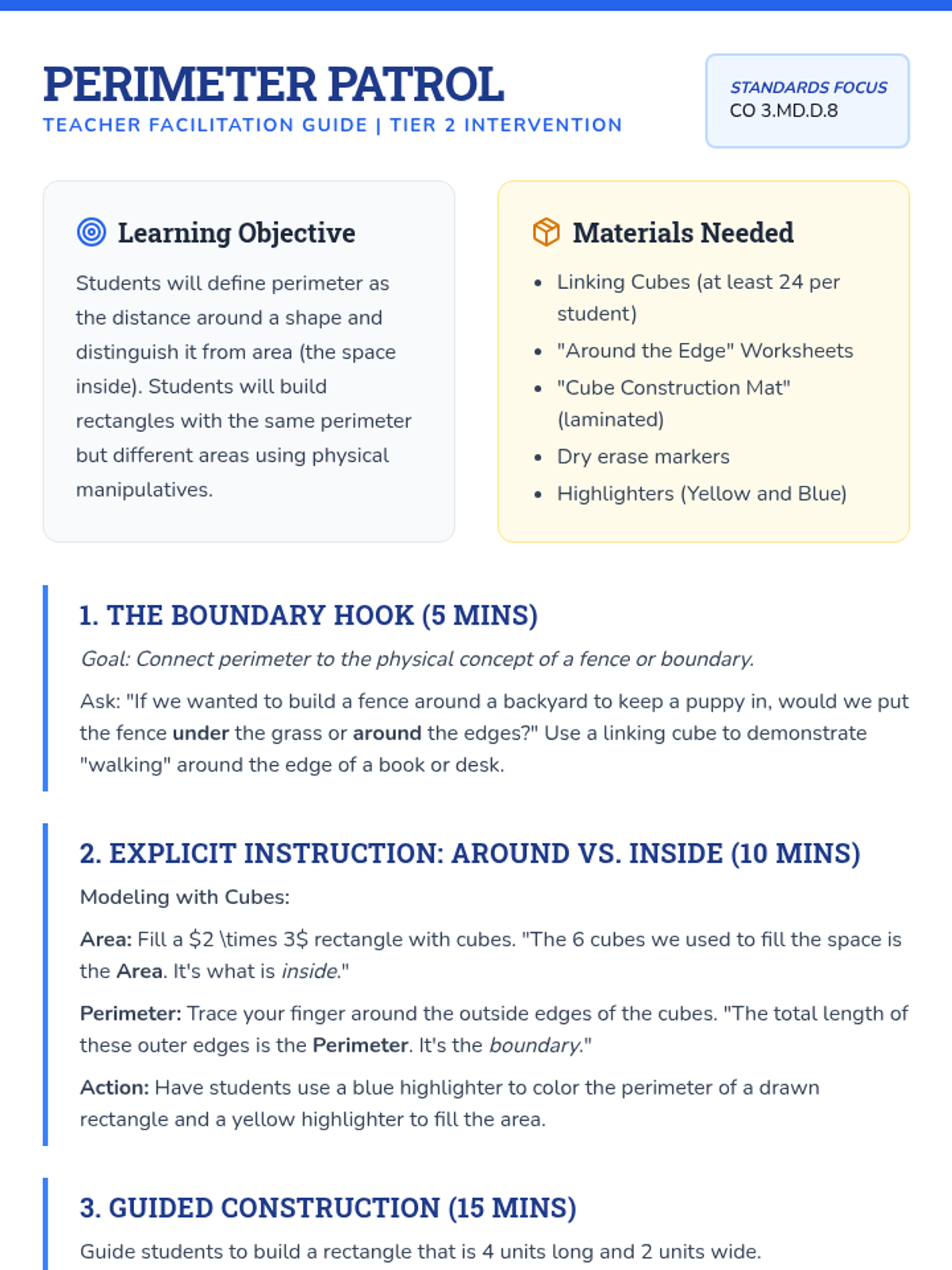A Tier 2 small group intervention lesson focused on distinguishing perimeter from area using linking cubes and scaffolded tasks. Students will explore perimeter as the distance around a shape and solve challenges involving shapes with the same perimeter but different areas.