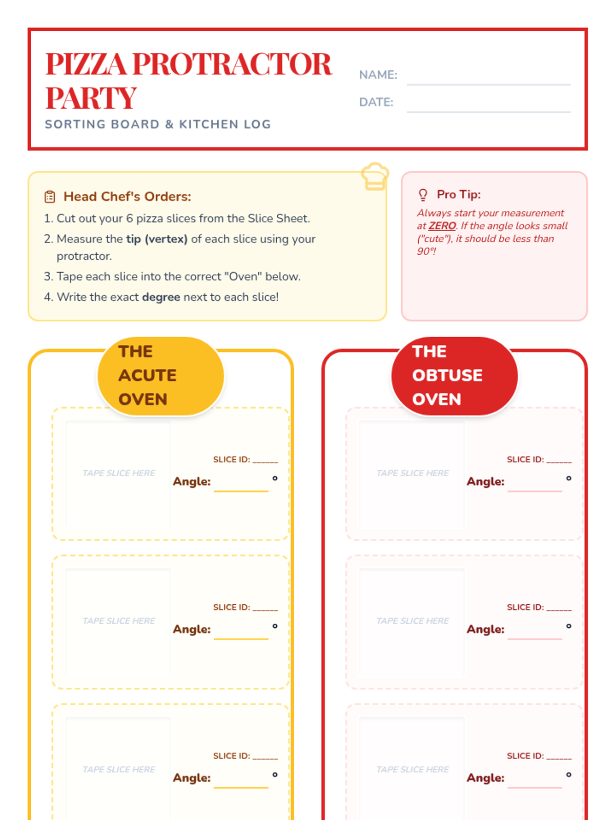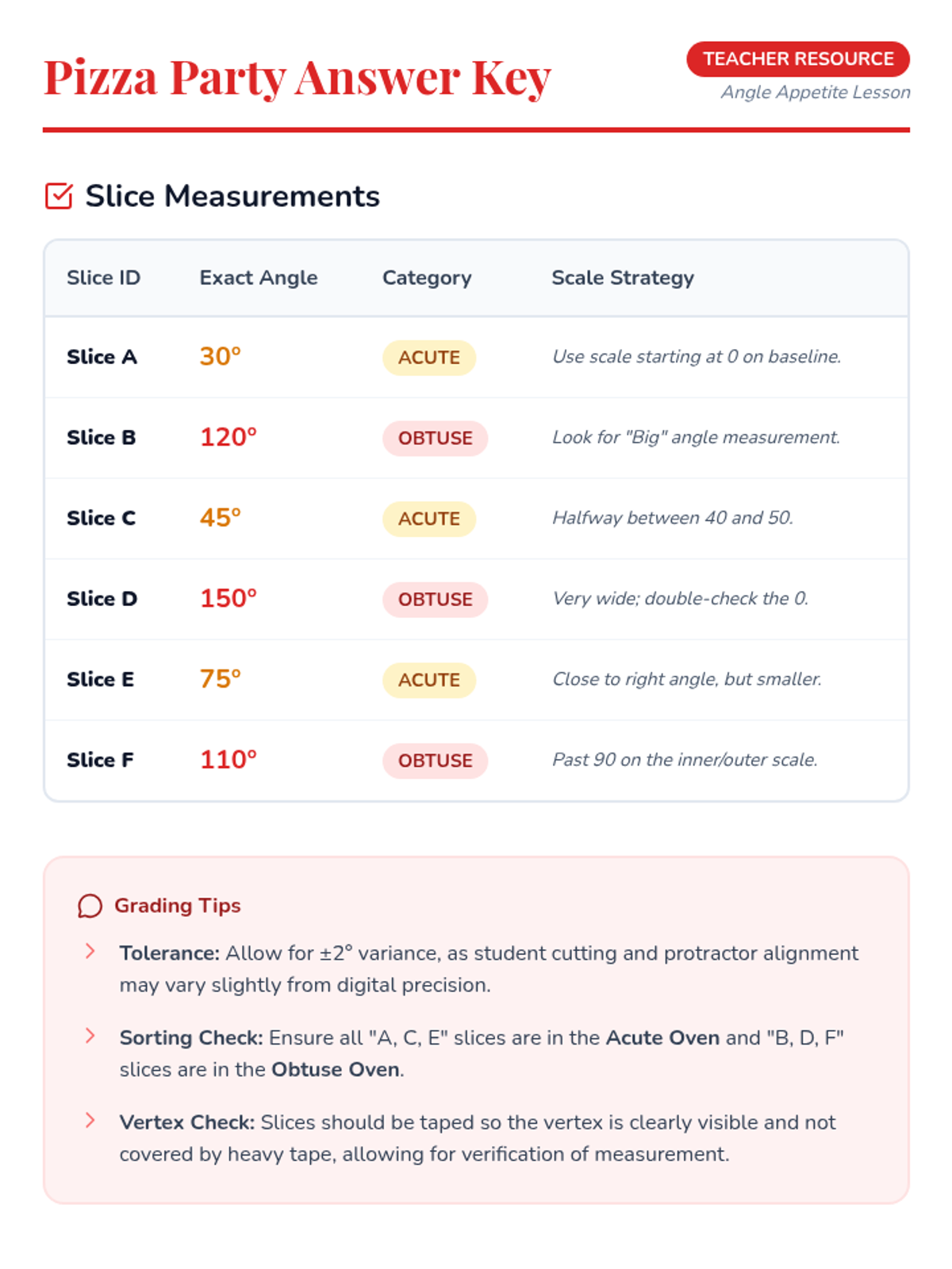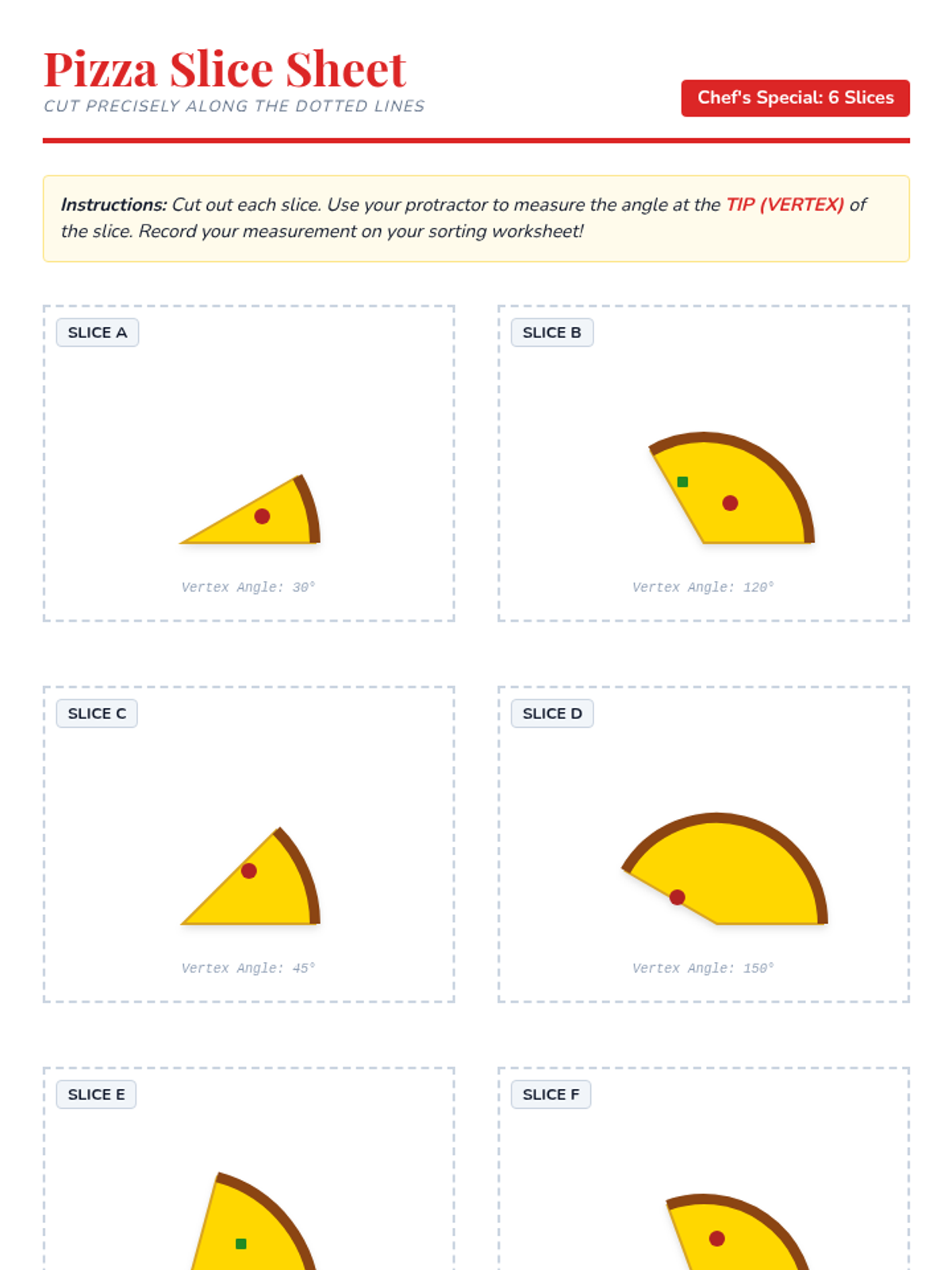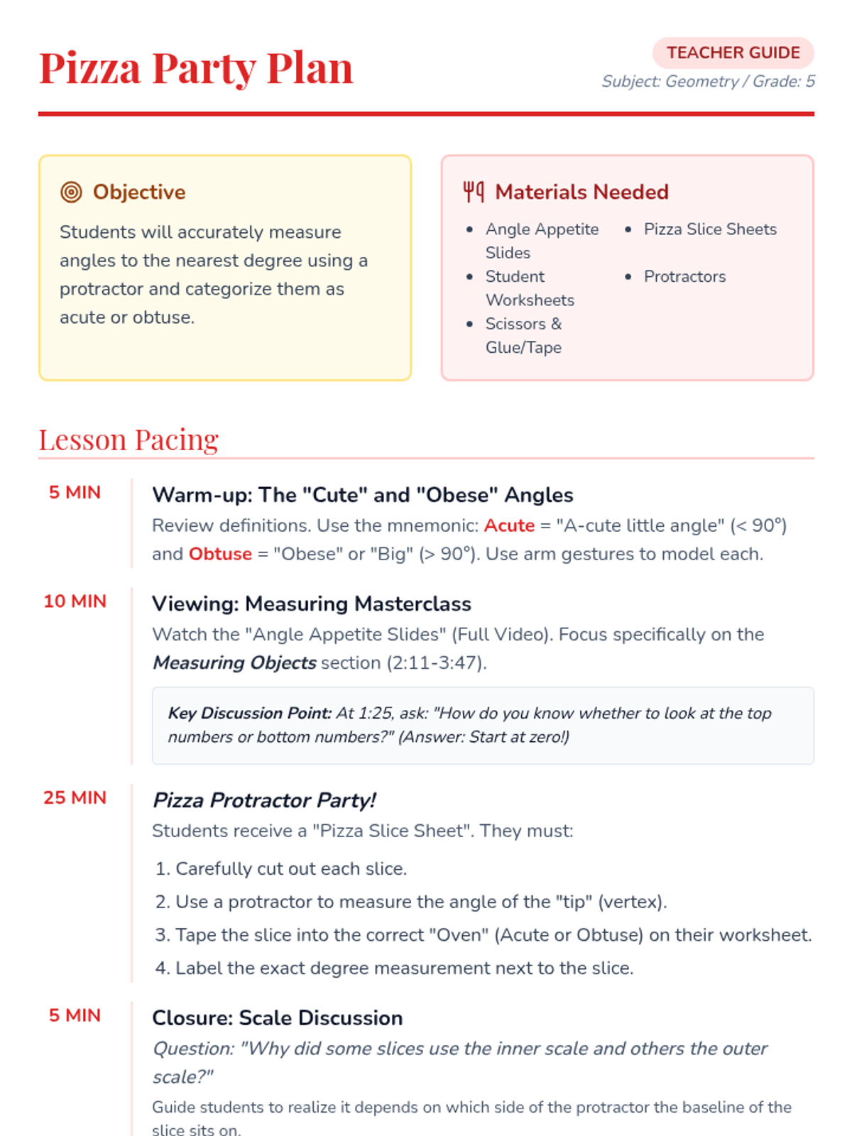 A fun, pizzeria-themed lesson where 5th graders learn to measure acute and obtuse angles using protractors. Students measure "pizza slices" and sort them into categories on a sorting worksheet.