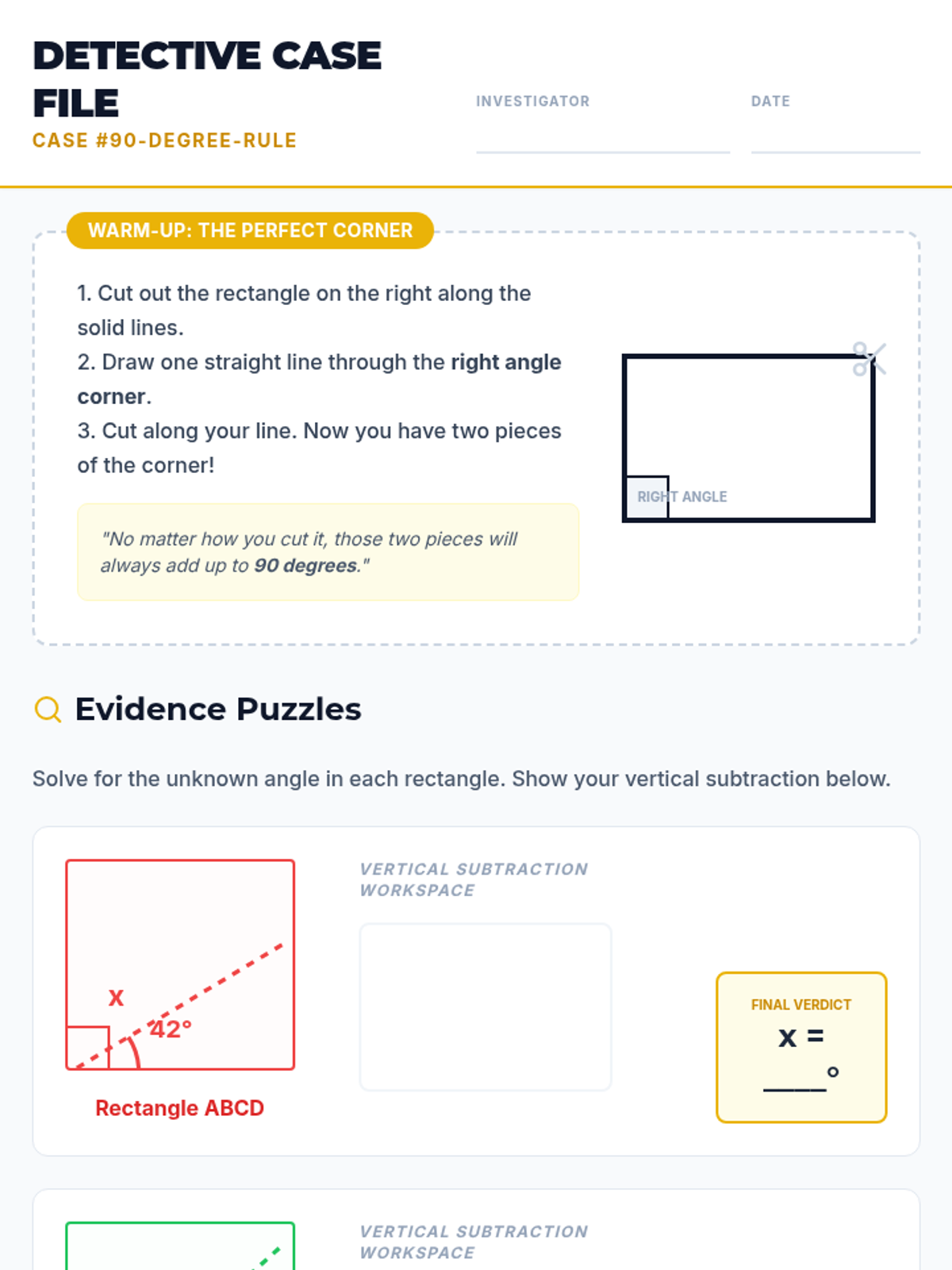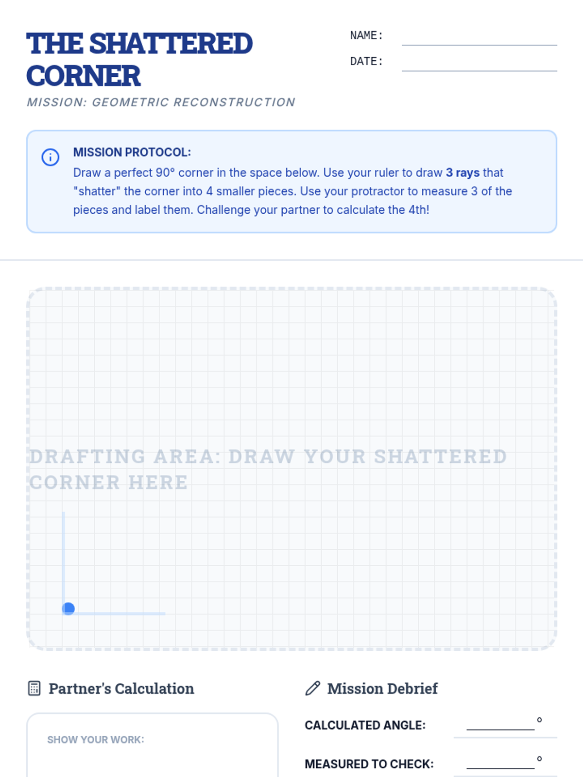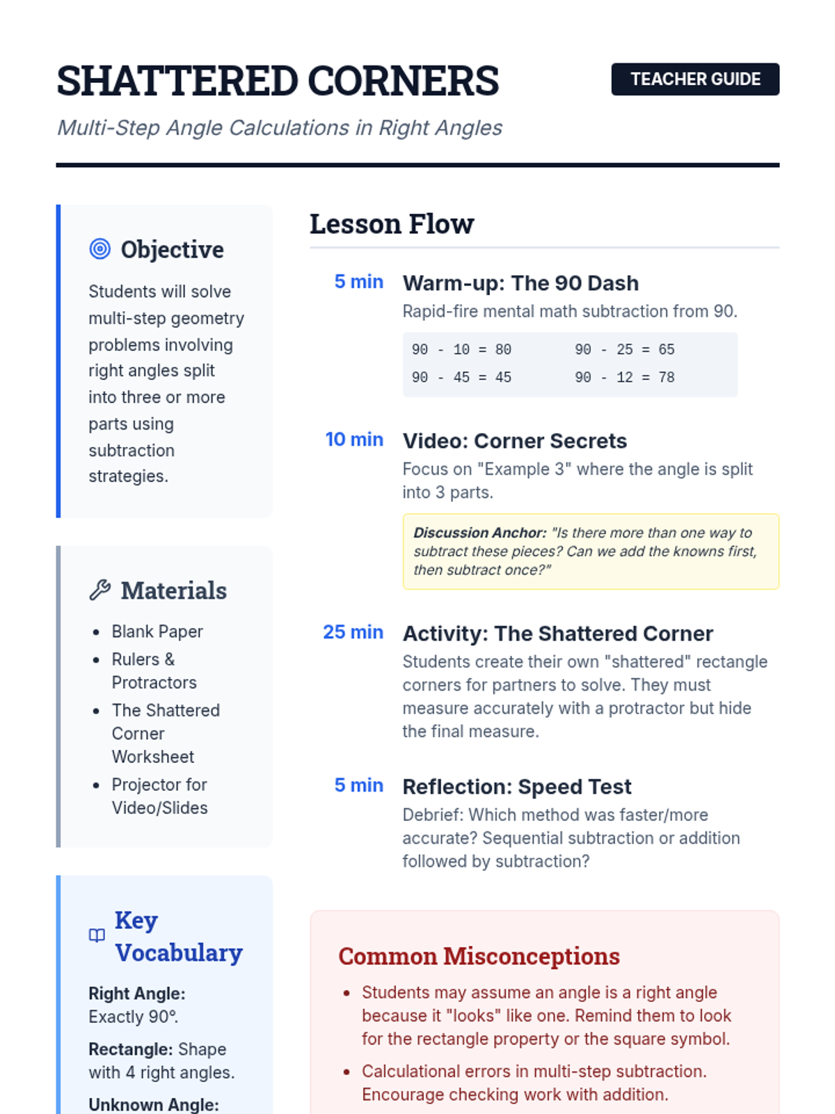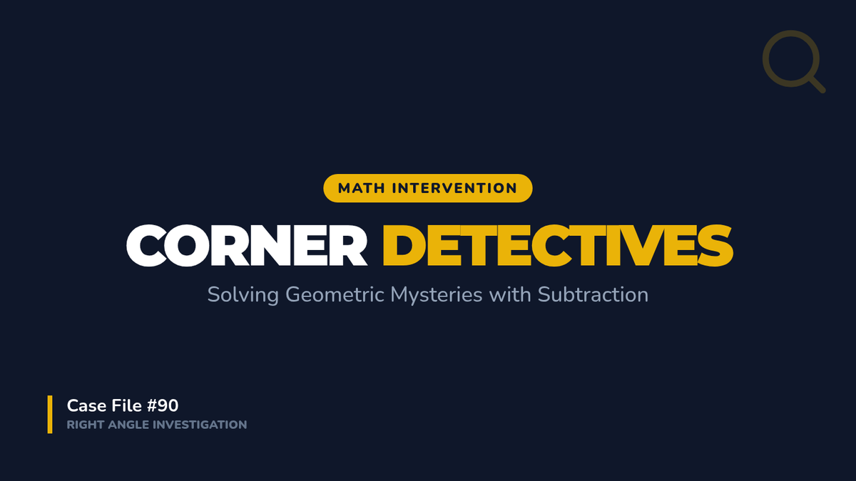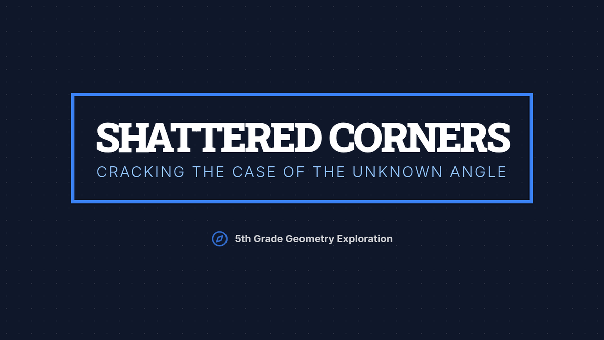 A 5th-grade geometry lesson where students calculate unknown angles within a 90-degree corner split into multiple parts, featuring a hands-on activity called 'The Shattered Corner.'