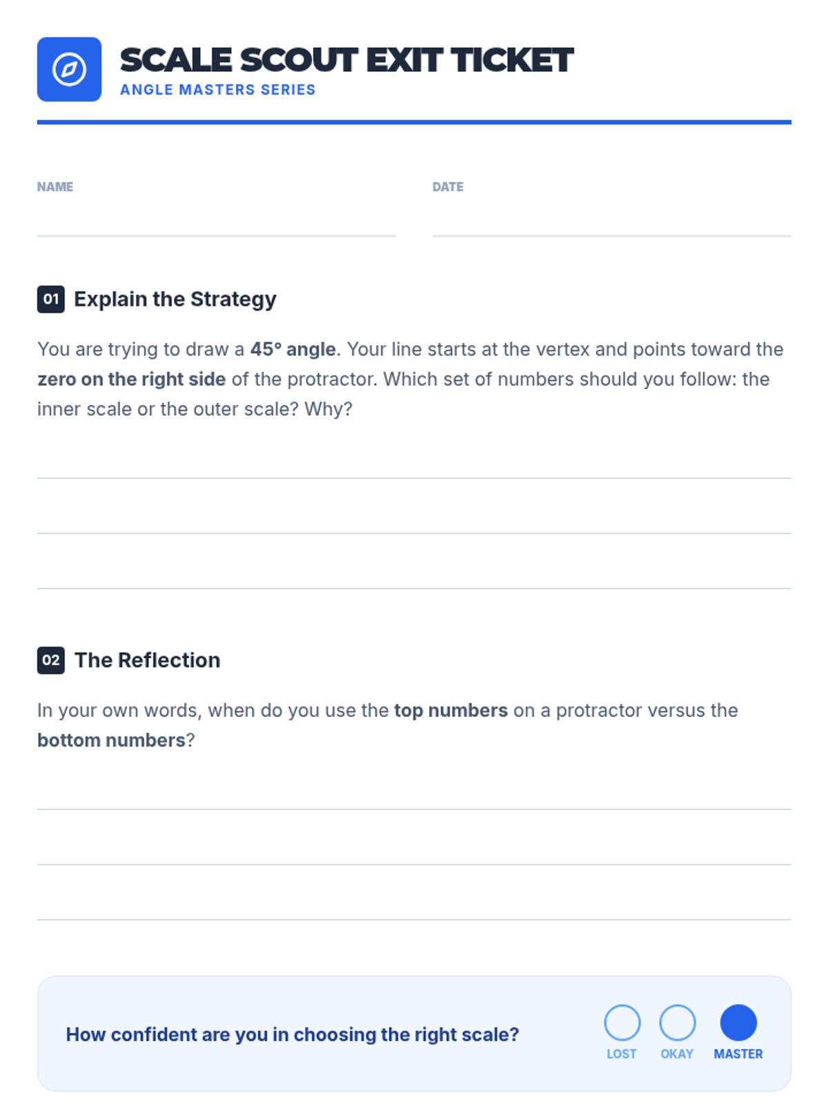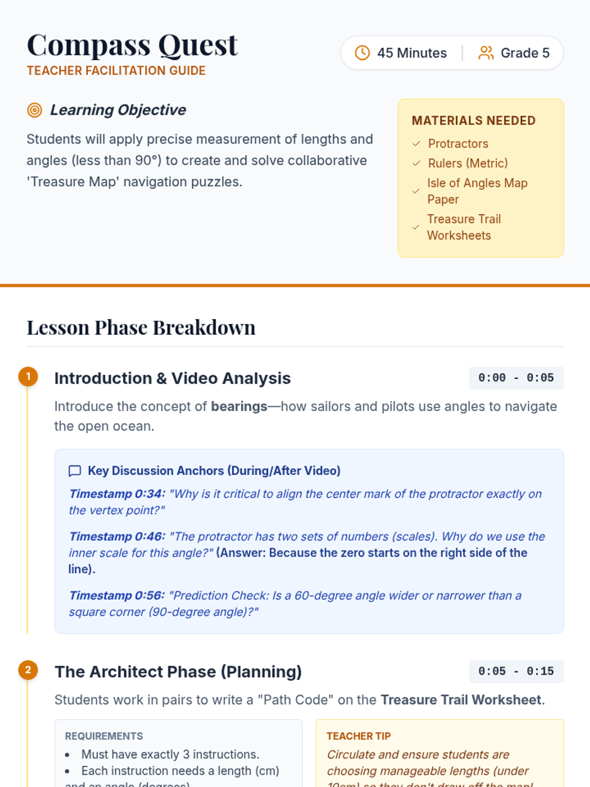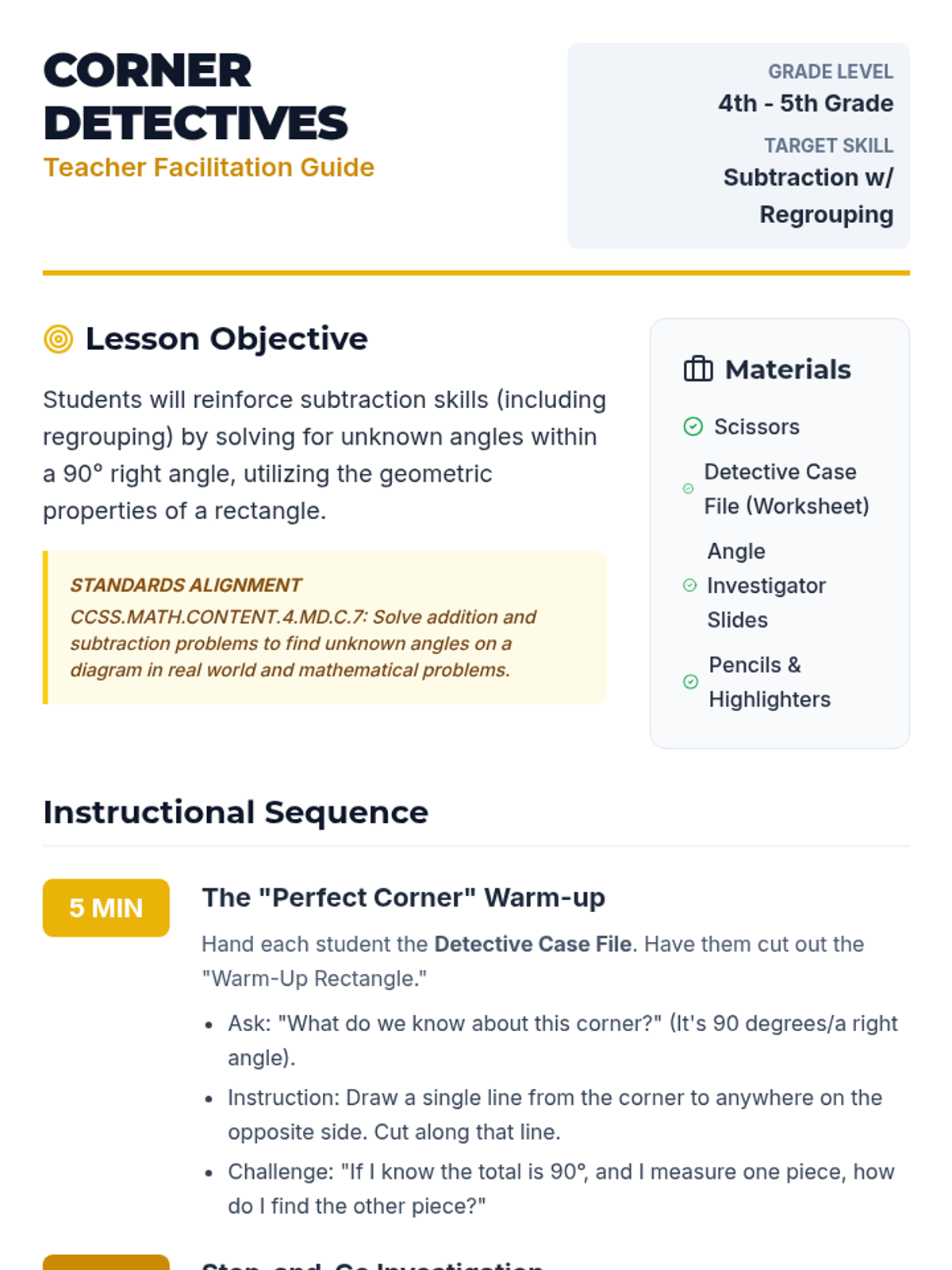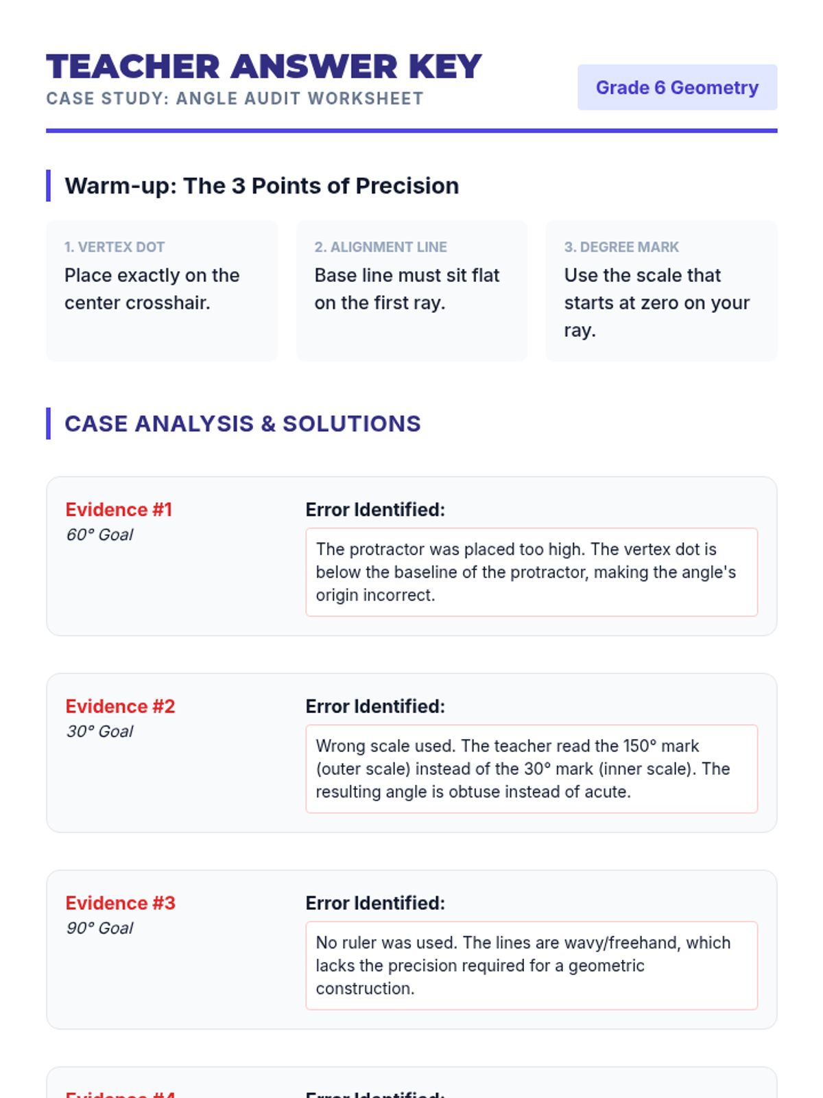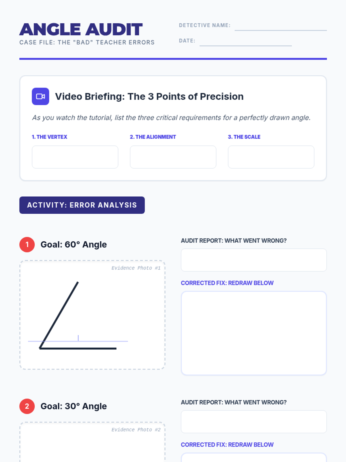 Students become 'Angle Detectives' to identify, analyze, and correct common mistakes made when using protractors and rulers to draw angles. The lesson features a video-based warm-up, a hands-on error analysis activity, and precision practice.