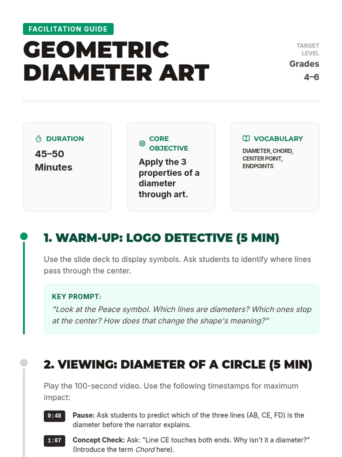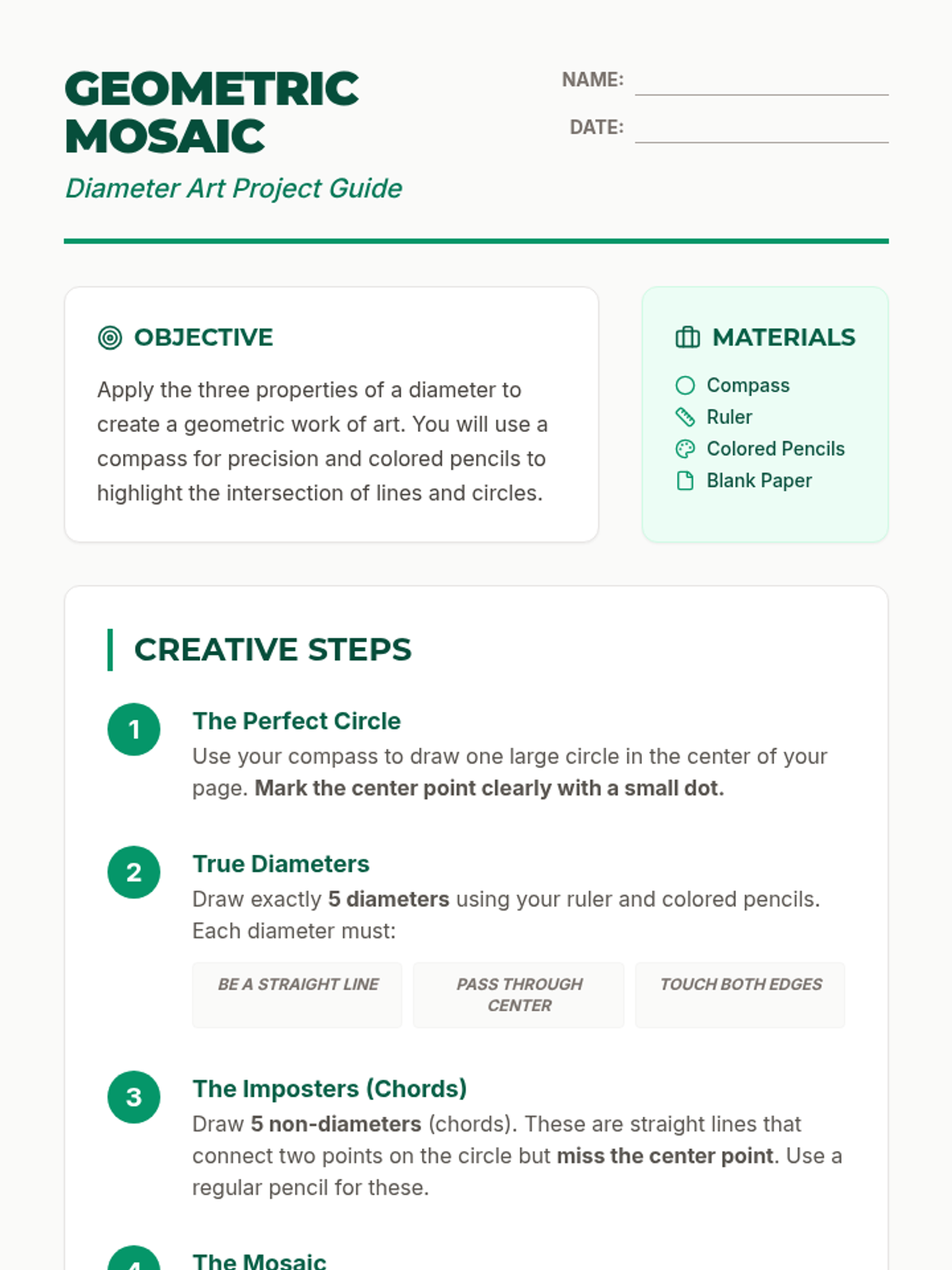 Students will learn the definition and properties of a diameter through a geometric art project, using compasses to create a colorful mosaic and distinguishing between diameters and chords.