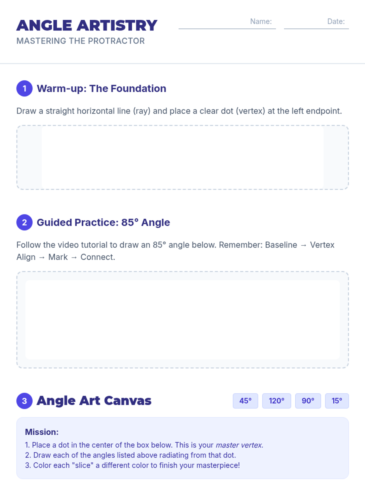 A geometry lesson for 4th and 5th graders focused on drawing precise angles using protractors to create geometric 'Angle Art'. Students follow a video tutorial to practice drawing and then apply their skills to a creative starburst design.