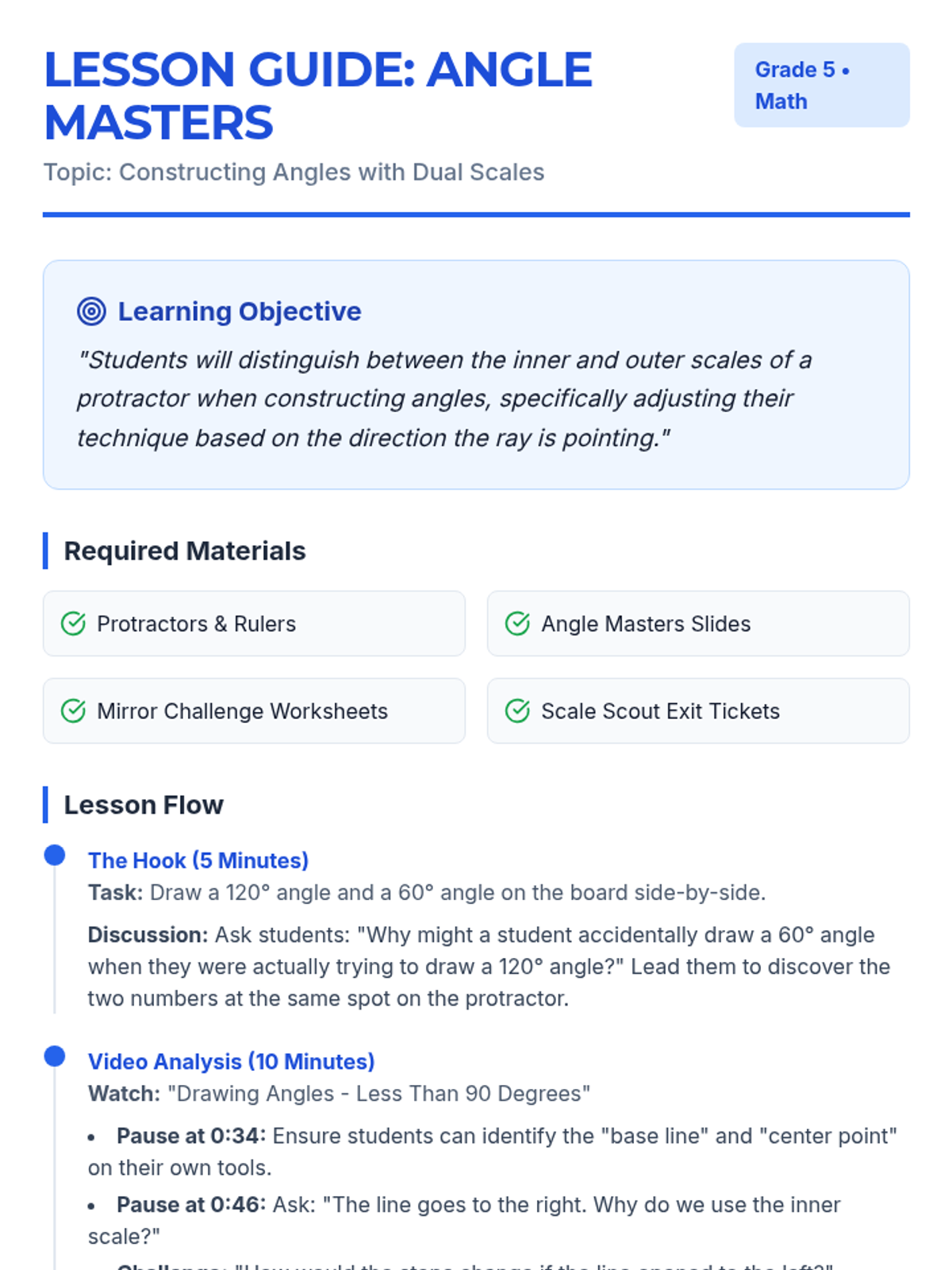 A remediation-focused lesson designed to help 5th-grade students master the protractor. Students will identify common errors like reading the wrong scale and improper alignment through a 'Scale Detective' activity and video-based instruction.