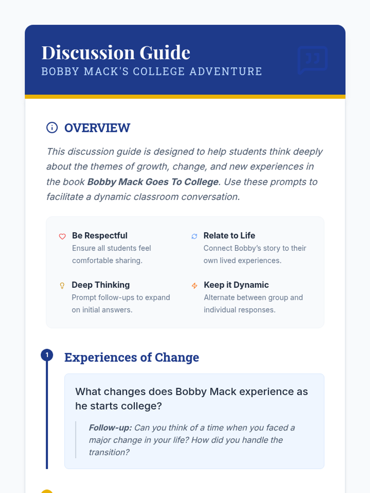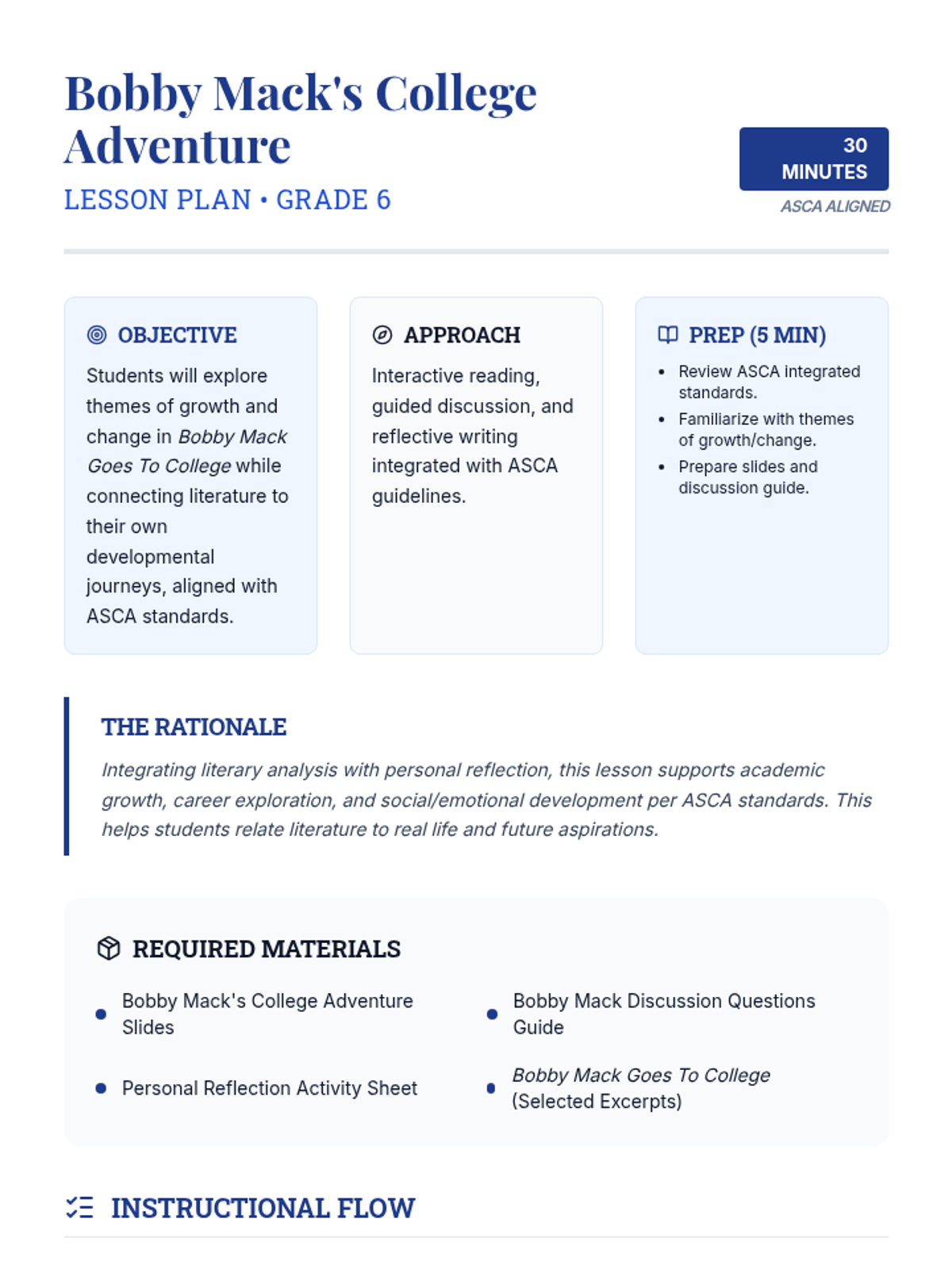 A 30-minute 6th-grade lesson exploring themes of growth, change, and future aspirations through the book 'Bobby Mack Goes To College', aligned with ASCA standards.