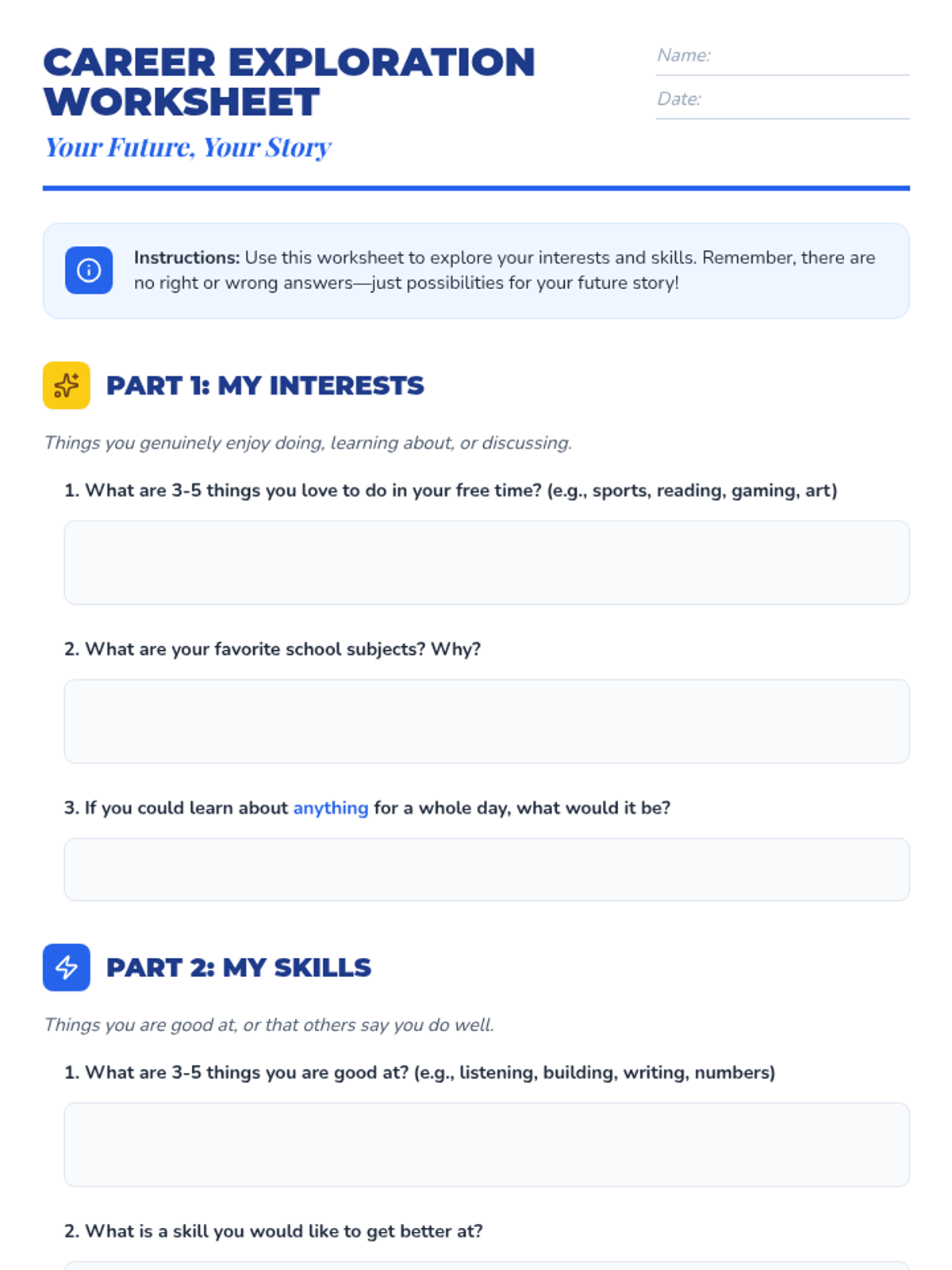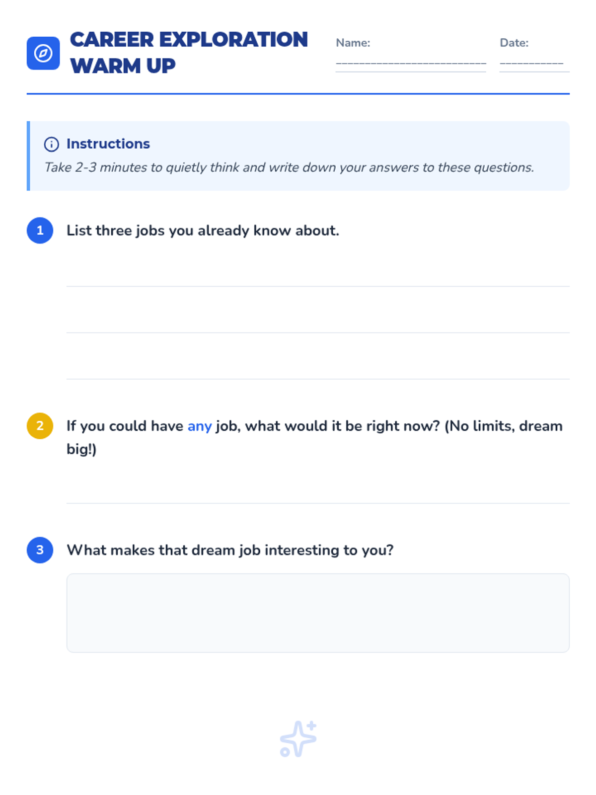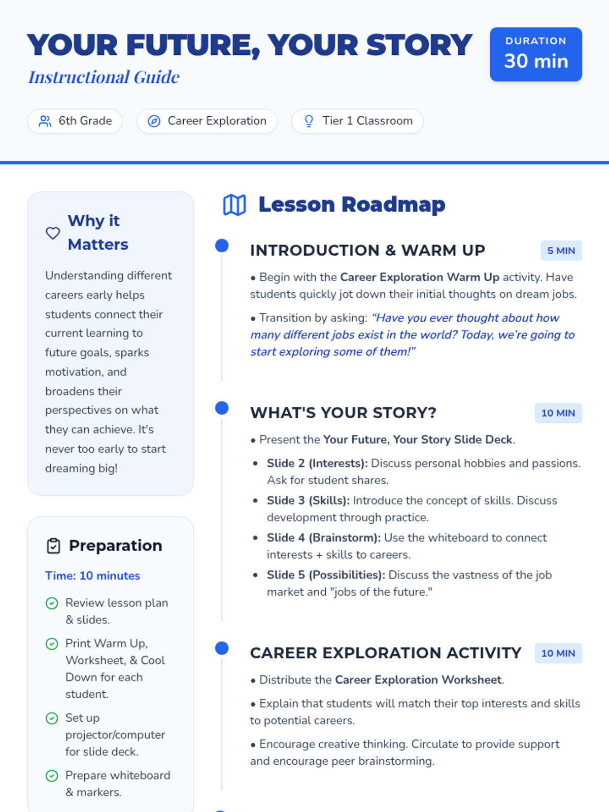 A 30-minute career exploration lesson for 6th graders to identify interests and skills and connect them to future possibilities.