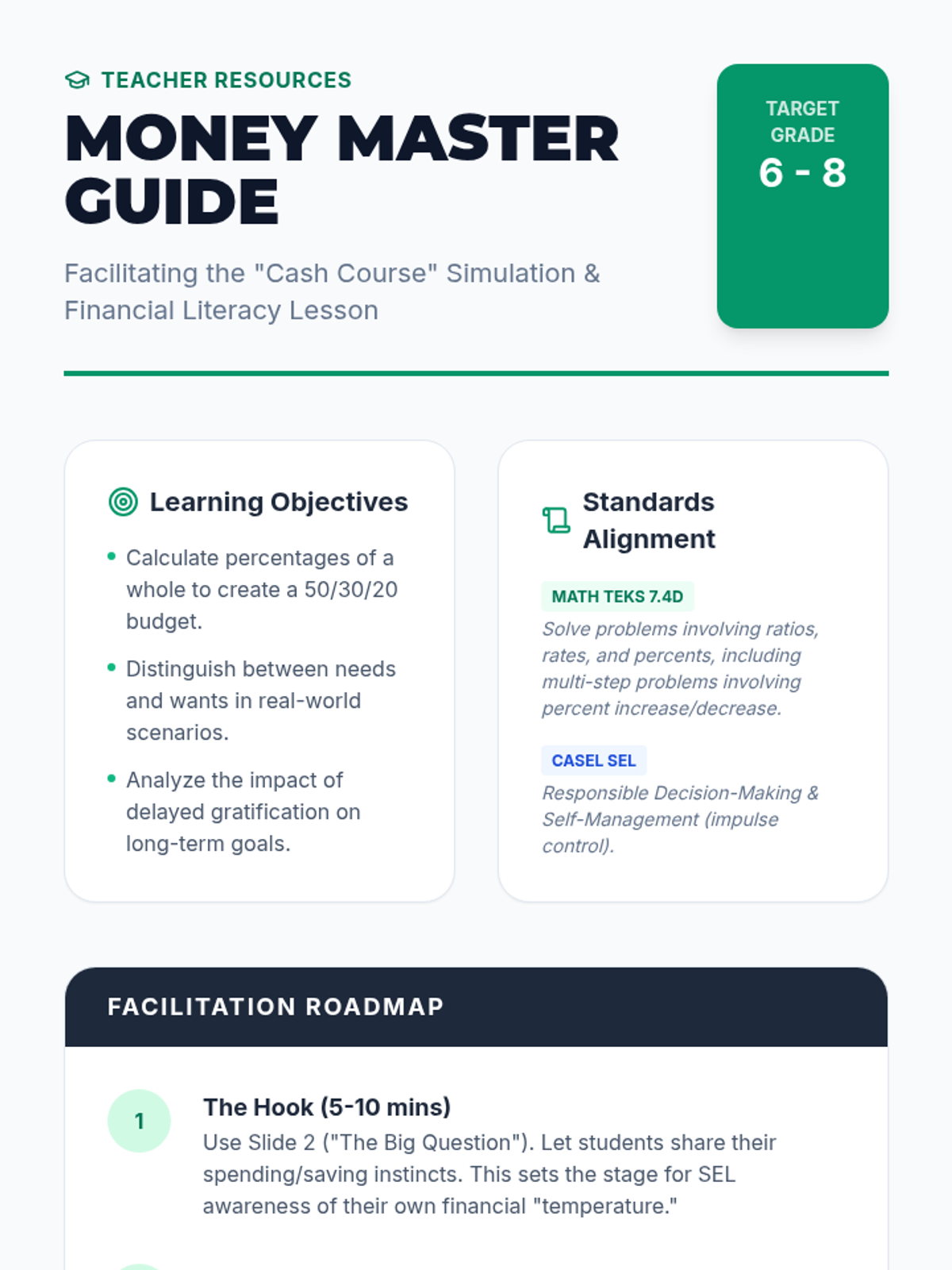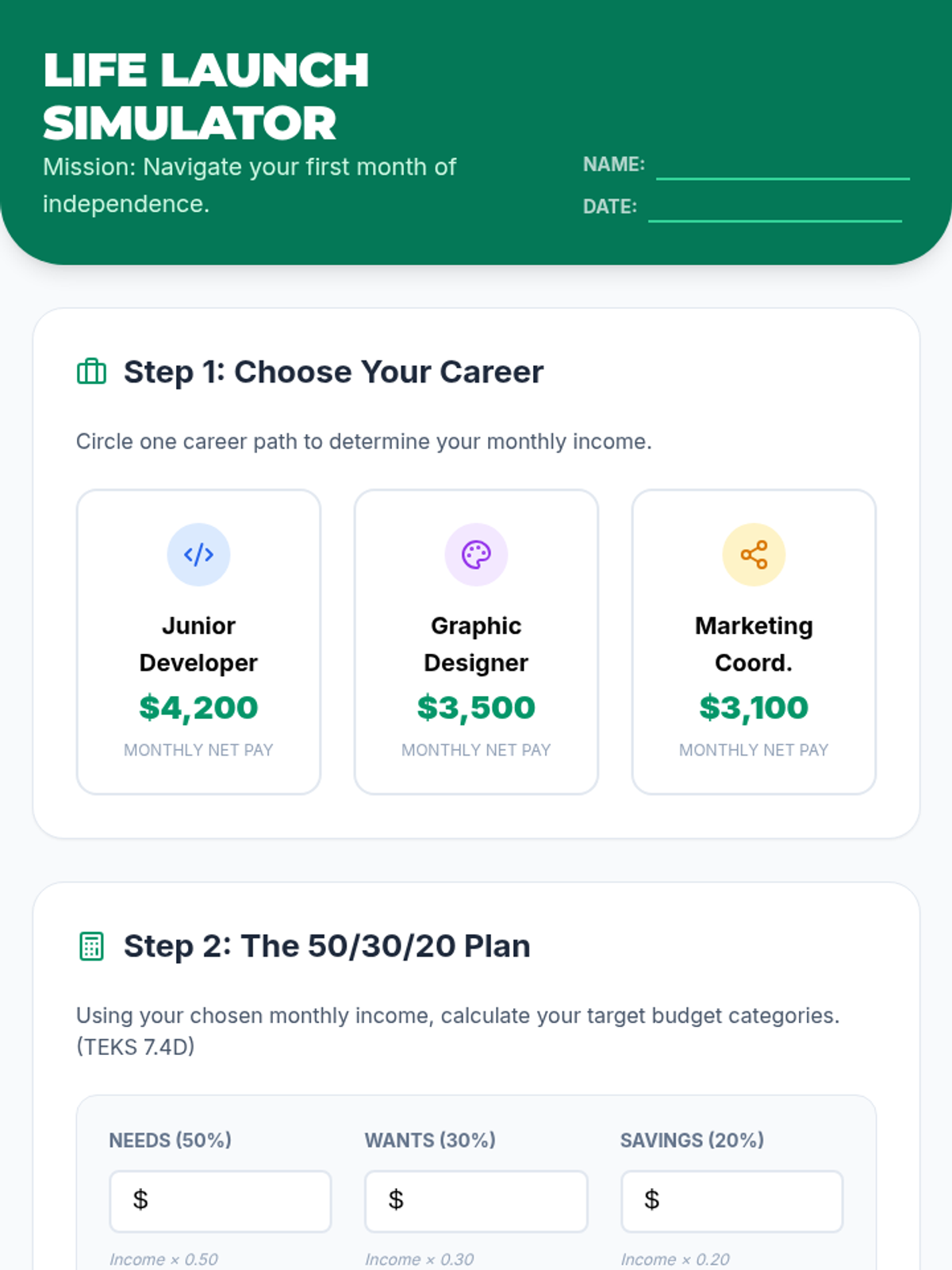 A comprehensive middle school lesson on financial literacy that blends 7th-grade proportional reasoning with SEL skills like delayed gratification and responsible decision-making. Students navigate a life simulation where they must budget a monthly income across needs, wants, and savings goals.