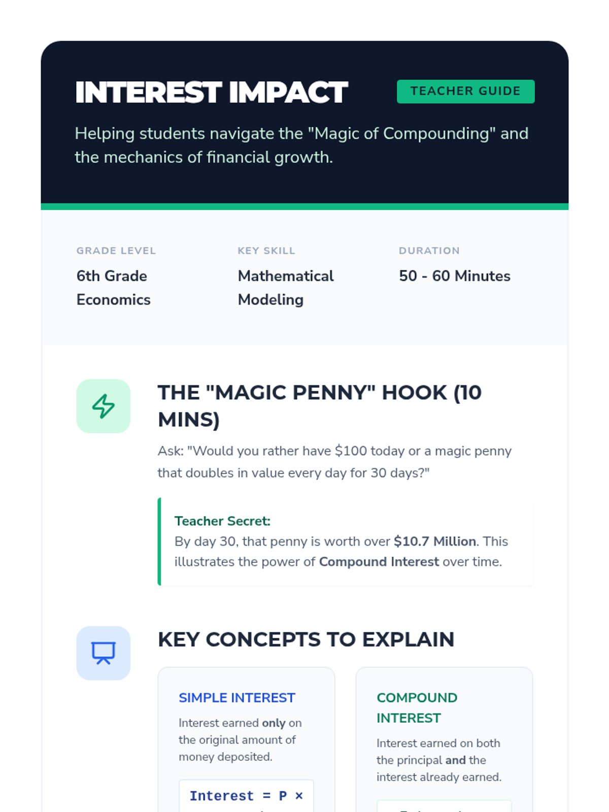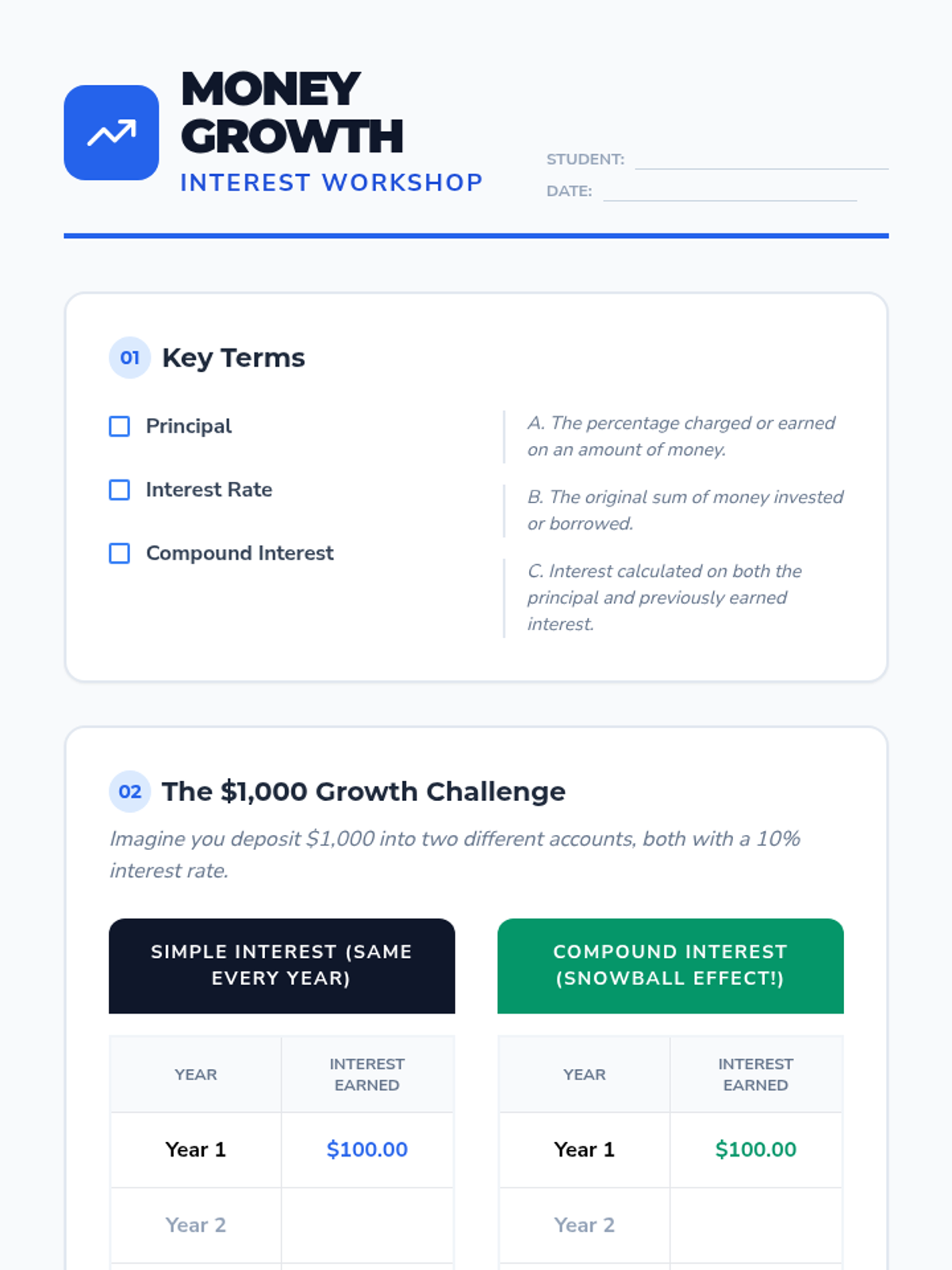 Through a workshop model, students learn the mathematical difference between simple and compound interest, calculating returns on hypothetical savings to visualize long-term financial growth.